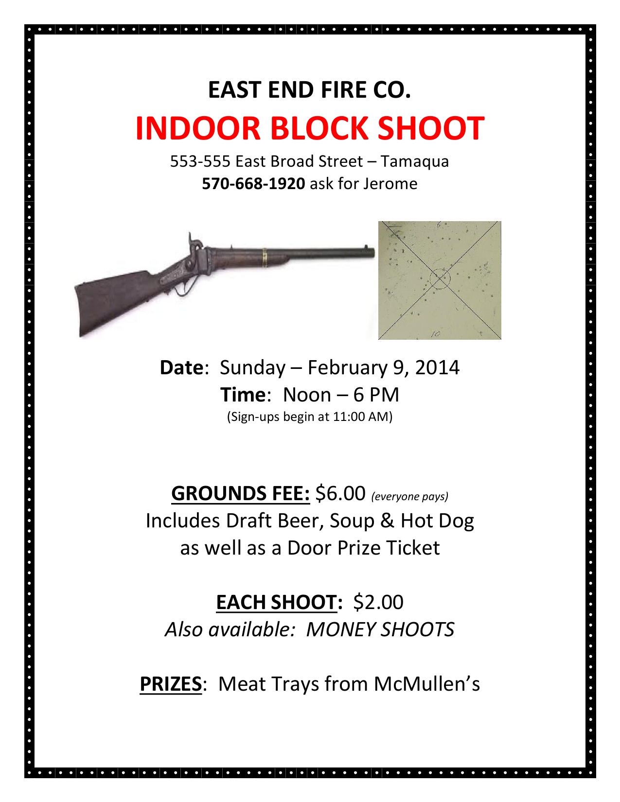 Members of the East End Fire Company are holding a block shoot on February 9, 2014 from 12 PM to 6 PM. Signups begins at 11 AM. They are located at 553-555 East Broad Street in Tamaqua. Call Jerome at (570) 668-1920 for more information. Ground fees (everyone pays) are $6; which includes draft beer, soup & hot dog, as well as a door prize ticket. Each shoot is only $2. Money shoots are also available. Prizes are meat trays from McMullen’s Market.