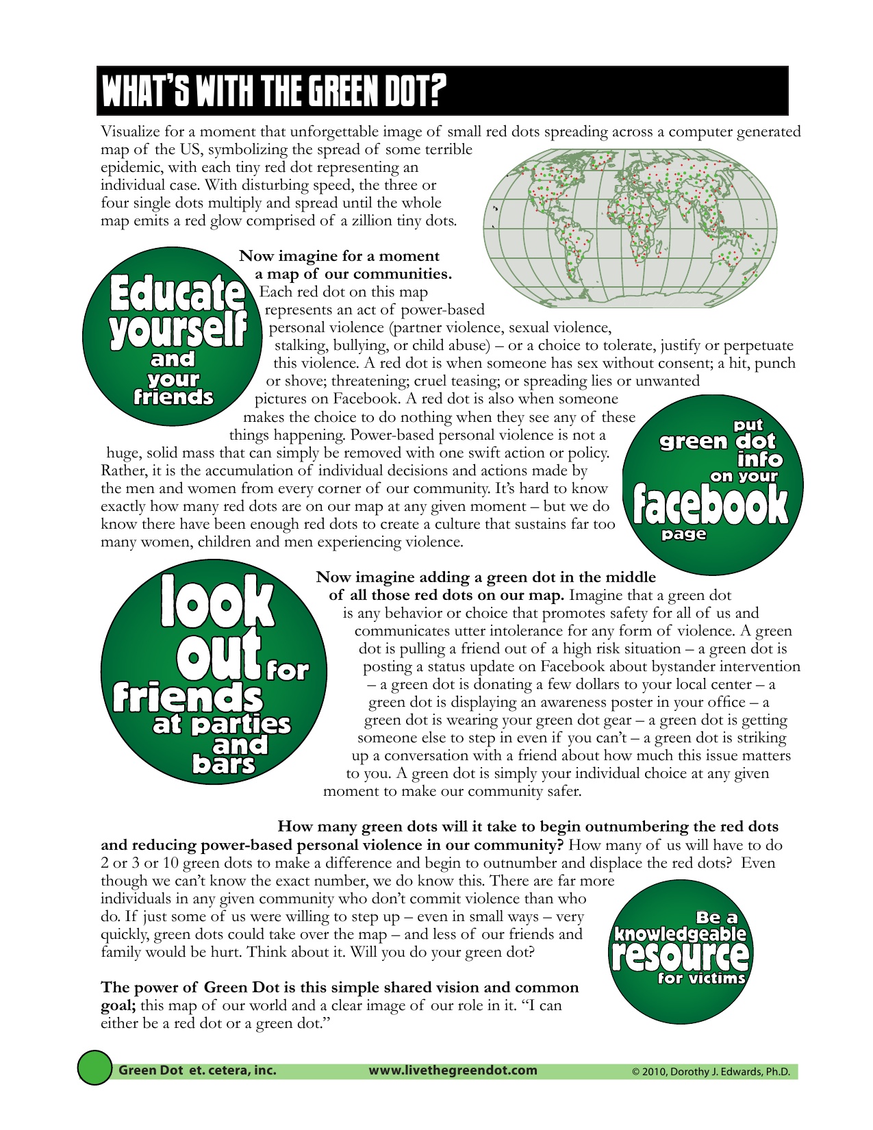 How many of us will have to do 2 or 3 or 10 green dots to make a difference and begin to outnumber and displace the red dots? Even though we can’t know the exact number, we do know this. There are far more individuals in any given community who don’t commit violence than who do. If just some of us were willing to step up – even in small ways – very quickly, green dots could take over the map – and less of our friends and family would be hurt. Think about it. Will you do your green dot?