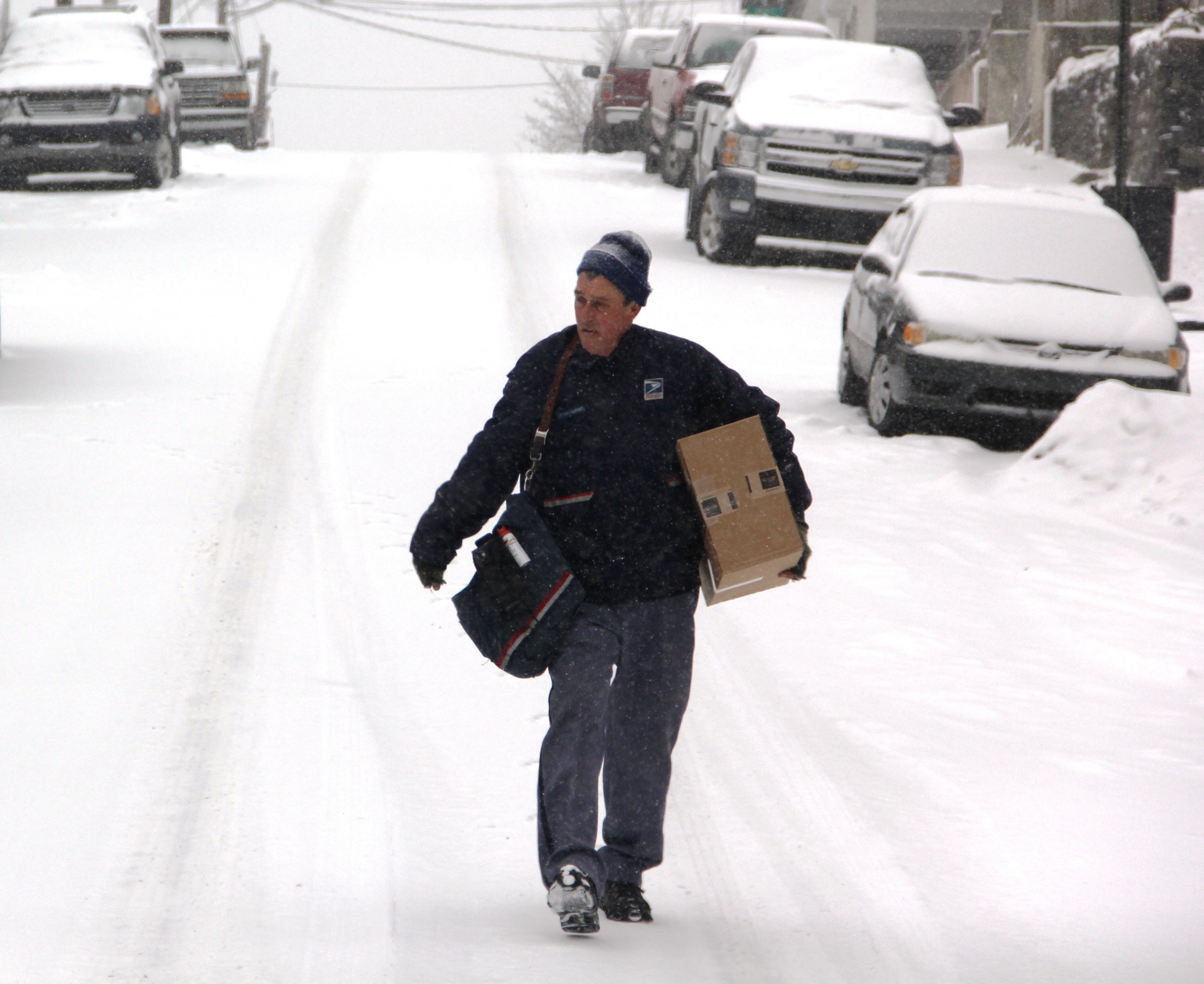 United States letter carrier Paul Baker walks carefully down Clay Street toward Washington Street during today’s (Jan. 21, 2014) snowfall in Tamaqua.