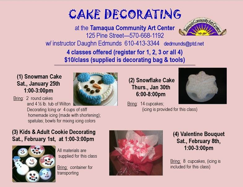 Four cake and cookie decorating classes are being offered at the Tamaqua Community Arts Center. Register for 1, 2, 3 or all 4 classes. Cost is $10/class; with decorating bag and tools provided. For more information, contact instructor Daughn Edmunds at (610) 413-3344 or via email at dedmunds@ptd.net. The center is located at 125 Pine Street in Tamaqua.