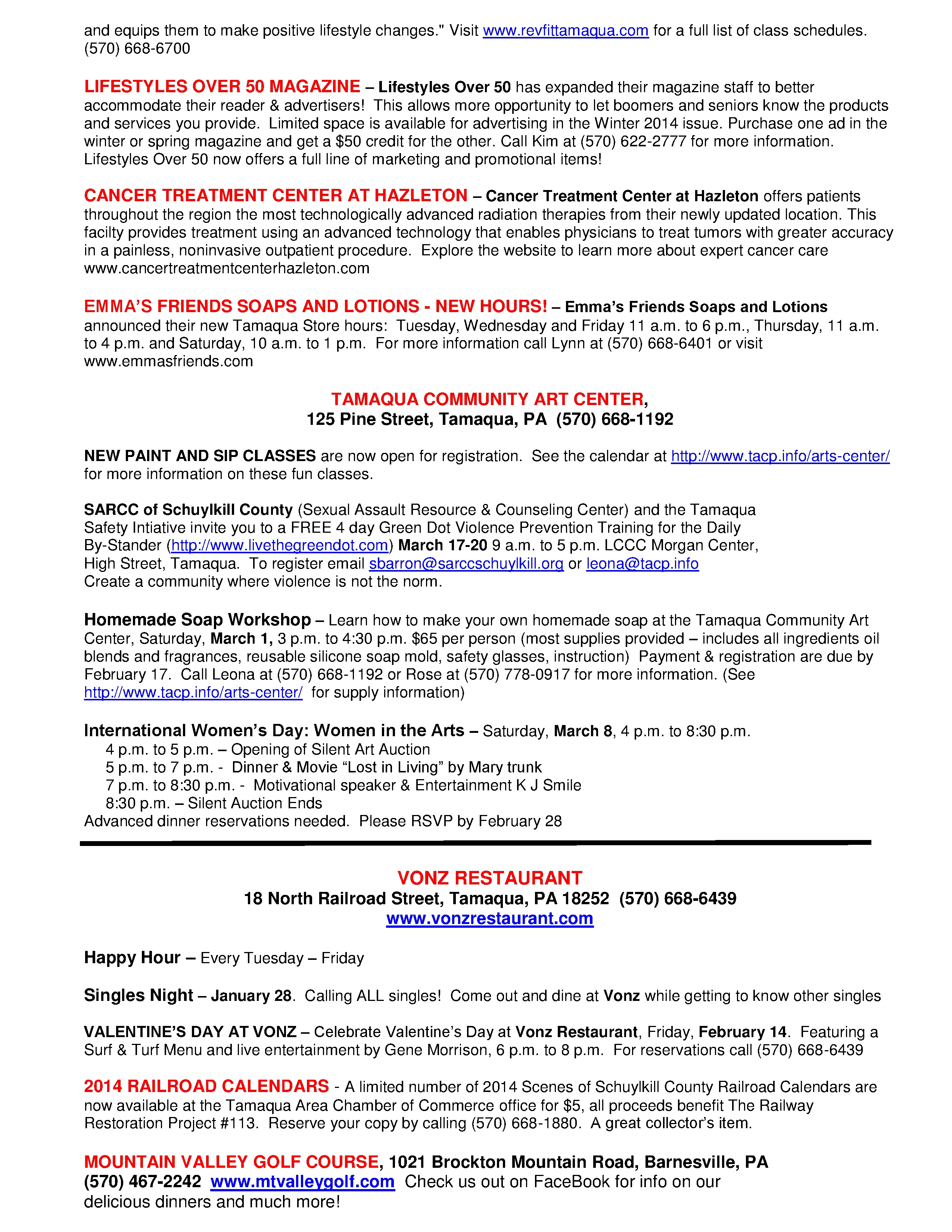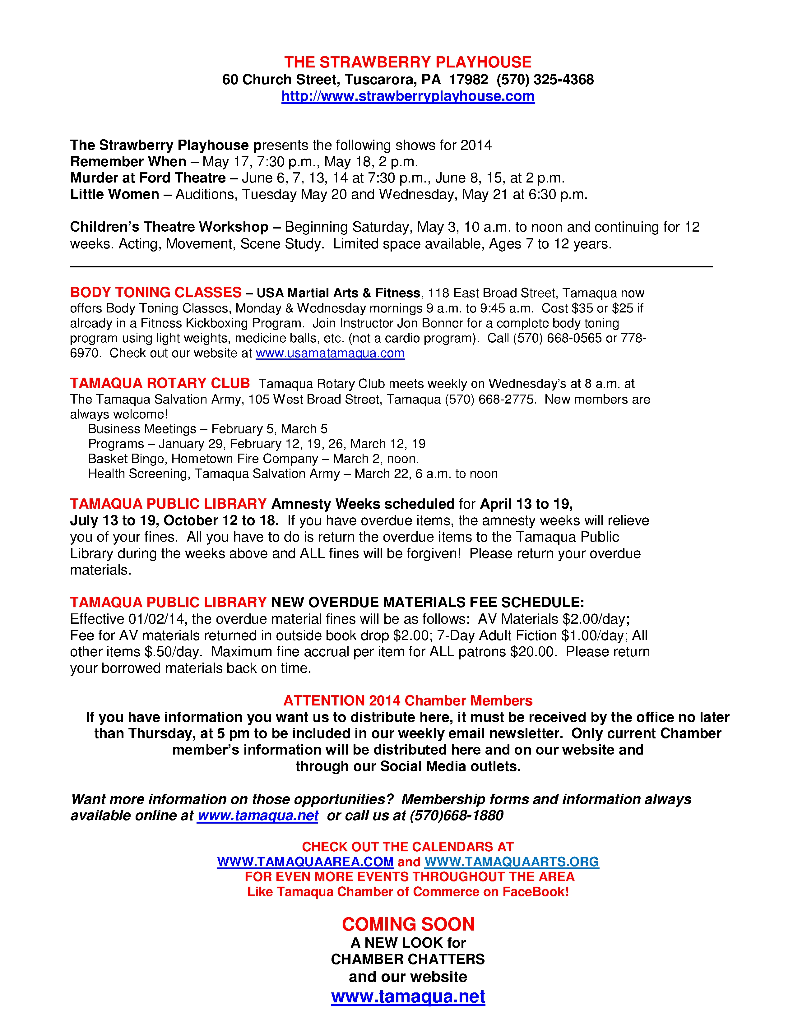 1-24-2014, Tamaqua Chamber of Commerce, Chamber Chatters