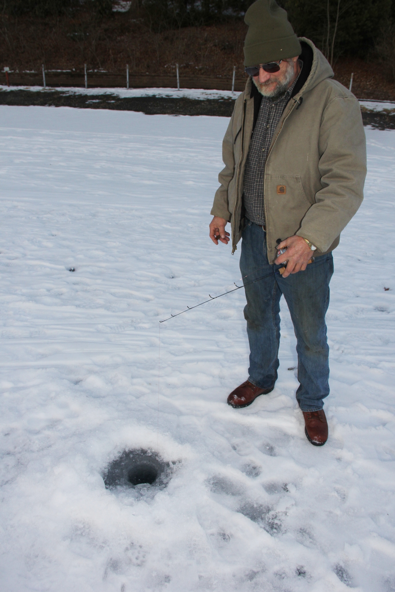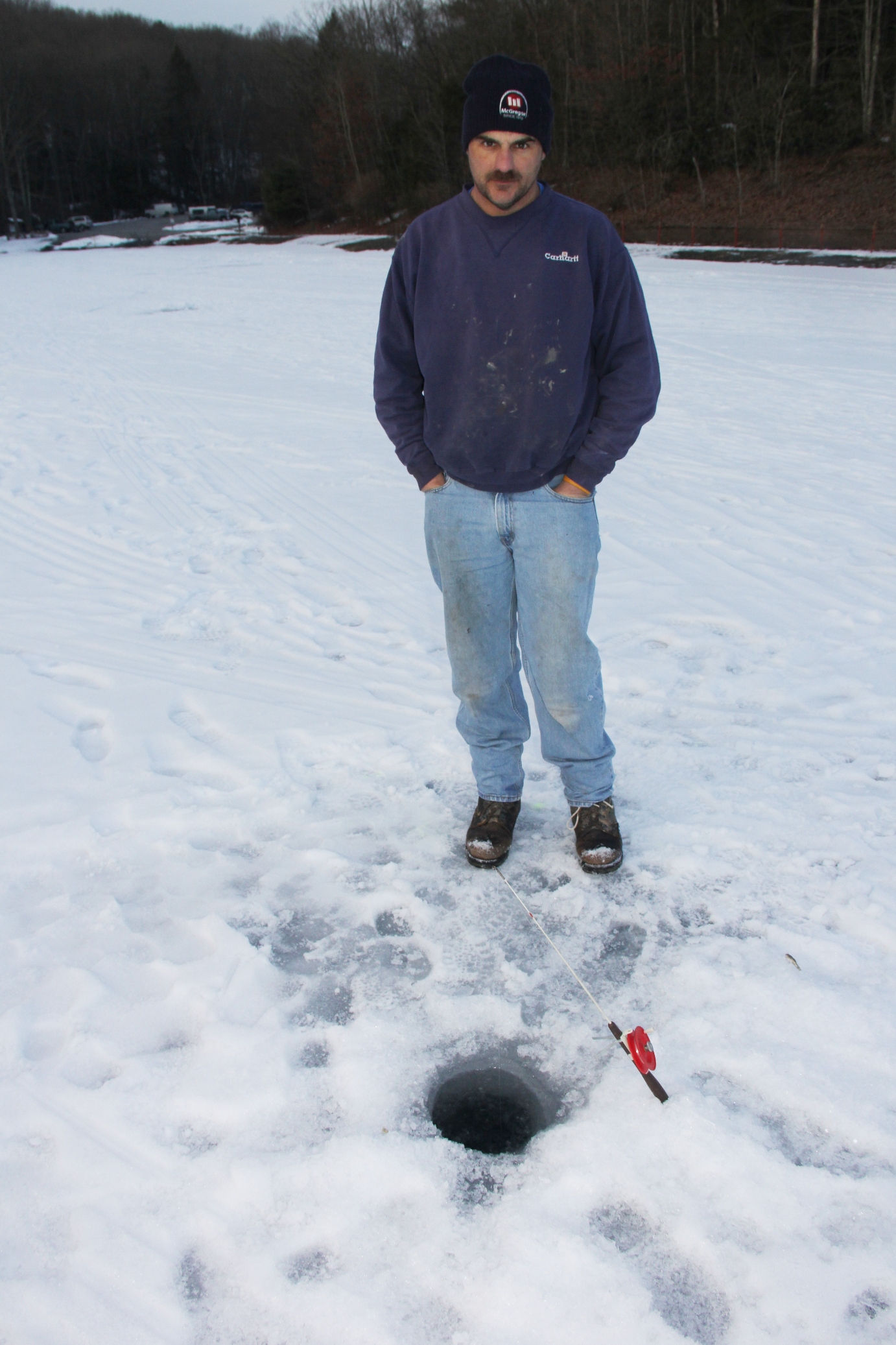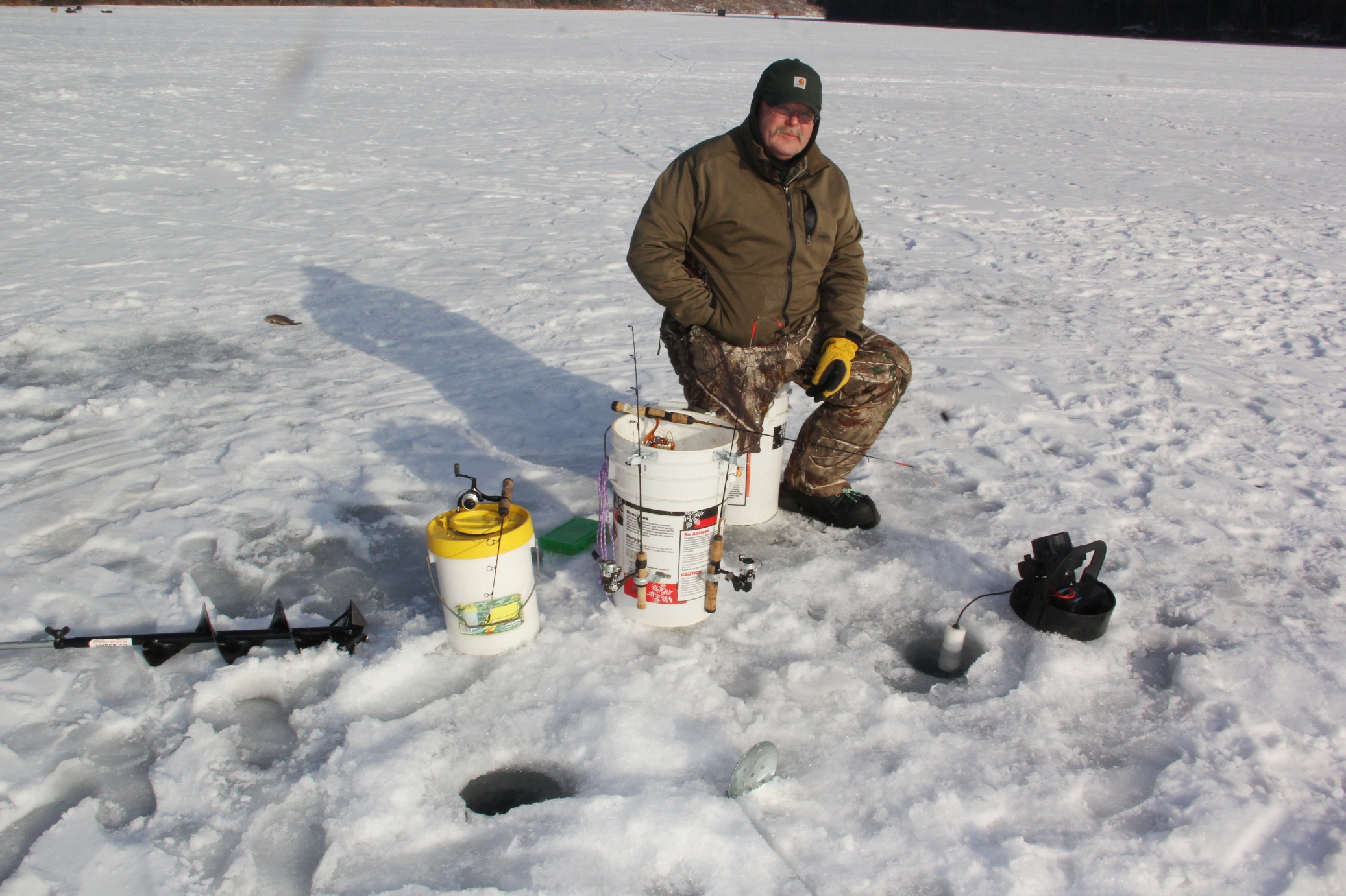 Ice fishermen are taking advantage of slightly warmer temperatures as they flock to the ice-covered lake of the Tuscarora State Park in Barnesville. Below freezing temperatures over the past weeks have resulted in an impressive 13-inches of ice on top of lake.