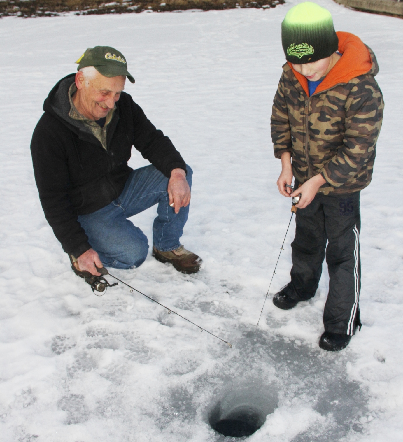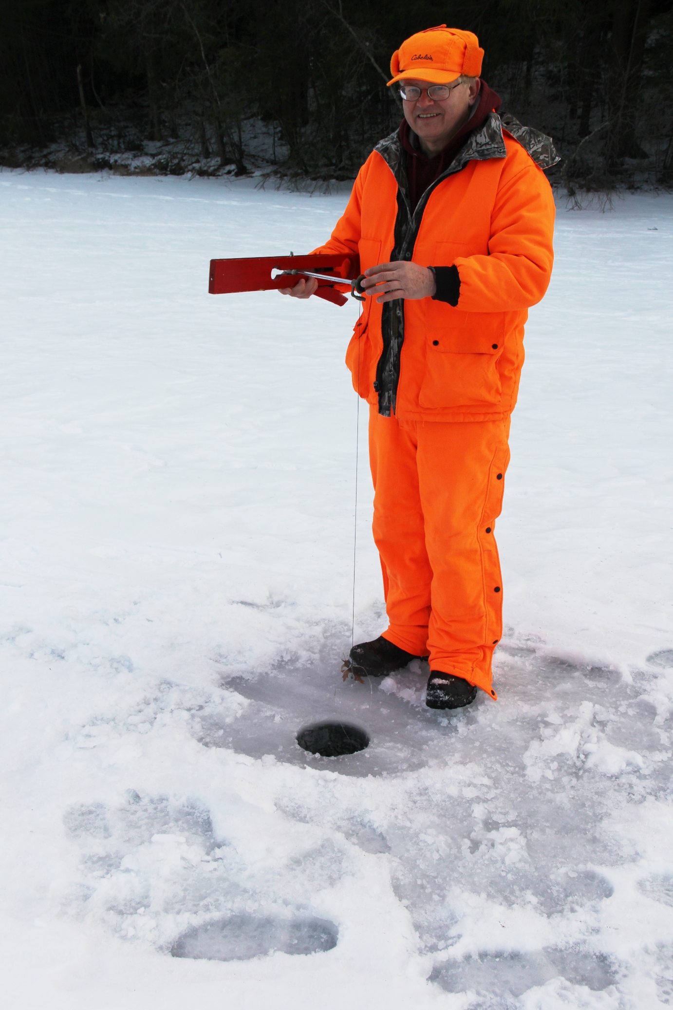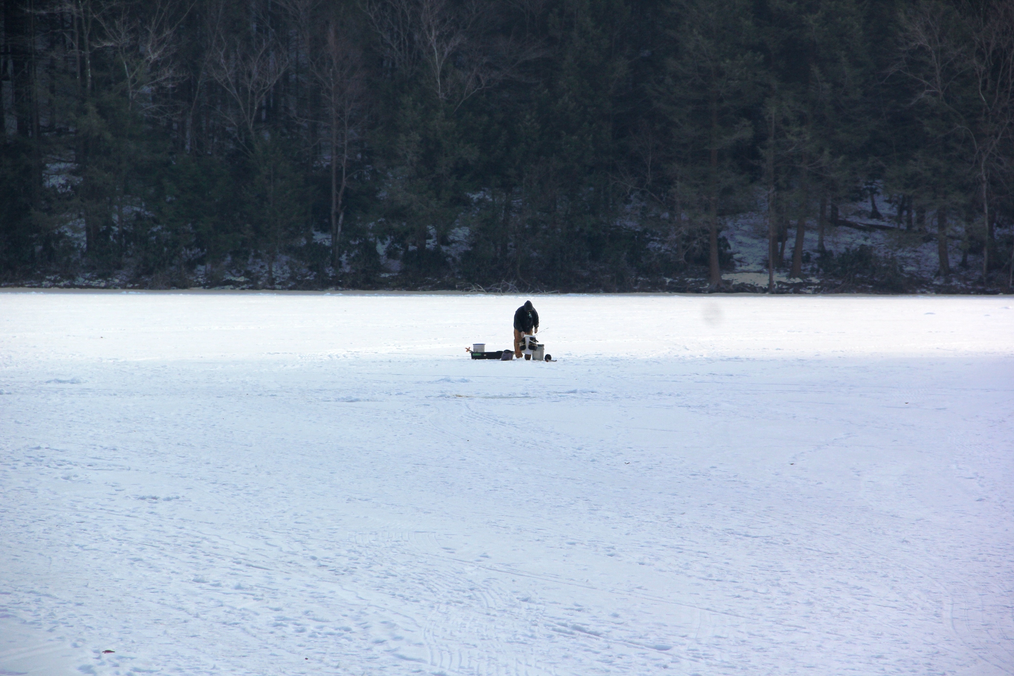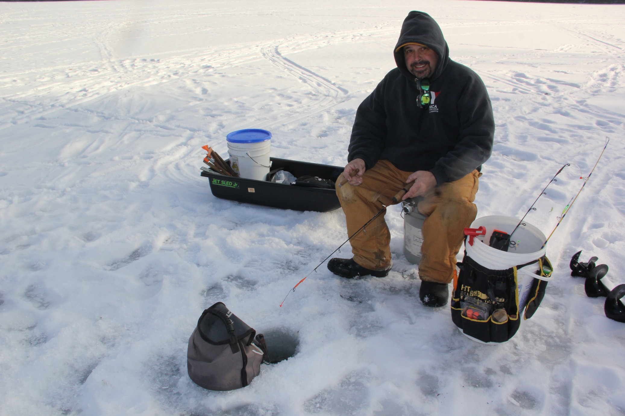 Ice fishermen are taking advantage of slightly warmer temperatures as they flock to the ice-covered lake of the Tuscarora State Park in Barnesville. Below freezing temperatures over the past weeks have resulted in an impressive 13-inches of ice on top of lake.