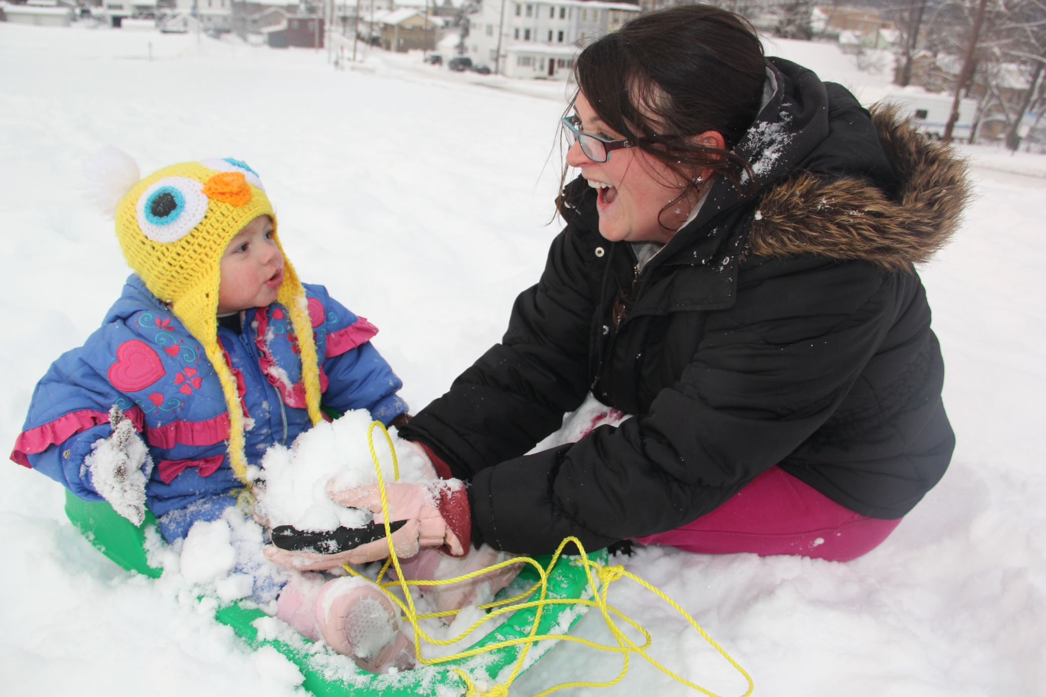 Monday’s snow accumulation in Tamaqua provided plenty of avenues for winter fun. Pictured are family and friends enjoying themselves sliding down the hills surrounding the Tamaqua Area High School.