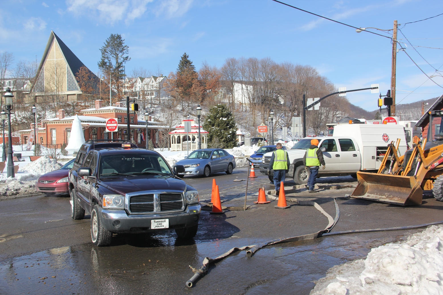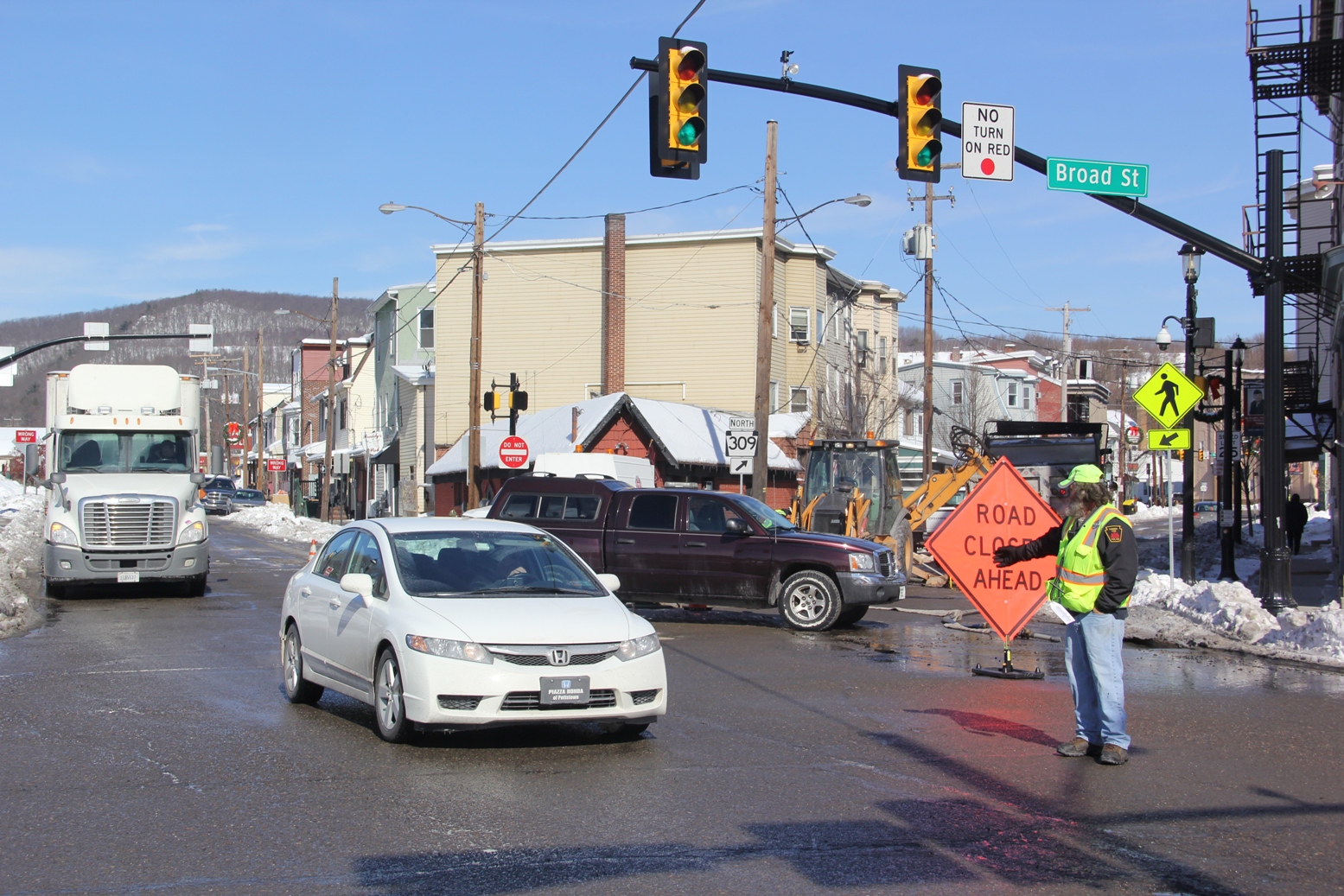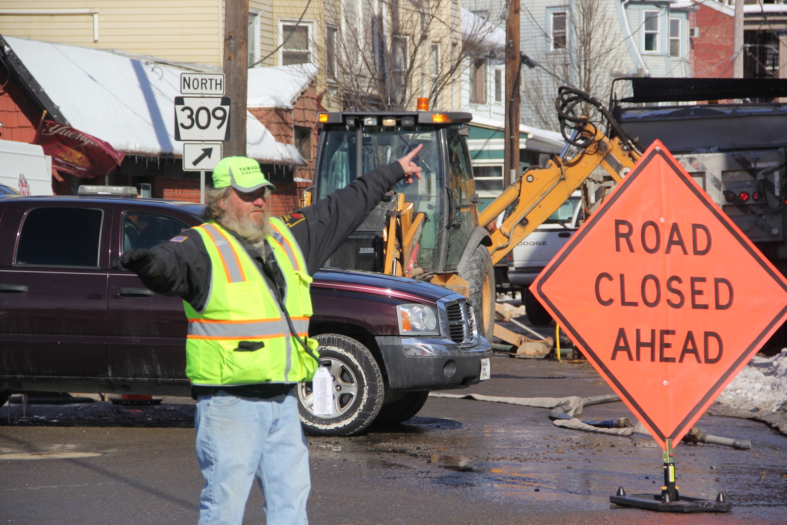 SR309 northbound at the Five Points intersection remains closed to traffic as Tamaqua borough crews work hard to repair a leak from a 12-inch water main along West Mauch Chunk Street. Tamaqua Fire Police volunteers, staged at three intersections, are redirecting the northbound traffic towards East Broad Street, and then back onto SR309 via Pine Street.