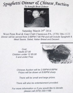 Friends and family members are having a Spaghetti Dinner and Chinese Auction on Saturday, March 29, 2014 at the West Penn Rod and Gun Club to benefit Brett Zehner, who suffered a stroke.——————————