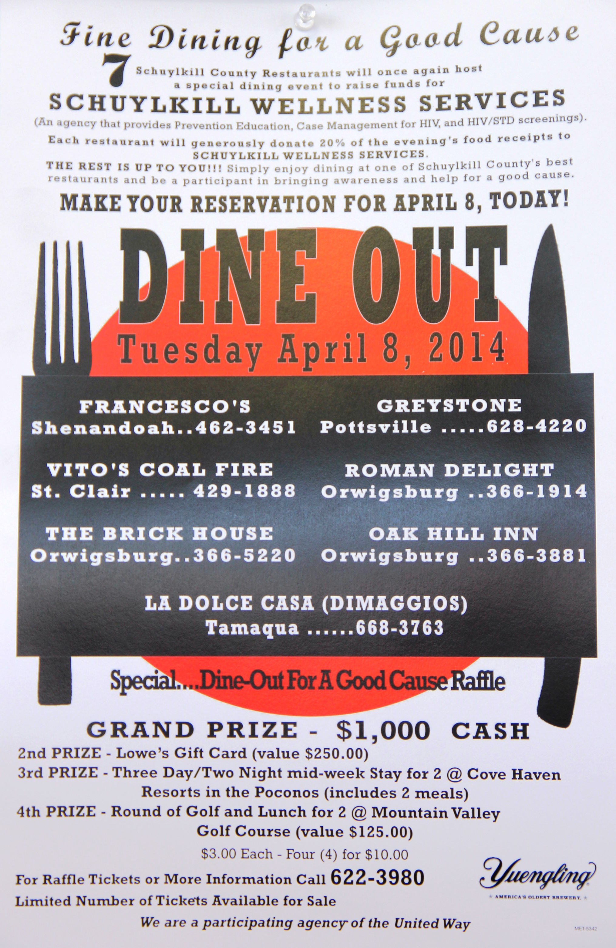 Thinking about eating out this evening? If so, please stop by La Dolce Casa for the annual Dine Out fundraiser. Twenty percent of all proceeds this evening (Tuesday, April 8, 2014) will be given to Schuylkill Wellness Services (SWS), an agency that provides prevention education, case management for HIV, and HIV/STD screenings.