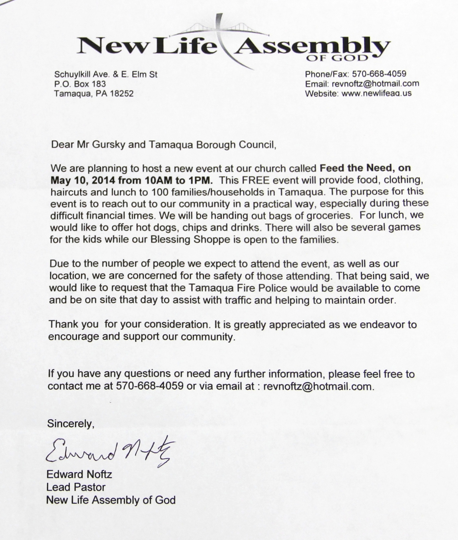 – Communications from Tamaqua’s New Life Assembly of God Feed the Need Program set for Saturday, May 10, 2014 from 10 AM to 1 PM. It reads: “This free event will provide food, clothing, haircuts and lunch to 100 families/households in Tamaqua. The purpose for this event is to reach out to our community in a practical way, especially during these difficult times. We will be handing out bags of groceries. For lunch, we would like to offer hot dogs, chips and drinks. There will also be several games for the kids while our Blessing Shoppe is open to the families.” The letters also asks the Tamaqua Borough for the use of the Tamaqua Fire Police, dependent upon availability. Click HERE to view the letter.