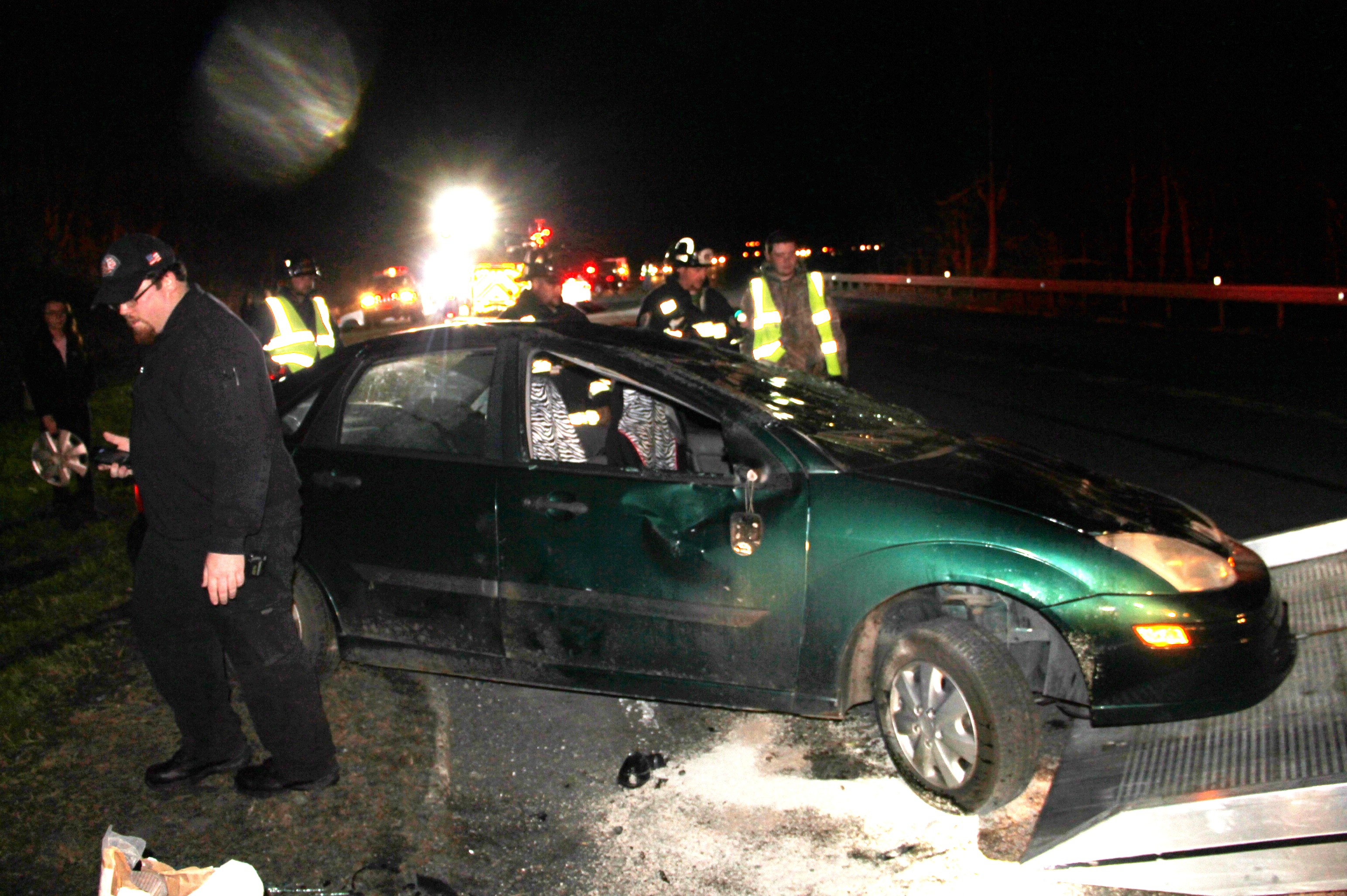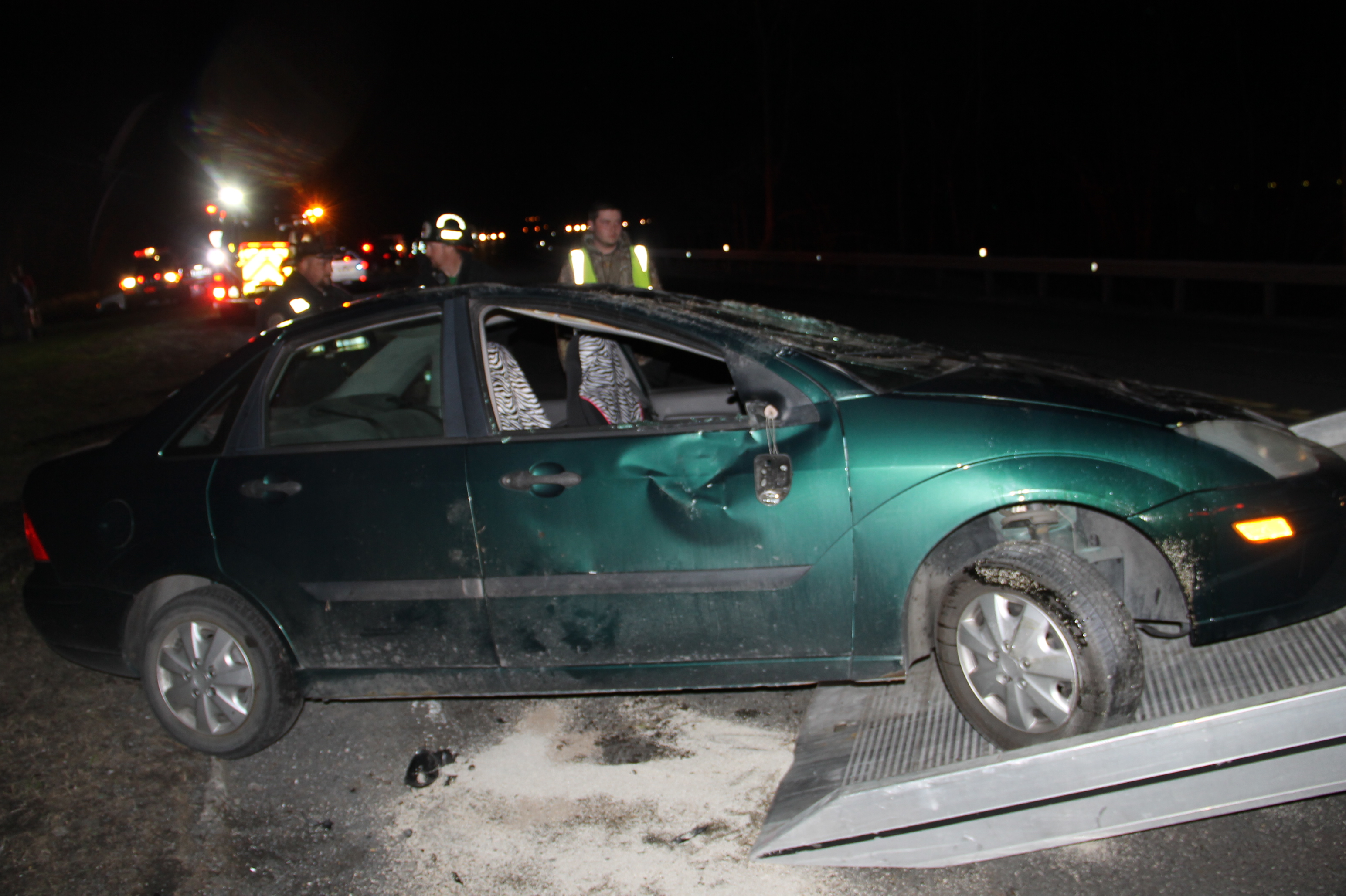 Tire tracks on the road and in the grass showed that the vehicle (a green Ford Focus) was traveling northbound when the vehicle left the road and flipped onto the grass.