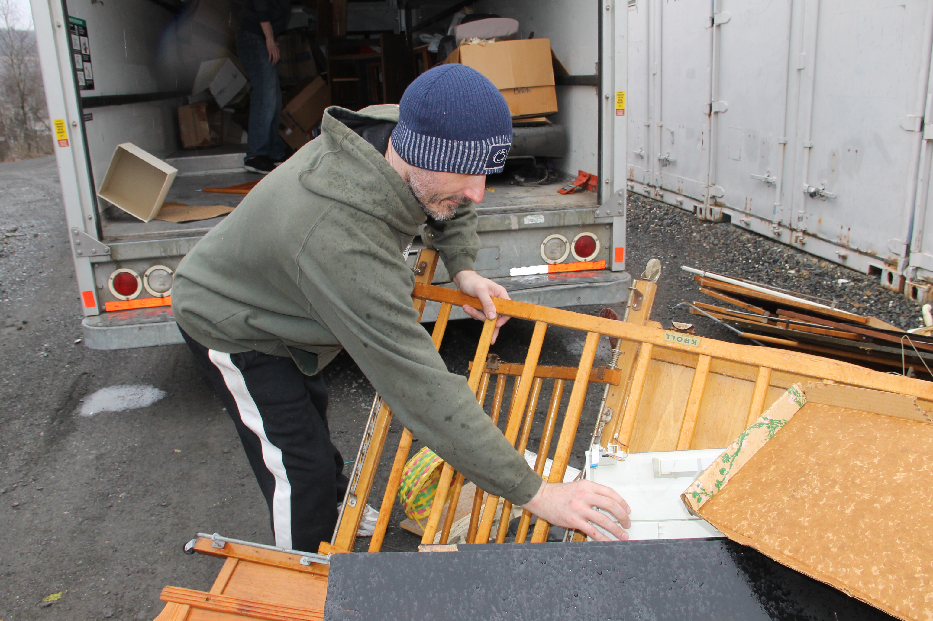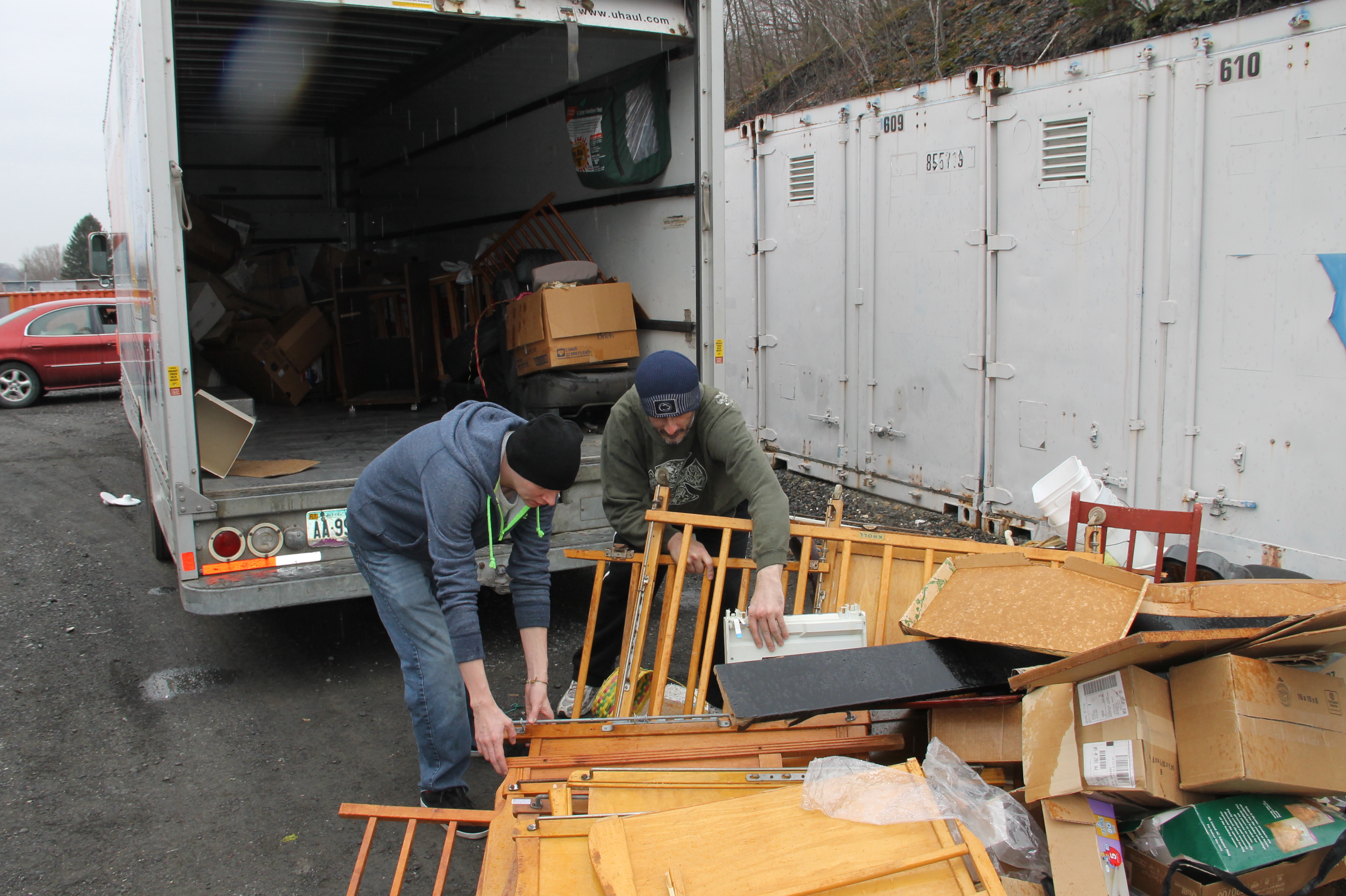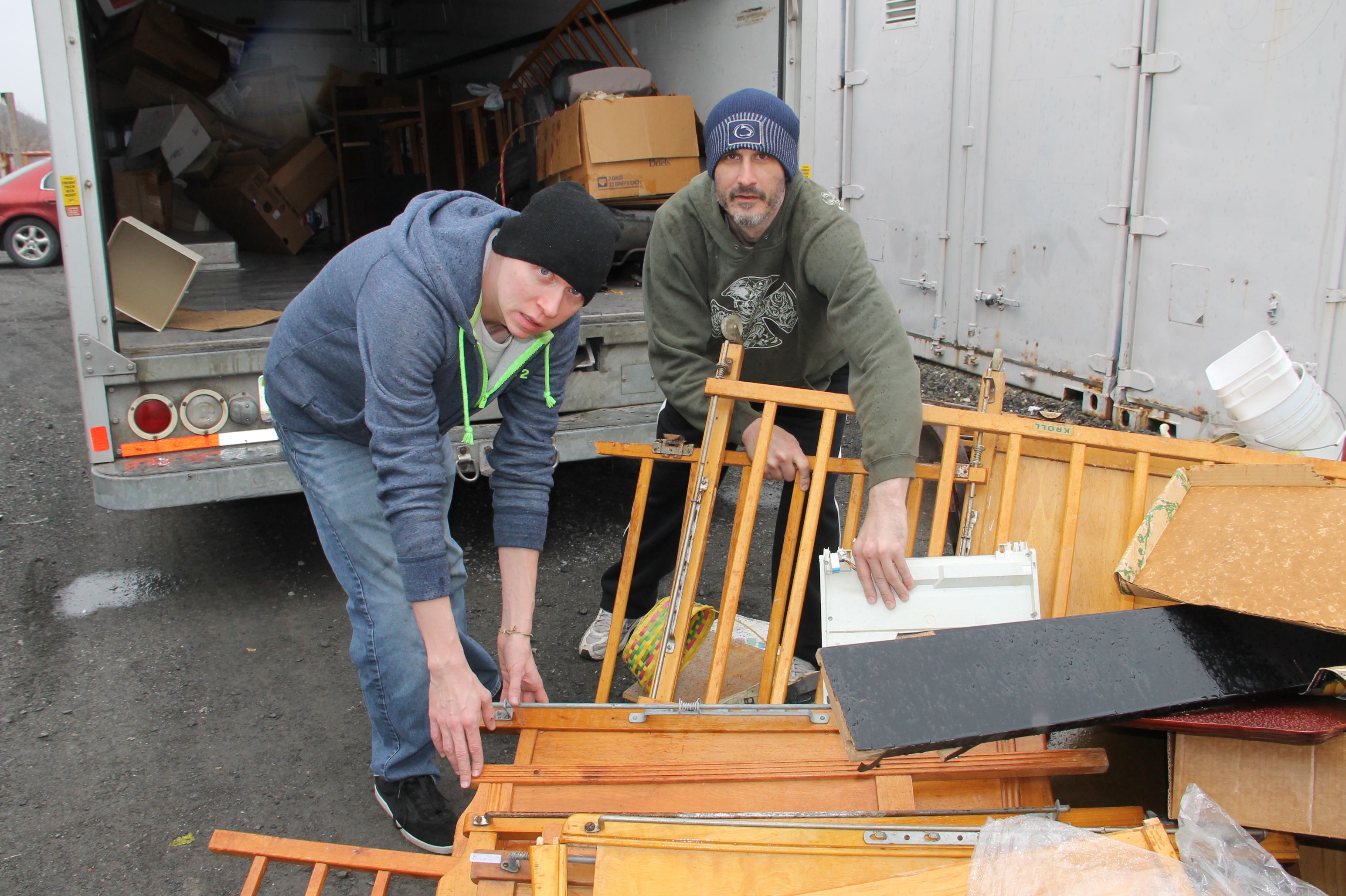 Pictured making room for hundreds of donated used/clean blankets, pillows, sheets and bed skirts are Tamaqua Volunteers Eric Becker and Dave Fahringer. These items will be available for anyone to receive tomorrow (Saturday, April 26, 2014) during the group’s community giveaway planned for 9:5 AM.