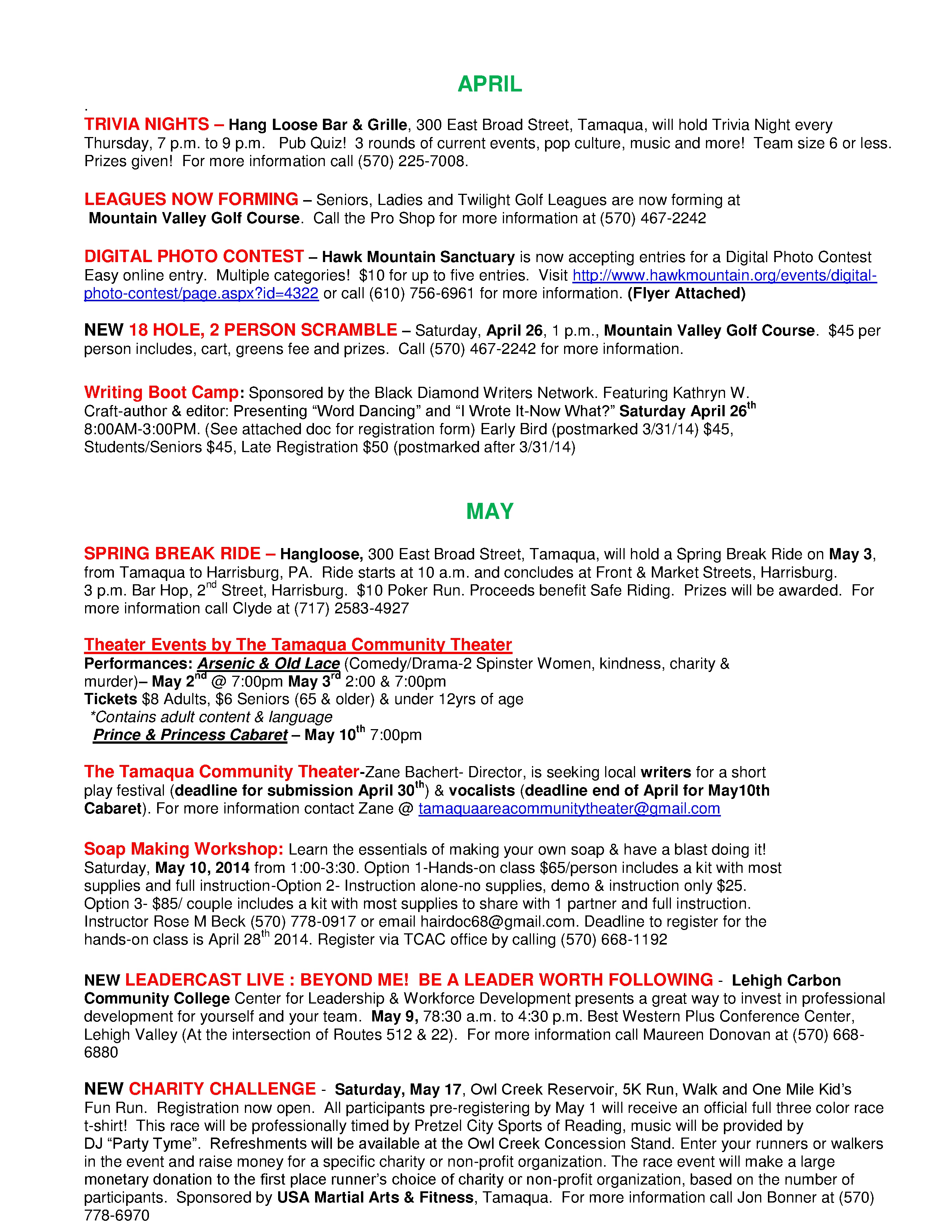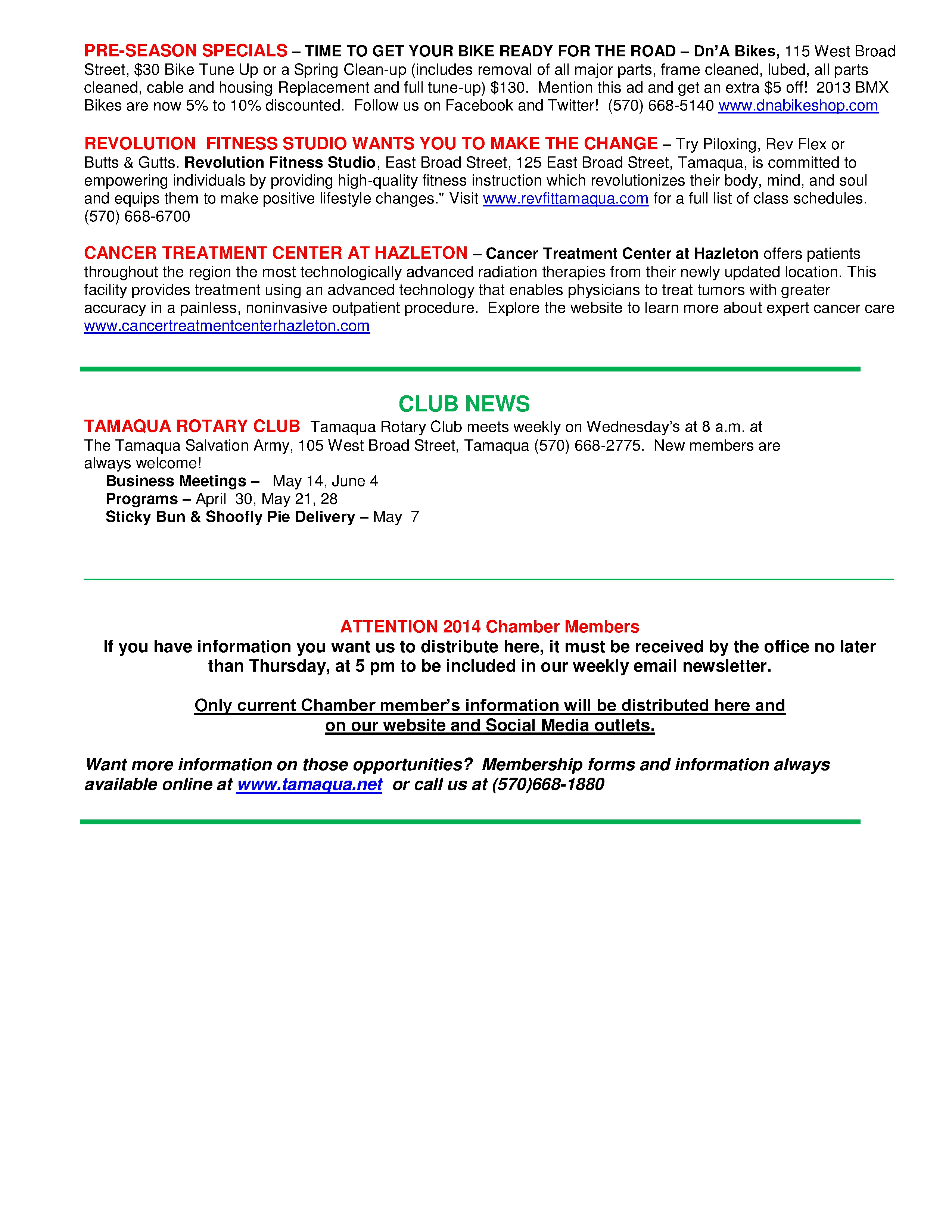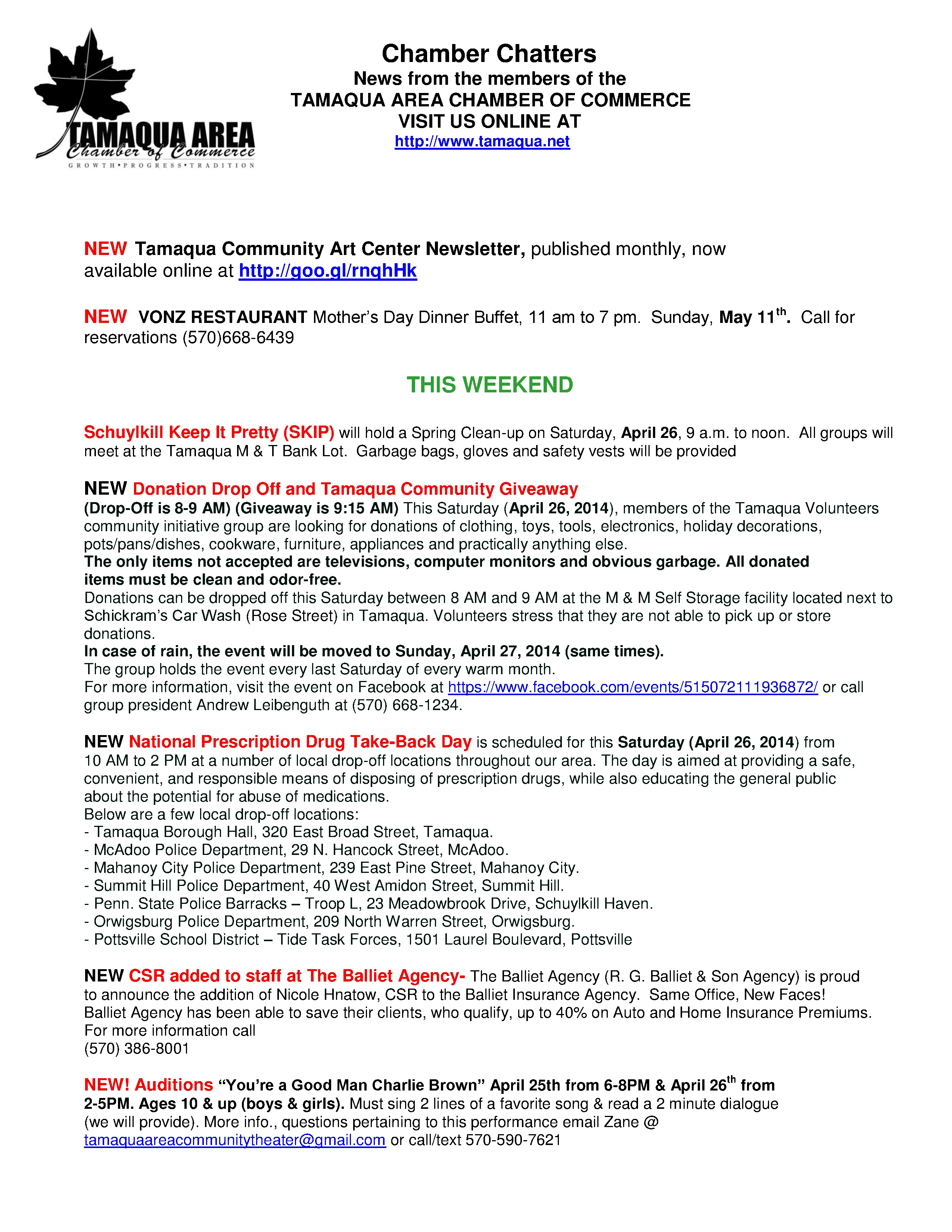 Here is the latest Tamaqua Area Chamber of Commerce’s Chamber Chatters newsletter (dated Friday, April 25, 2014). For more information about the Chamber or to volunteer, stop by their office during the week at 114 West Broad Street, call (570) 668-1880 or visit them online at www.tamaqua.net.