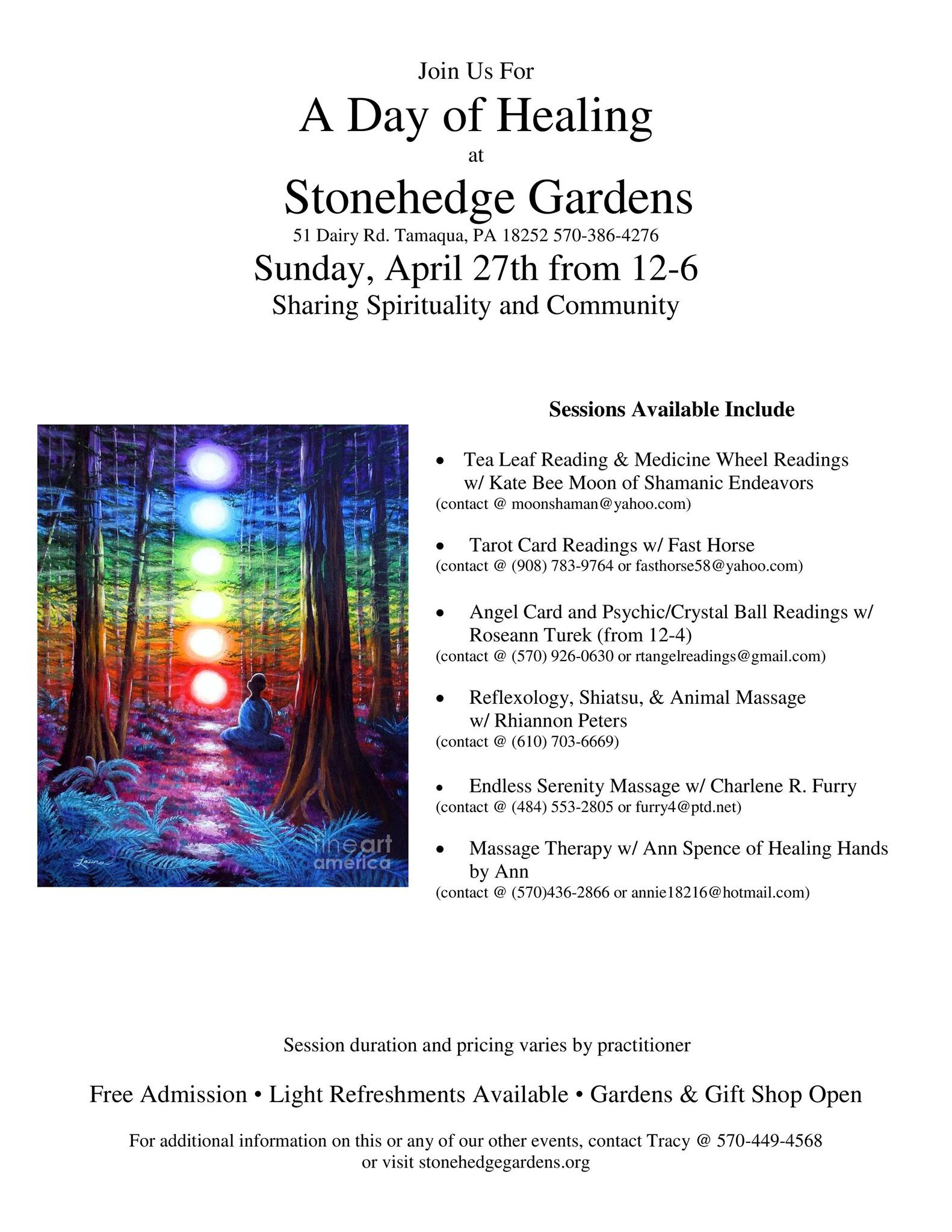 Stonehedge Gardens events, day 2, Sunday, Day of HealingSUNDAY (Day of Healing) from 12 PM to 6 PM: