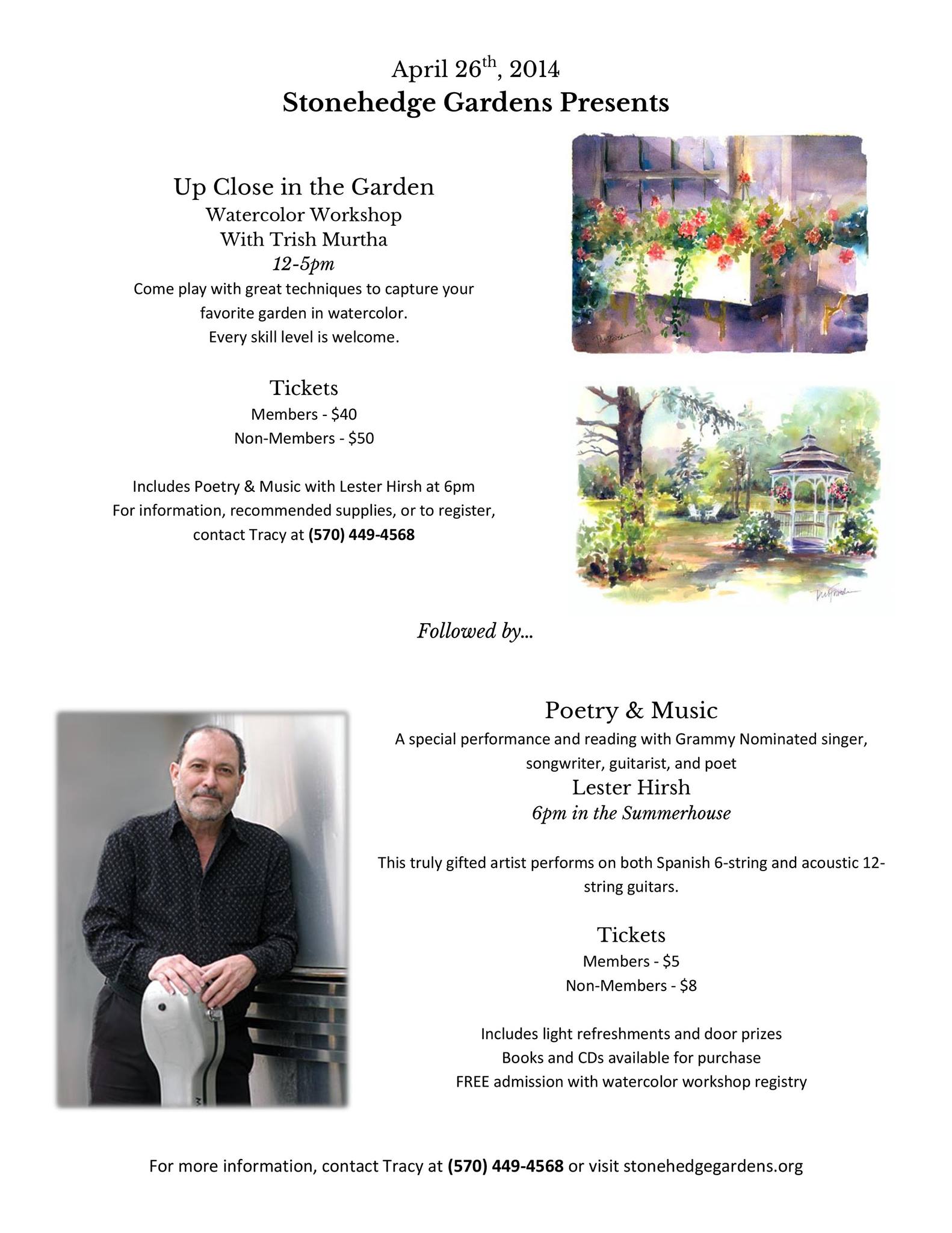 – “Up Close in the Garden” watercolor workshop with Trish Murtha from 12 PM to 5 PM.