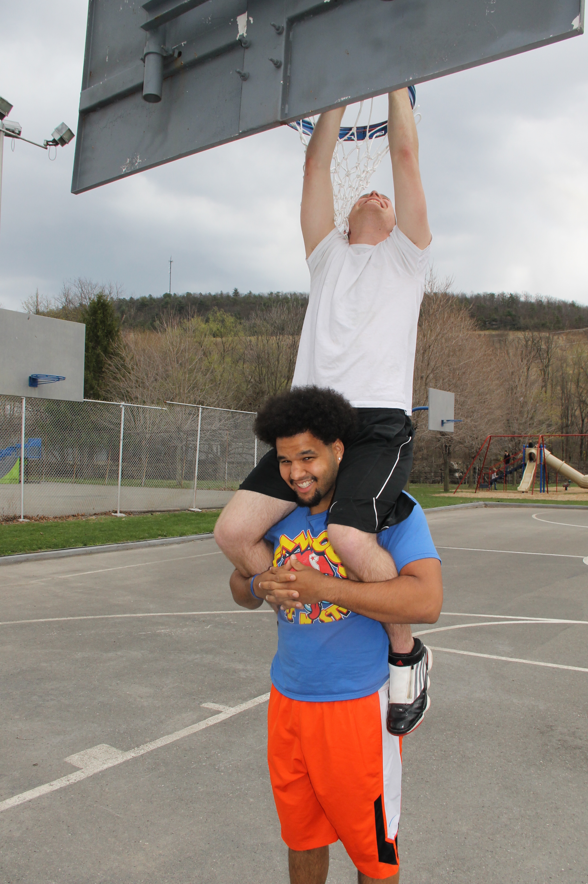 Marques Middleton, Lansford, lifts Zach Zedalis, also of Lansford, on his shoulders to fix a basketball net at the Willing Skate Park in Tamaqua.
