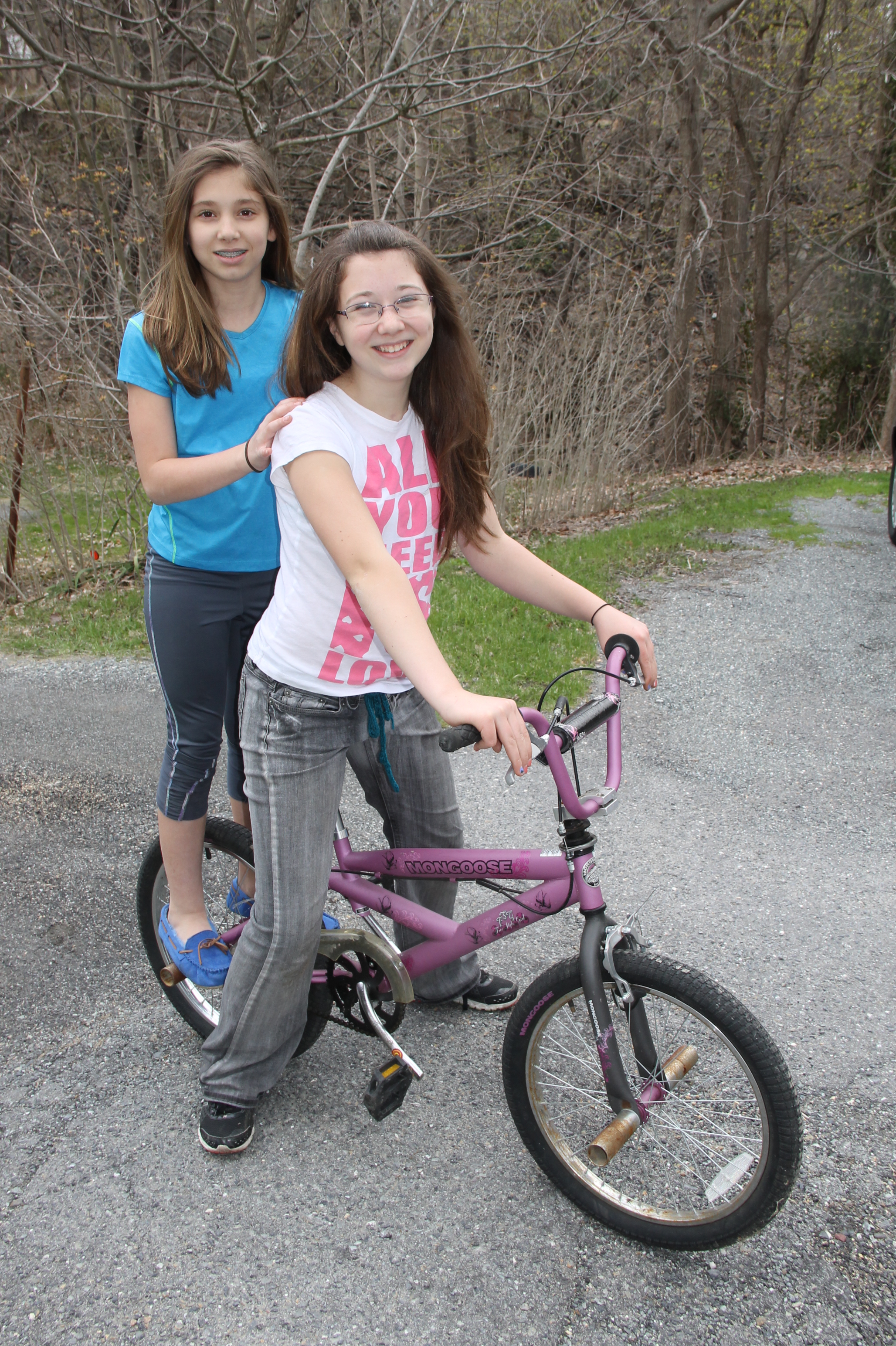 Posing for a quick photo on their bicycle in Tamaqua are friends Sandie Morrison, 12, and Faith Roberts, 14.