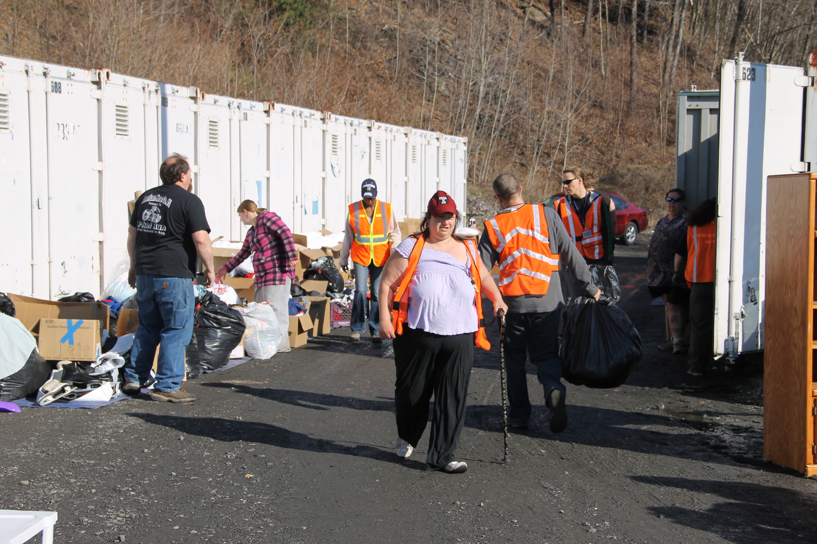 Volunteers state their appreciation to Thorn Cycle’s, M & M Self Storage and the Moyer family for donating the facility every month for the giveaway.