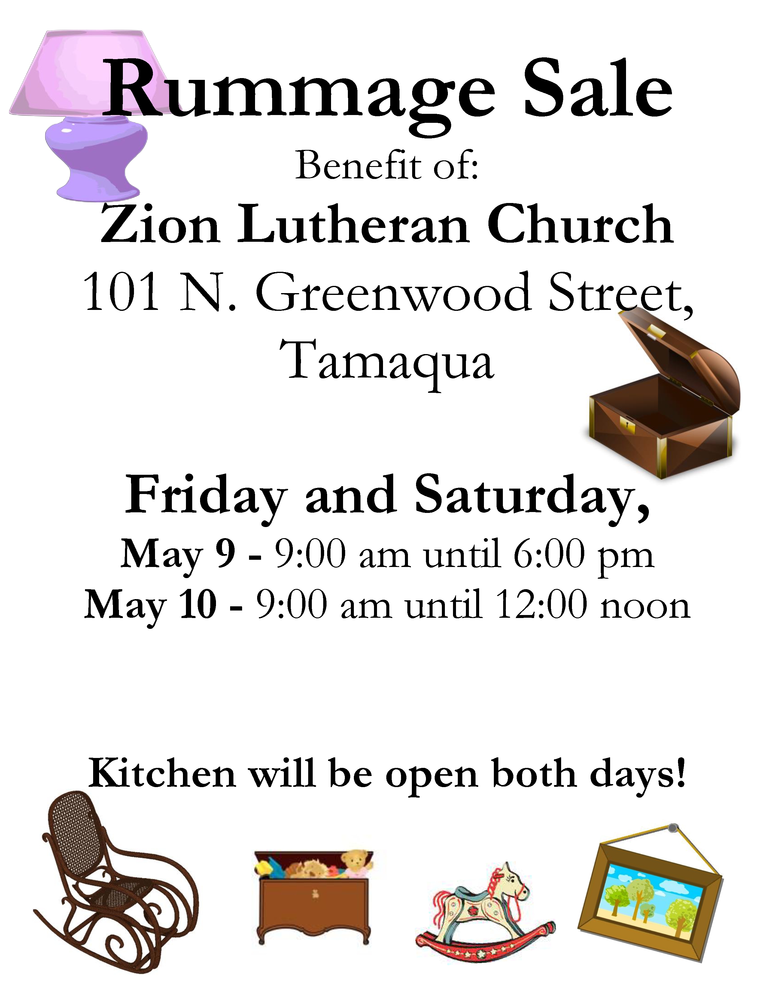 The Zion Evangelical Lutheran Church in Tamaqua is having a rummage sale today and tomorrow (Friday, May 9 and Saturday, May 10, 2014) at the church.