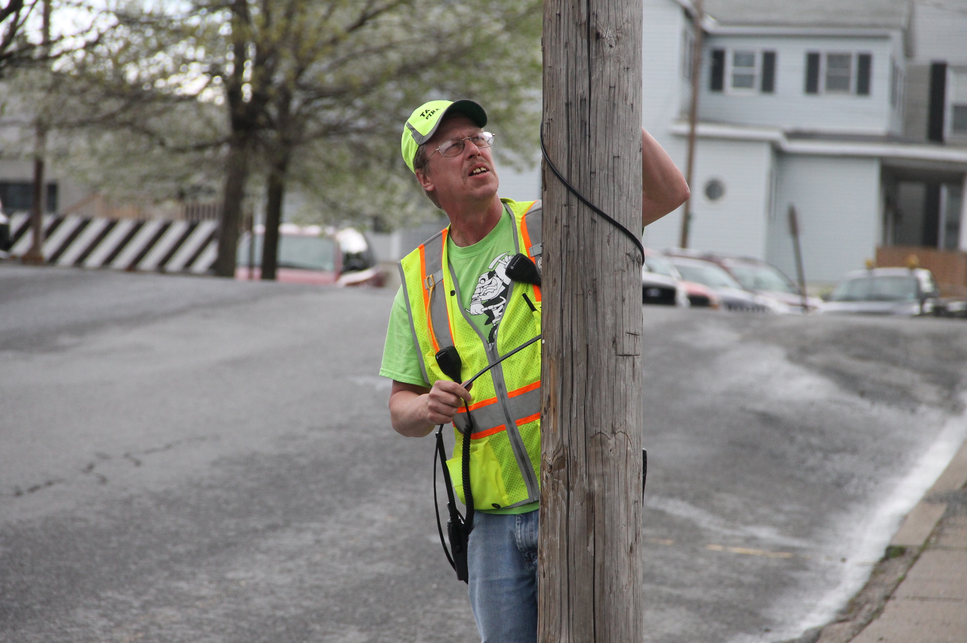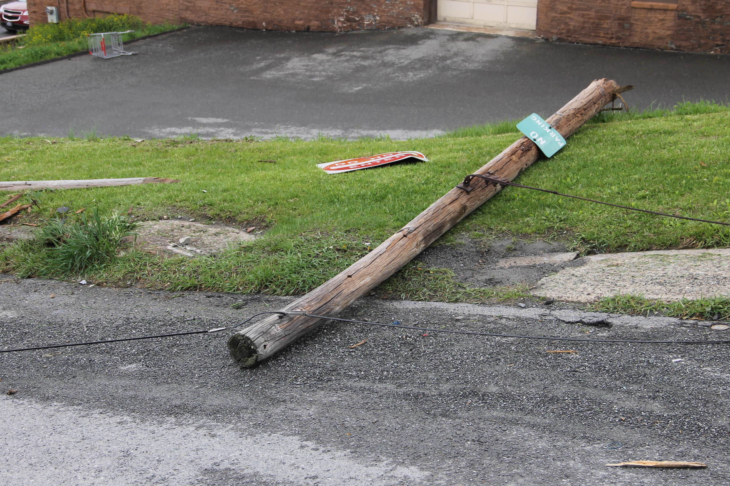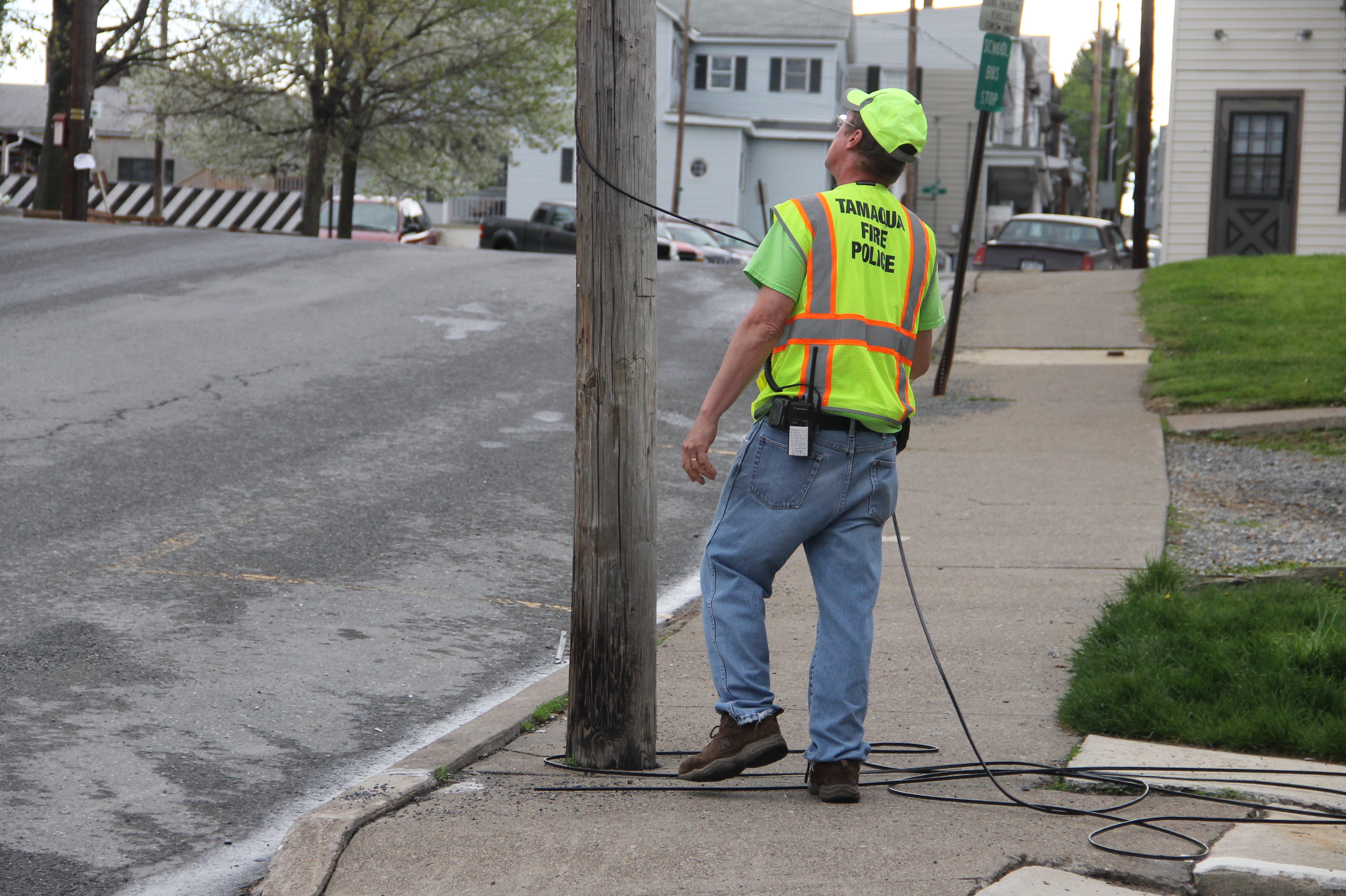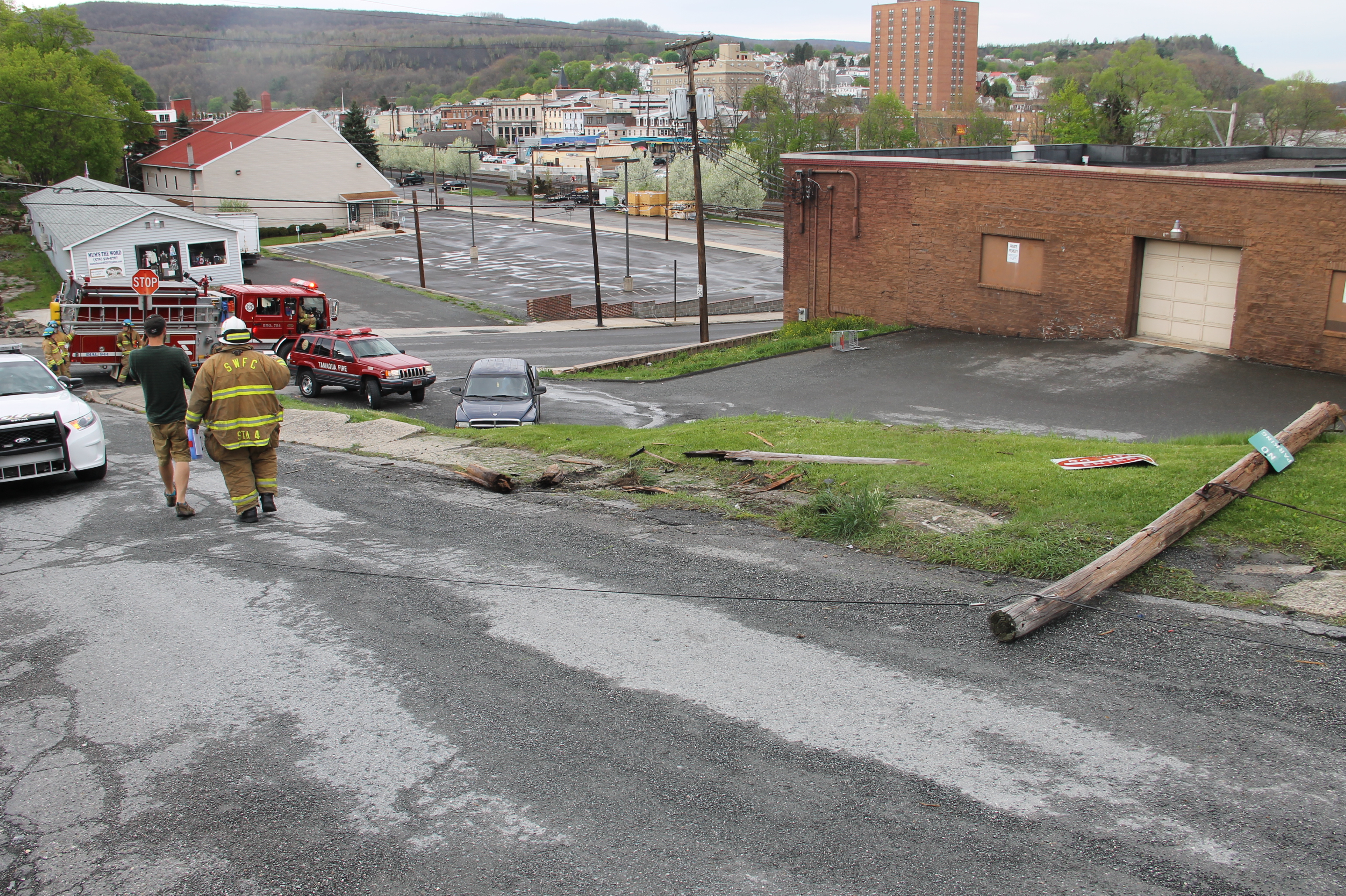 The male driver of a pickup truck said failed brakes caused him to lose control of his truck and snap a utility pole on Cherry Street in Tamaqua just after 5:30 PM today (Saturday, May 10, 2014). He added that the pole prevented him from careening down a steep hillside at the bottom of Cherry Street. He eventually managed to stop his truck at the bottom of Spruce Street.