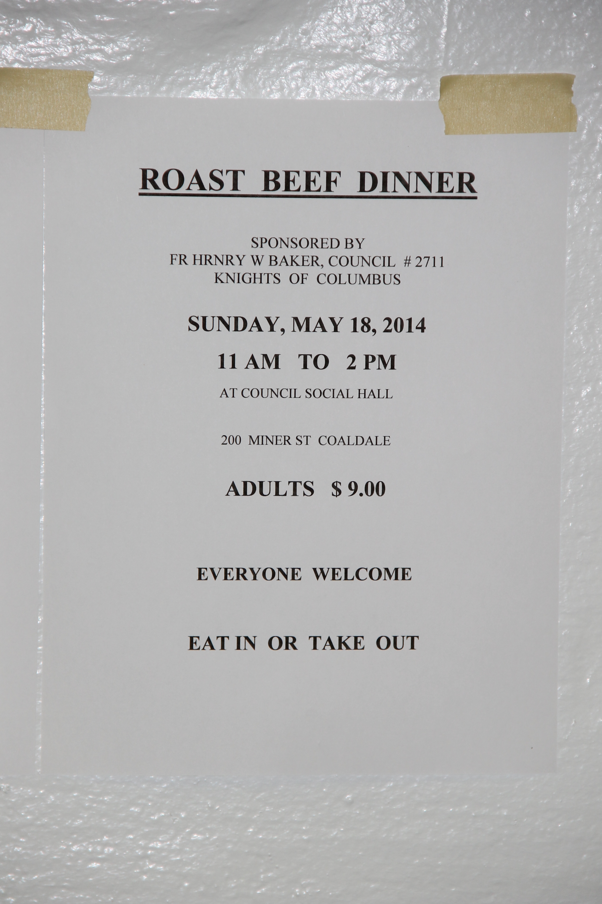 May 18 – 11AM-2PM –> Roast Beef Dinner in council social hall. ($9).