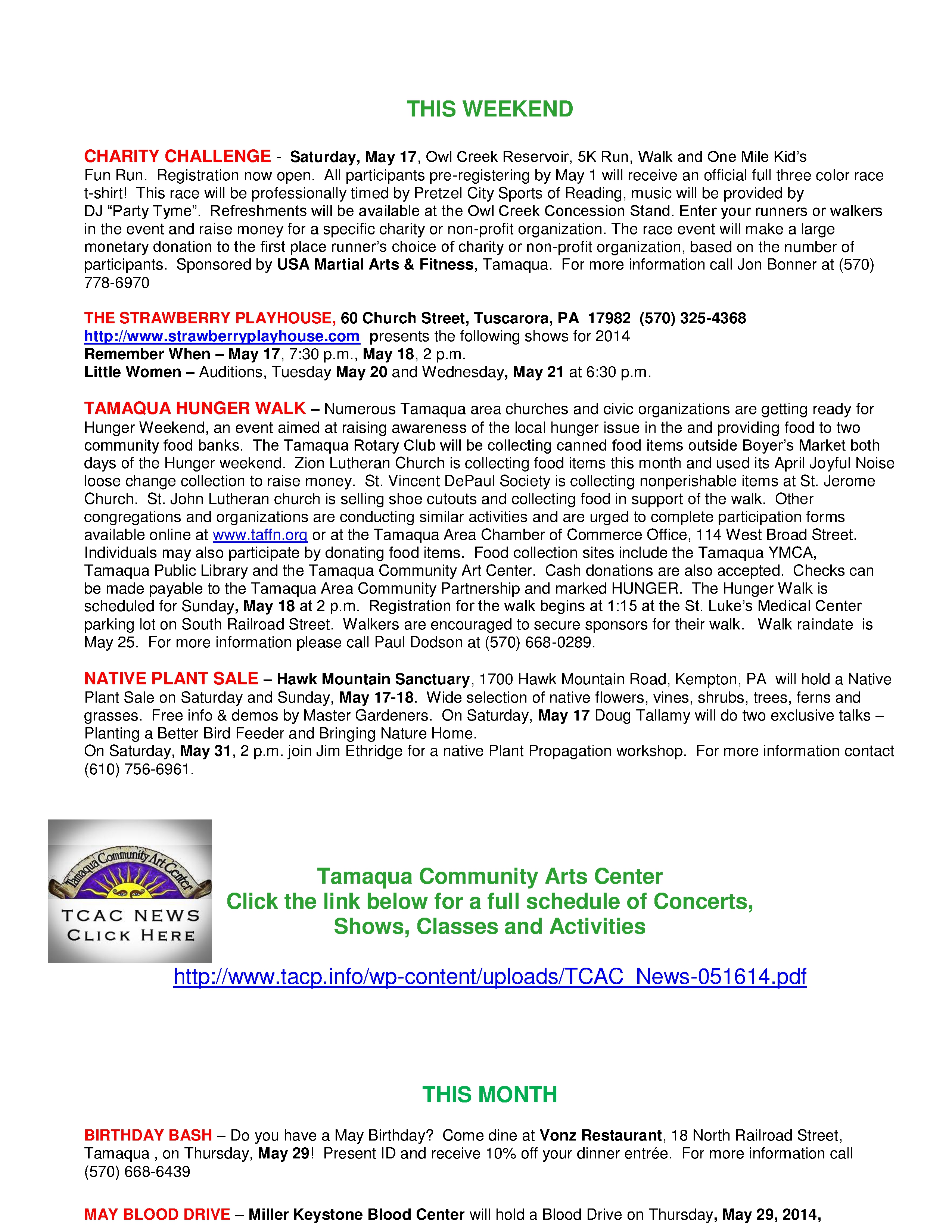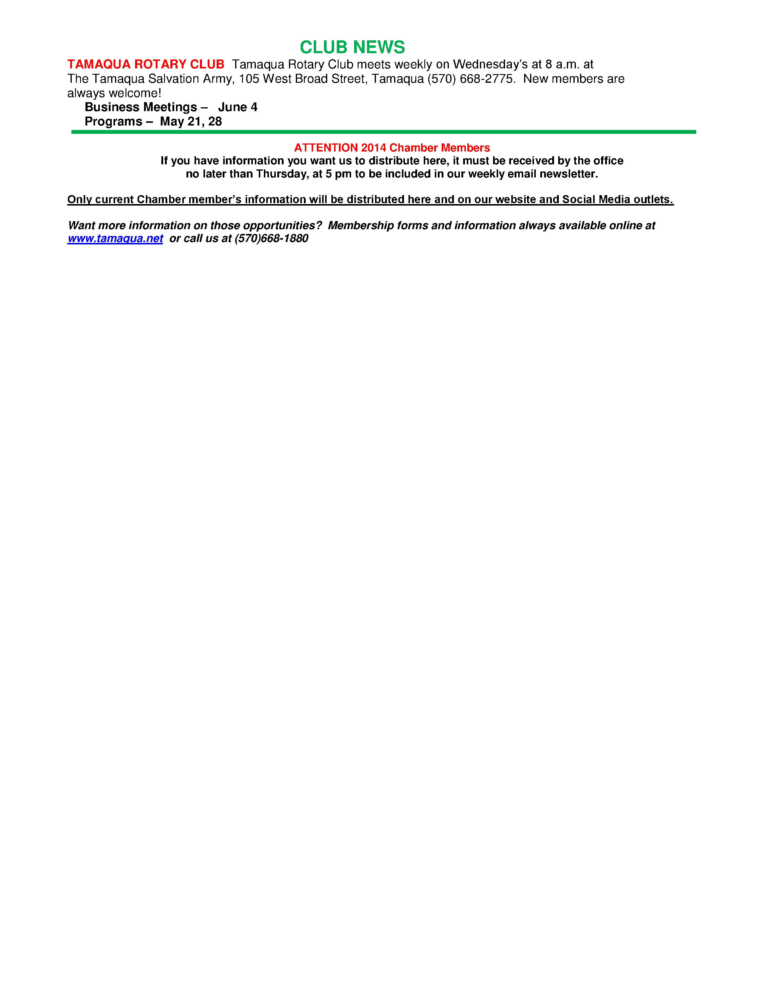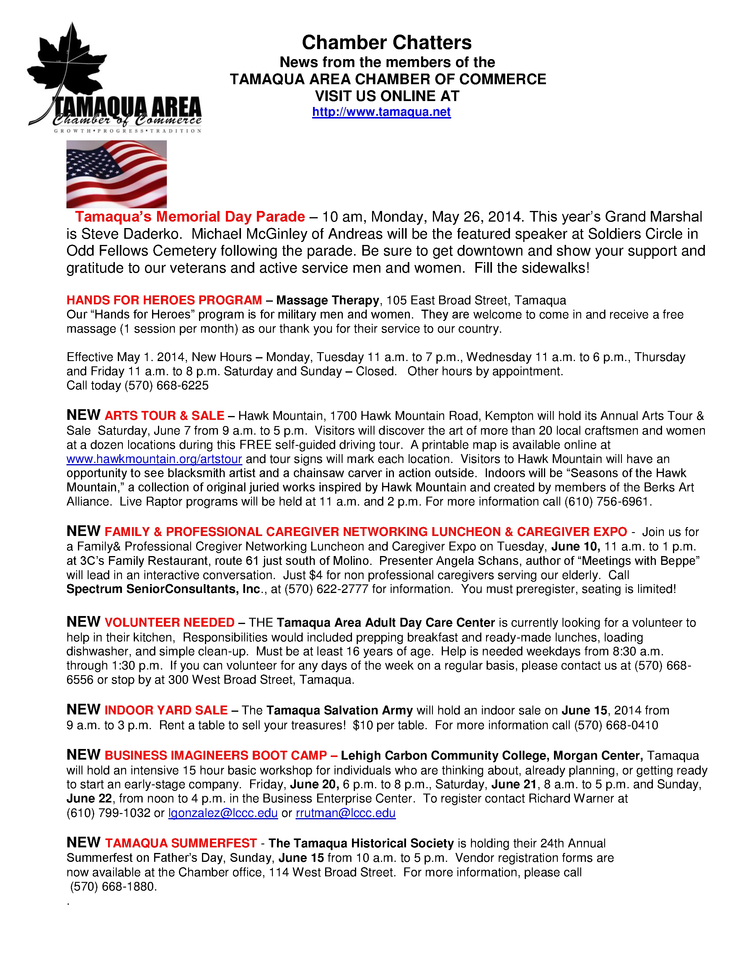 Here is the latest Tamaqua Area Chamber of Commerce’s Chamber Chatters newsletter – dated Friday, May 16, 2014. For more information about the Chamber or to volunteer, stop by their office during the week at 114 West Broad Street, call (570) 668-1880 or visit them online at www.tamaqua.net.