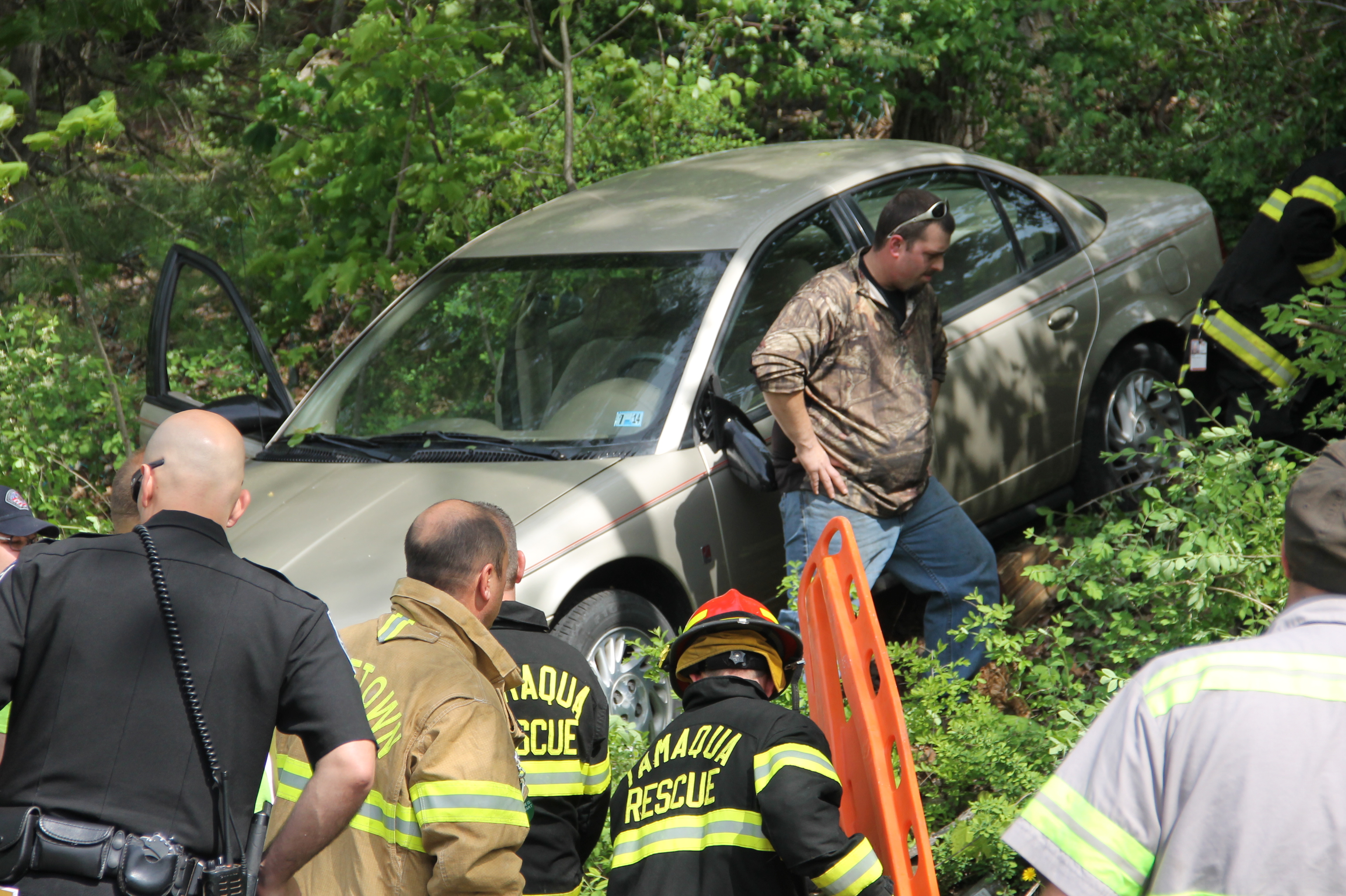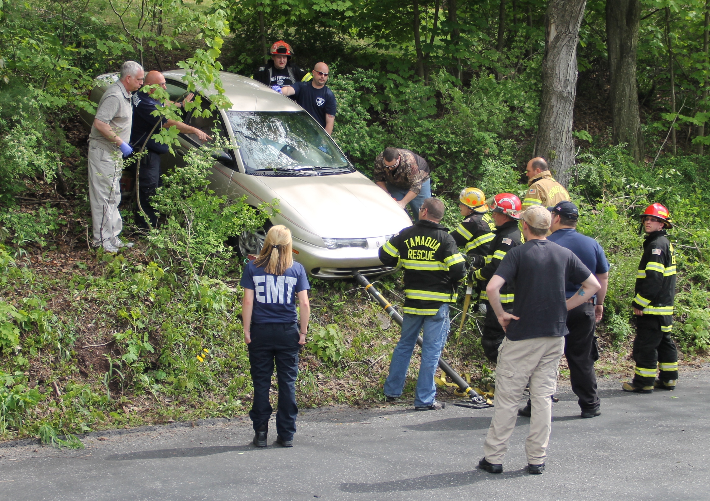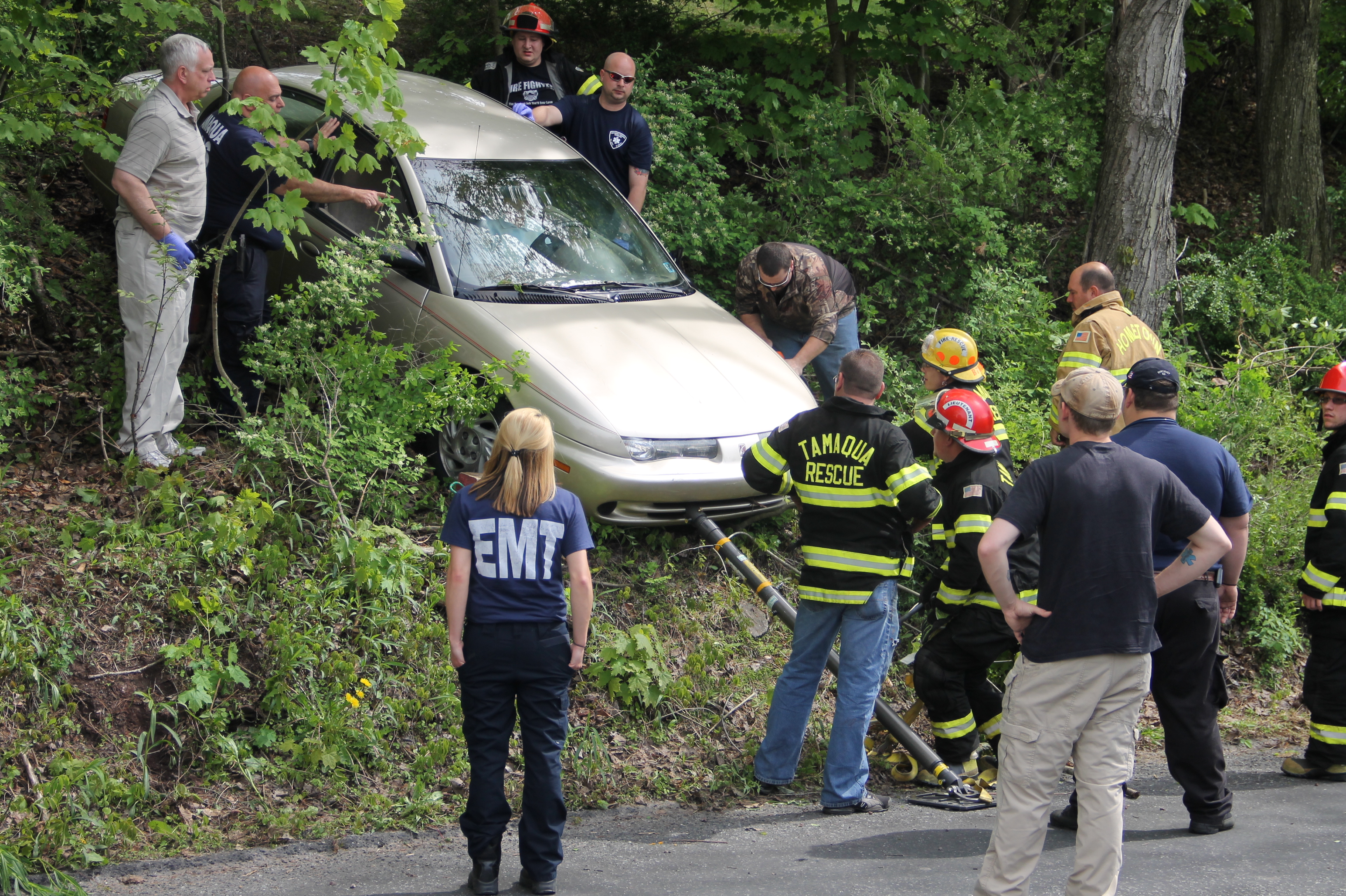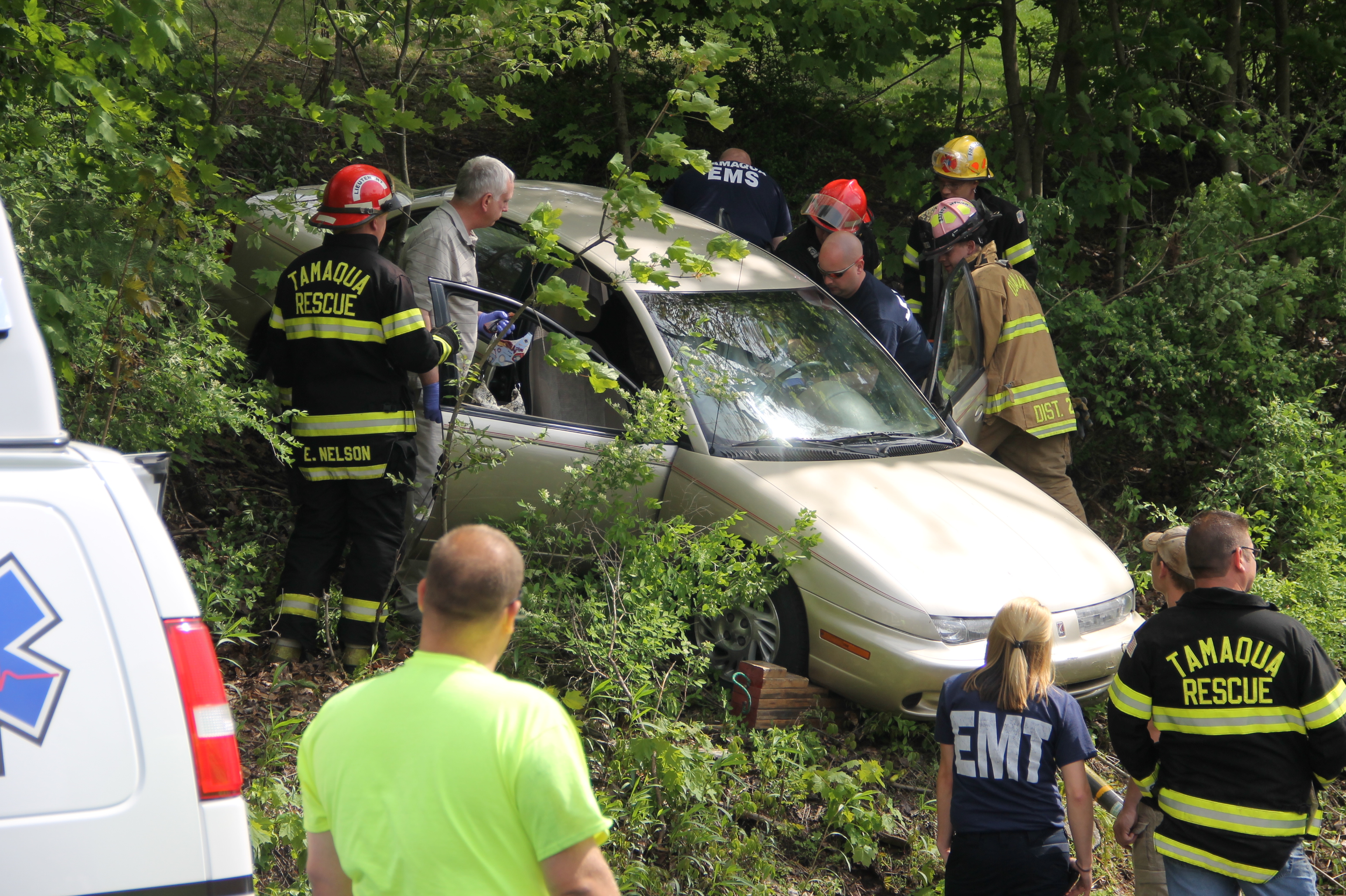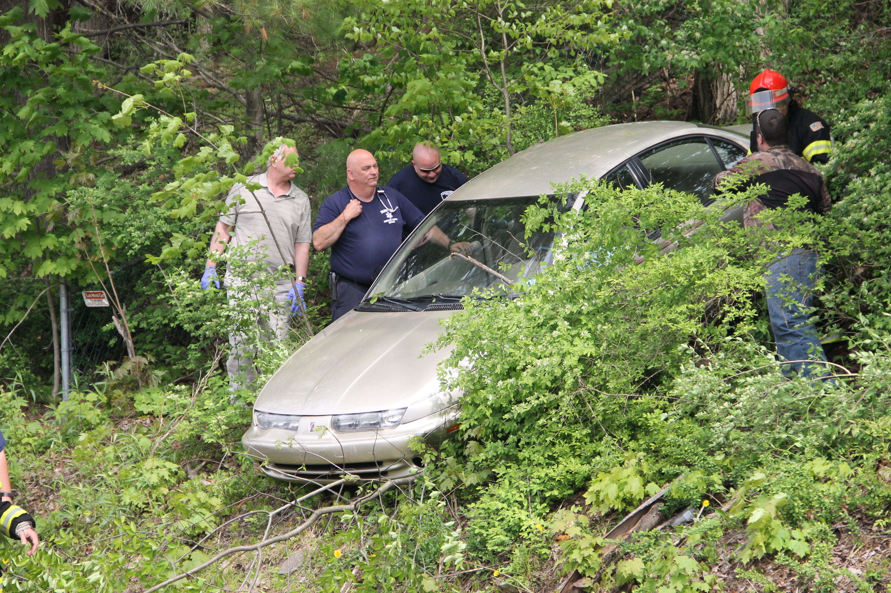 They arrived to see an elderly woman inside a tan Saturn on the embankment between Dennis Street and Locust Street. After stabilizing the vehicle, firefighters and rescue personnel extracted the woman from the vehicle and onto a stretcher for transport to the hospital. The woman was conscious and able to talk to rescuers.
