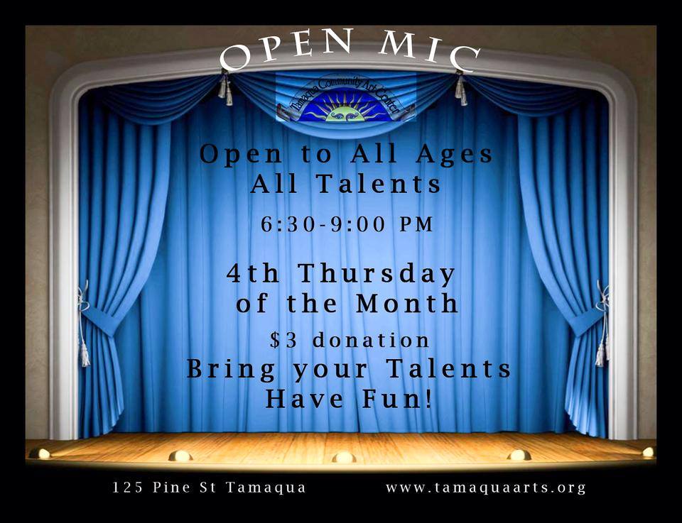 The Tamaqua Community Arts Center is holding it’s monthly Open Mic Night today (Thursday, May 22, 2014) from 7 PM to 9 PM at the center.