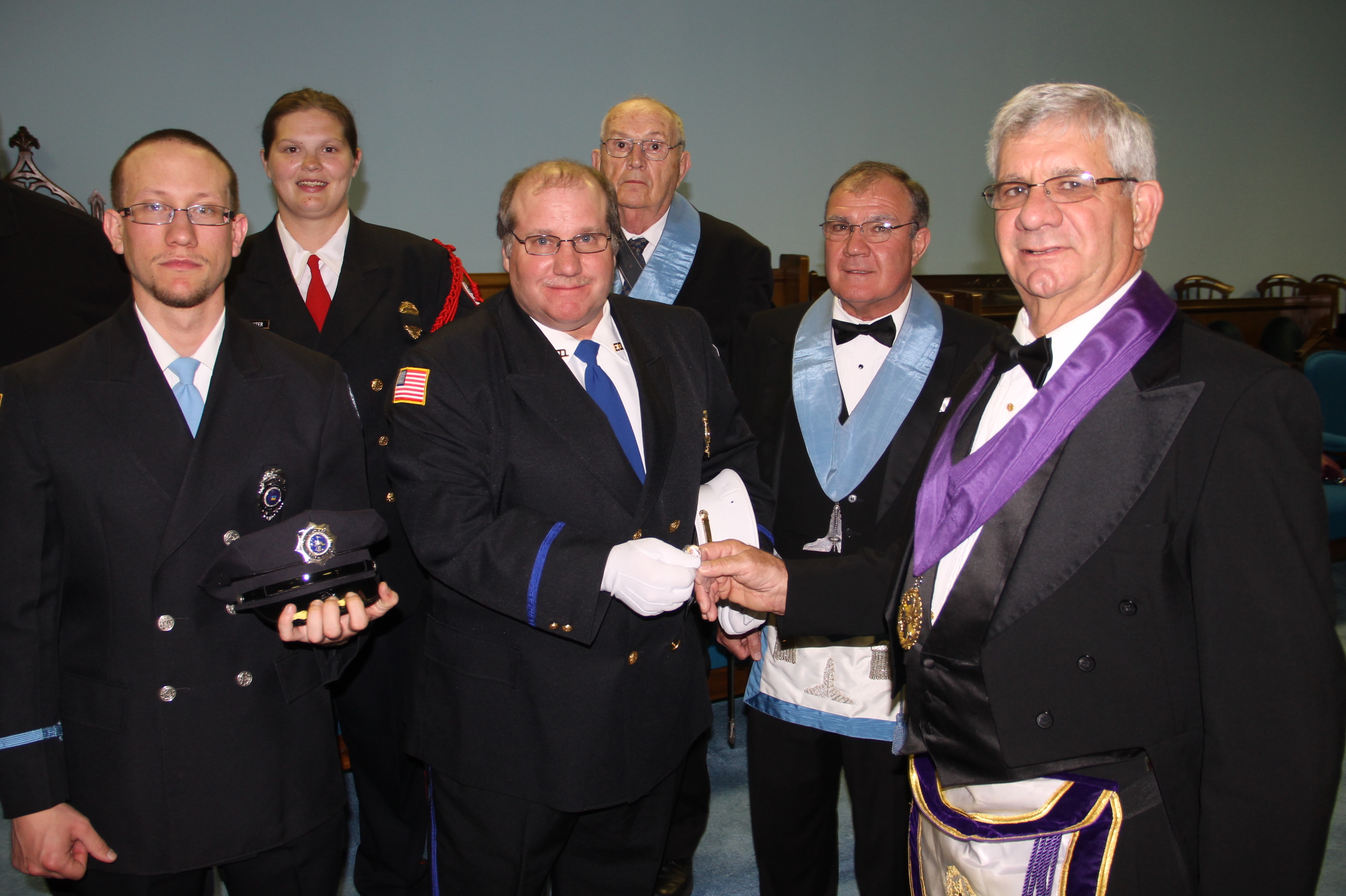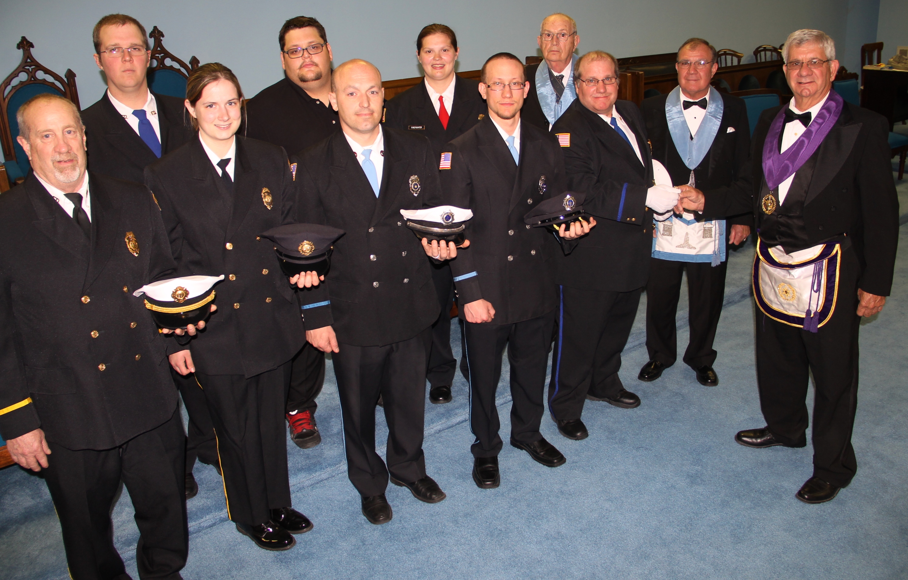 Masons pictured with emergency responders are Richard Hadesty, Junior Master of Ceremony; John Schickram, Past Master of Senior Warden; and Robert Neff, District Deputy Grand Master of 45th Masonic District.