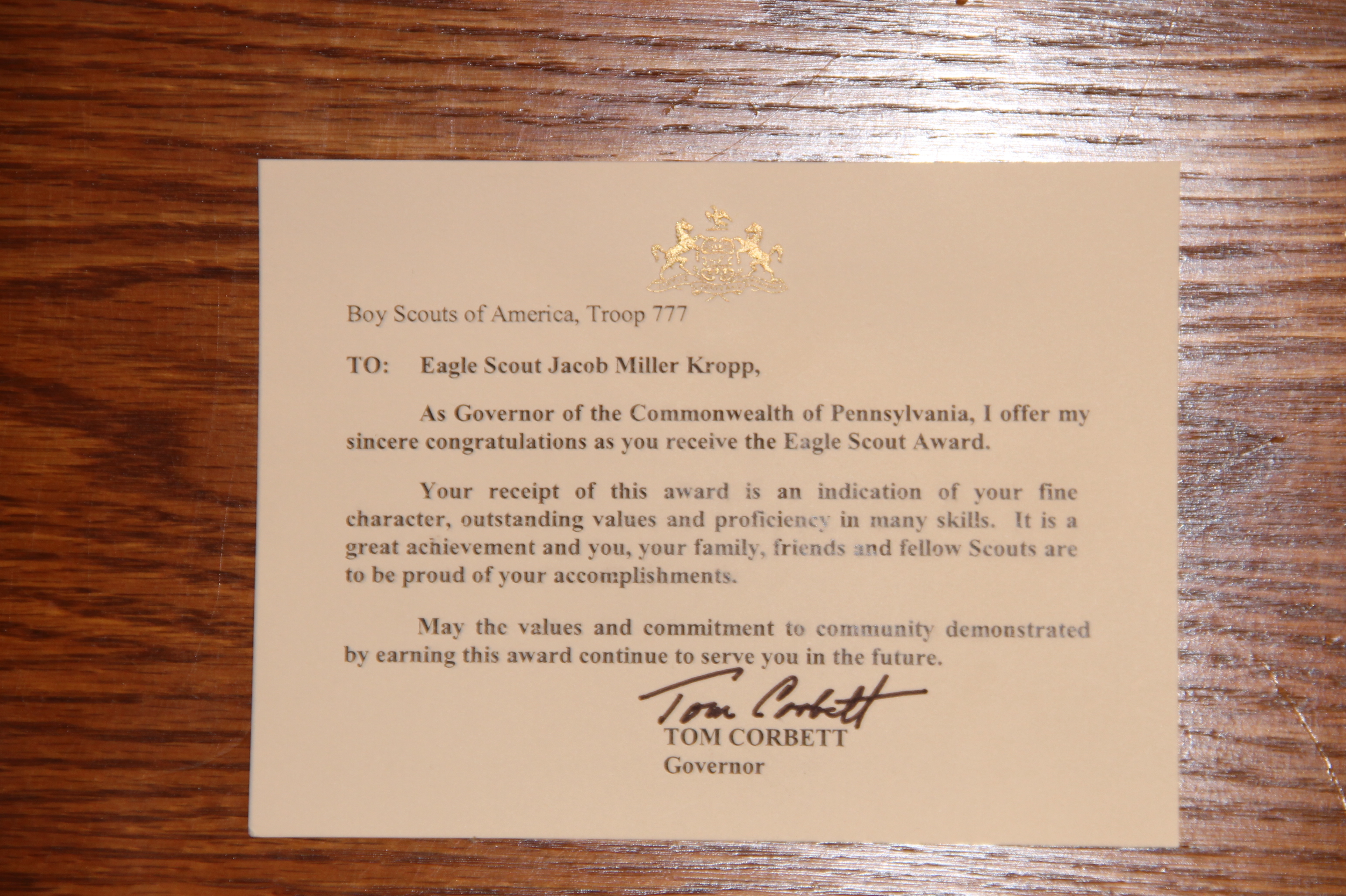 Kropp also received various special citations and recognitions. Some of which included correspondence from PA Governor Tom Corbett, Past US President George W. Bush, current US President Barack Obama, PA Representative Jerry Knowles, PA Senator Dave Argall, and Tamaqua Borough. Knowles and Morrison were on hand during the presentation.