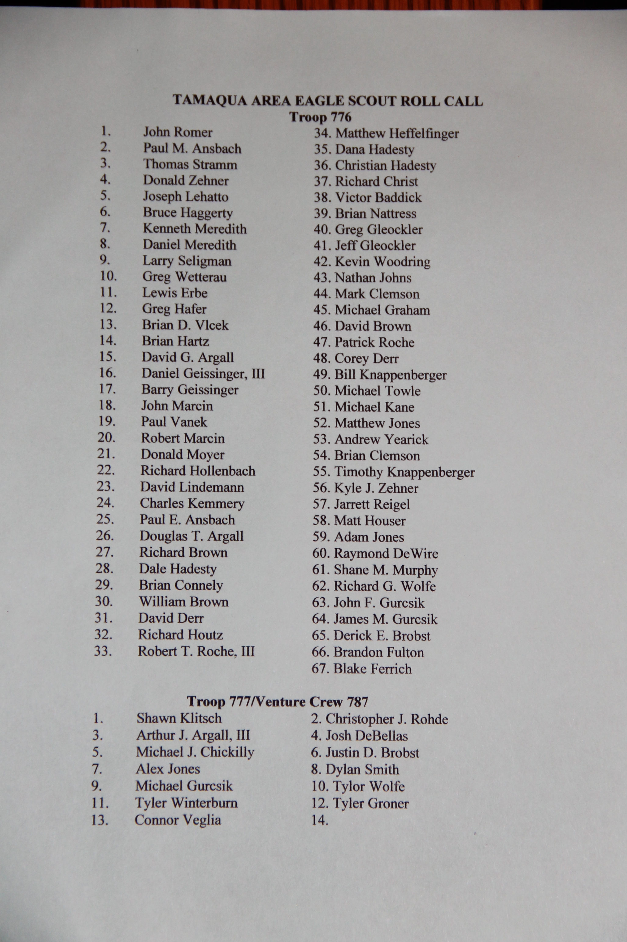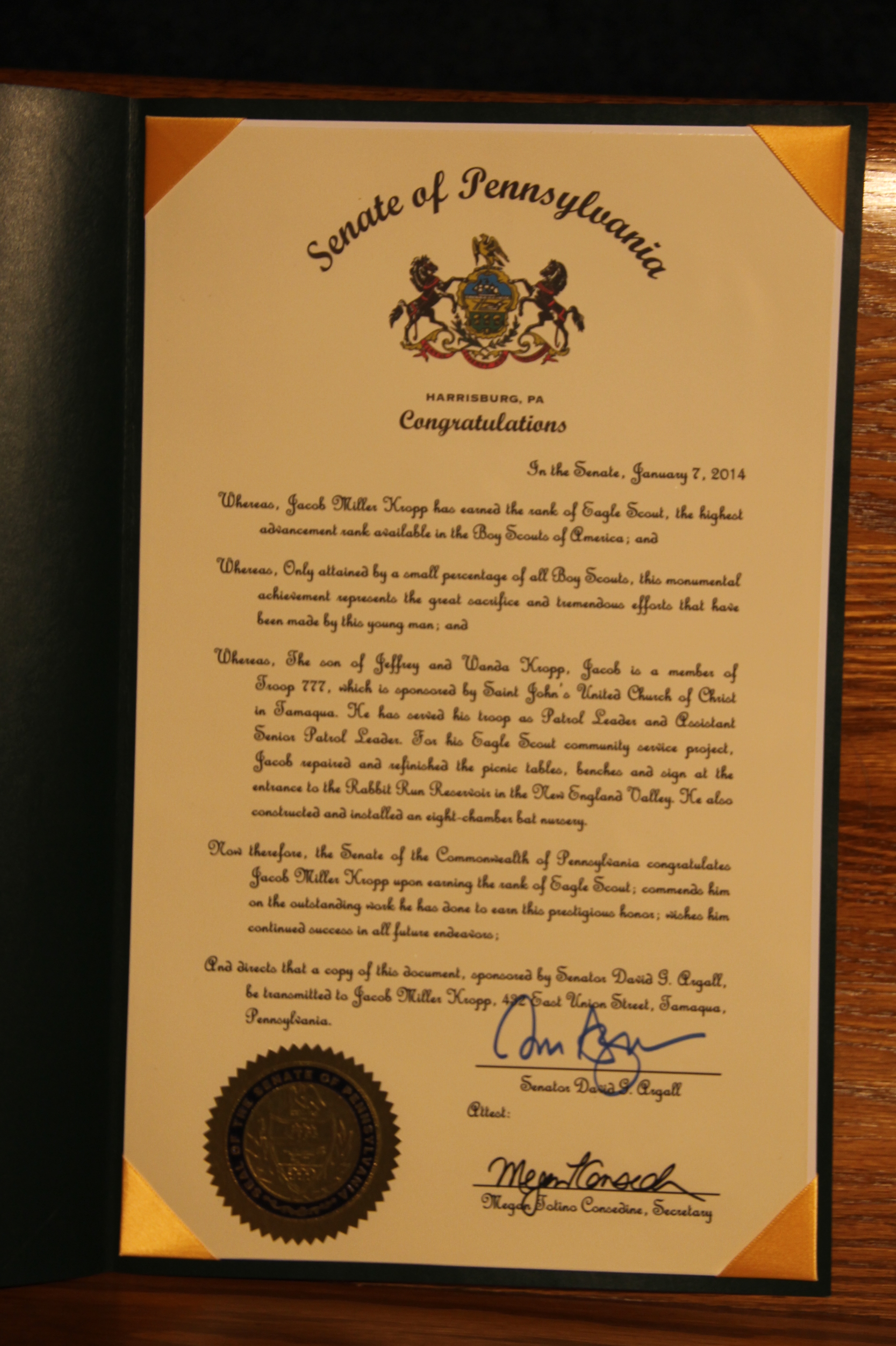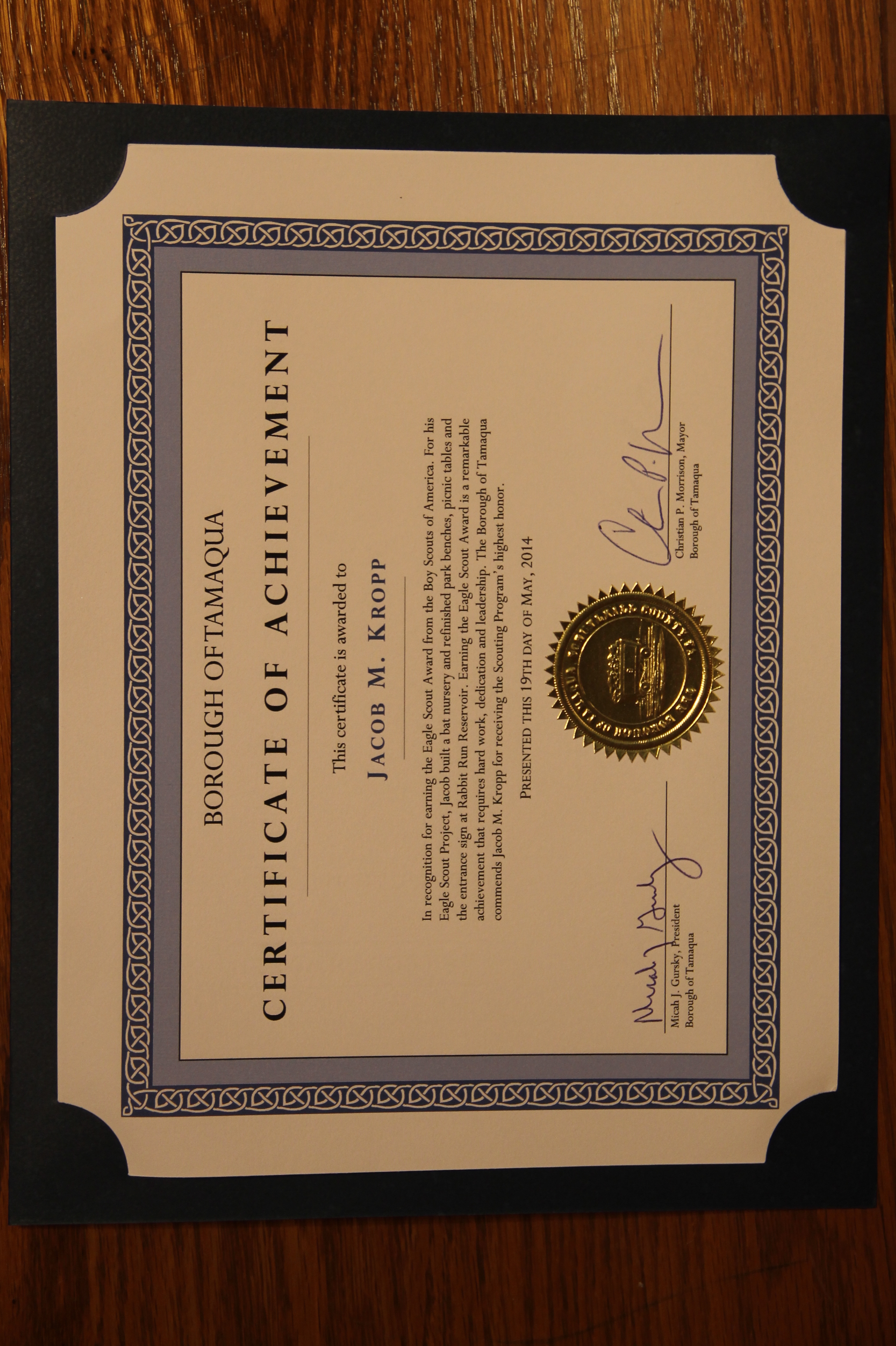 Jacob M. Kropp, 18, of Tamaqua Boy Scout Troop 777, earned the rank of Eagle Scout during an Eagle Court of Honor Ceremony held May 19, 2014 at the St. John’s United Church of Christ in Tamaqua.