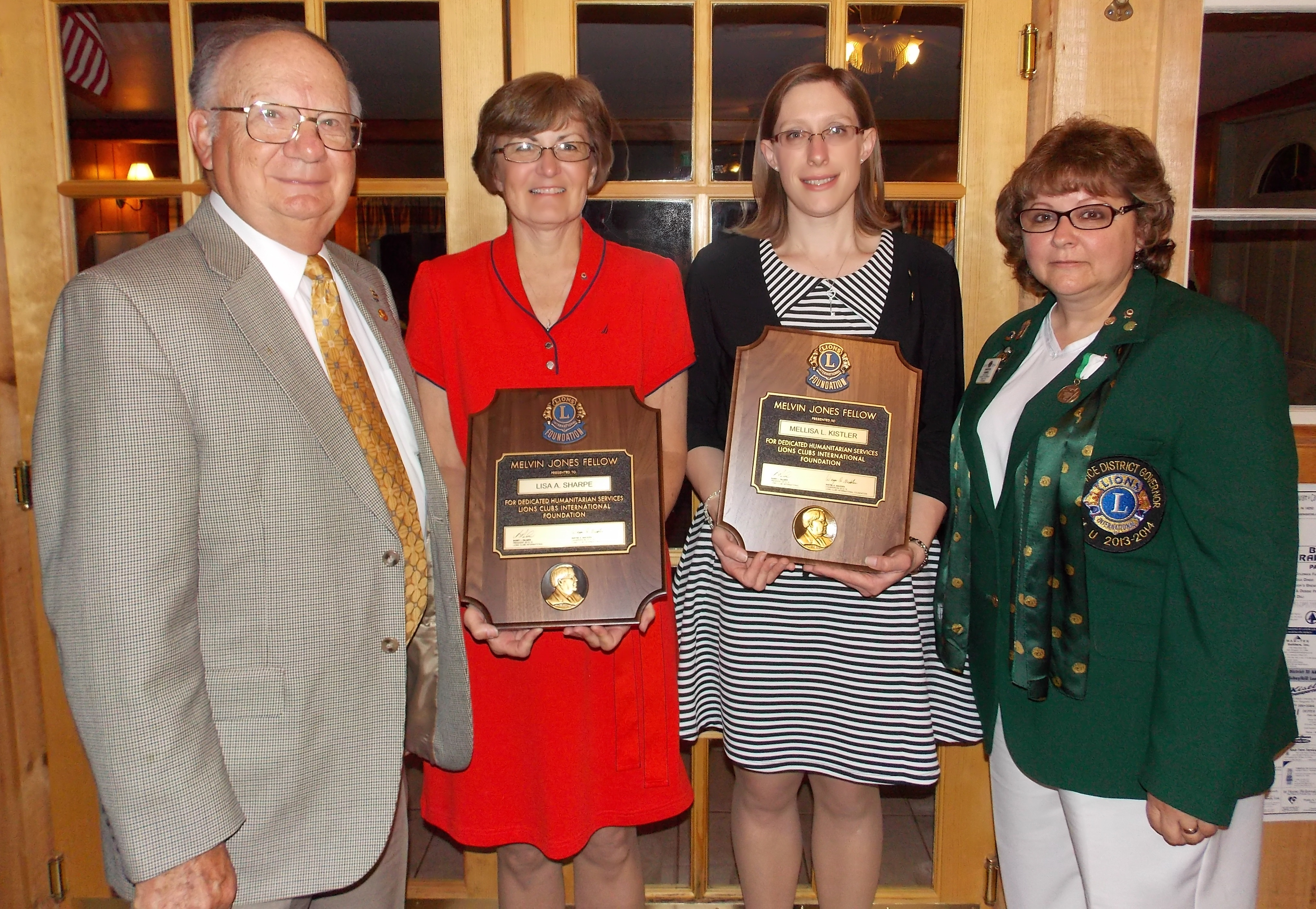 Lioness Officers and Directors for 2014-2015 pictured from back left are Becky Neumoyer, Geraldine Balliet, Ann Fedor and Jean Swartz. From back left are Marie Barth, Marie Gursky, Barbara Lushia, Becky Zehner and Installing Officer, District Governor Elect Sharon Kimmel.Two members also received awards during the installation. Pictured from left are Past International Director Bob Miller, Melvin Jones Fellowship Recipient Lion Lisa Sharpe, Melvin Jones Fellowship Recipient Lion Melissa Kistler and District Governor Elect Sharon Kimmel.