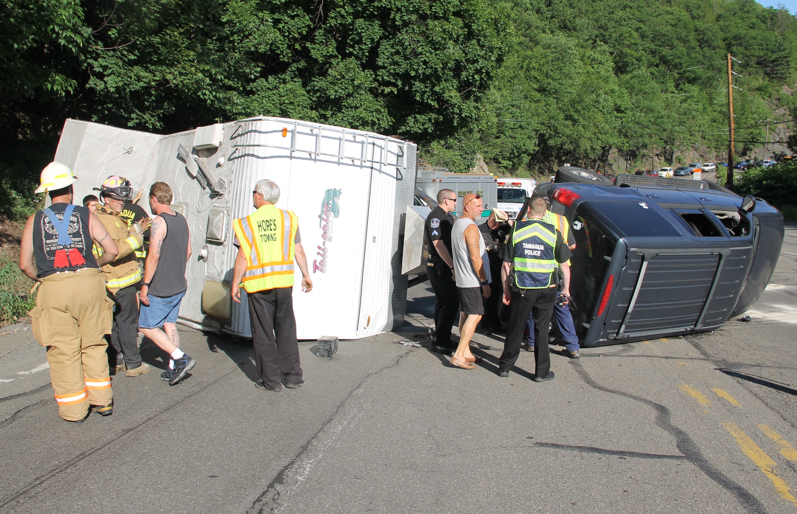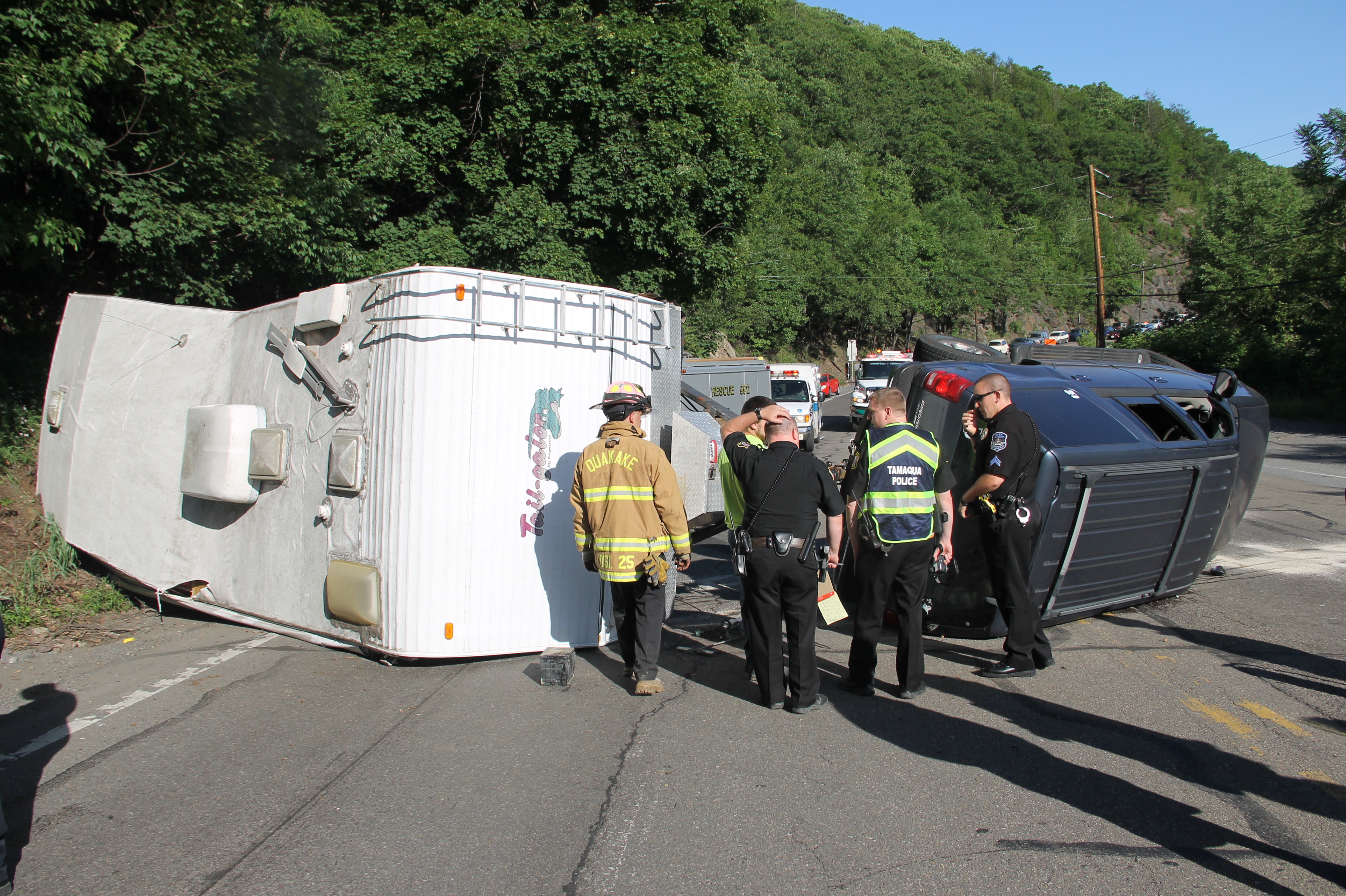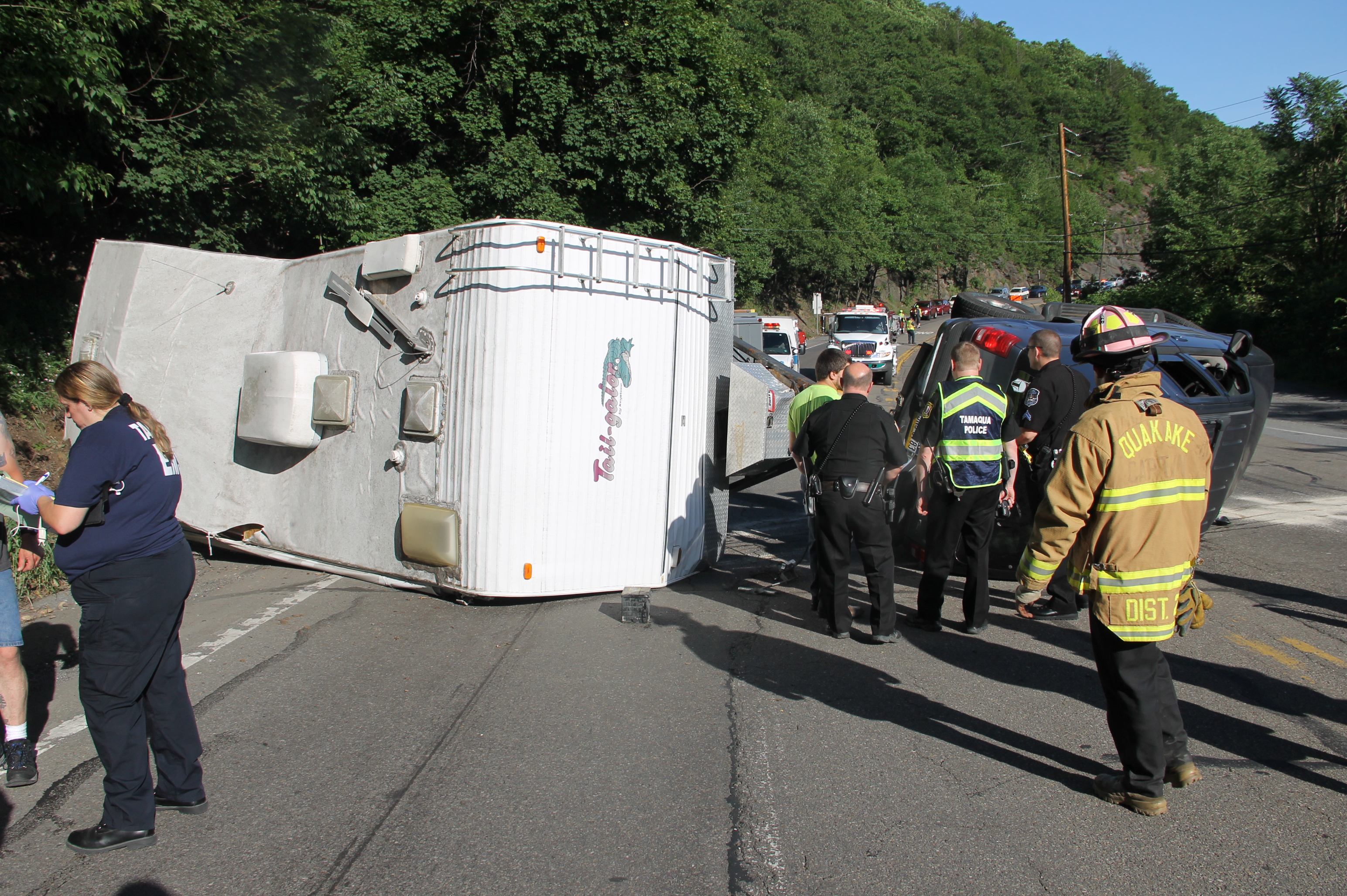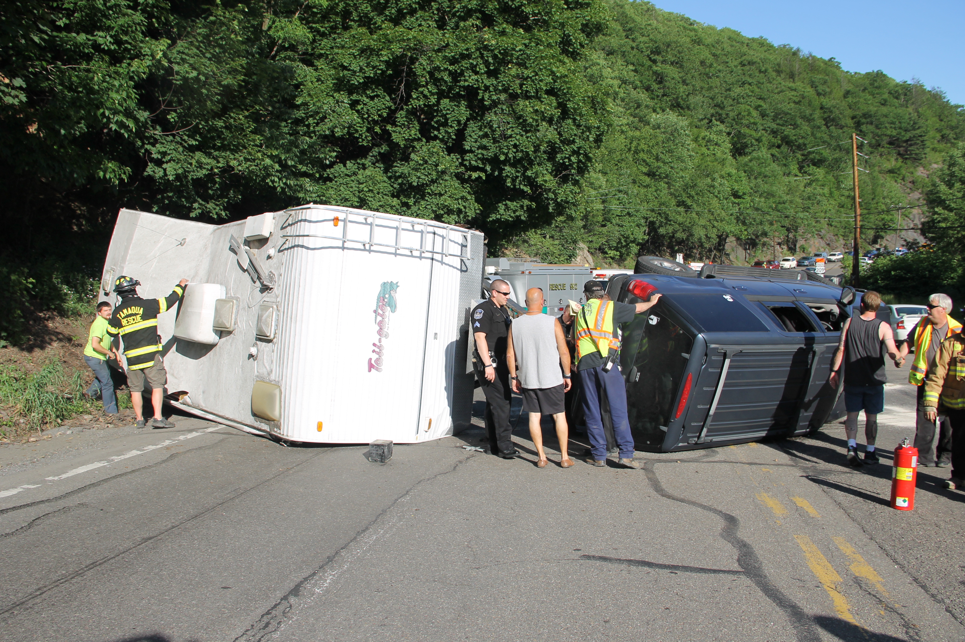 A Tamaqua family and their 7 pets escaped serious injury after their SUV and attached travel-trailer overturned around 6 PM today (Wednesday, June 18, 2014) at the bottom of the Hometown Hill (SR309) in Tamaqua.