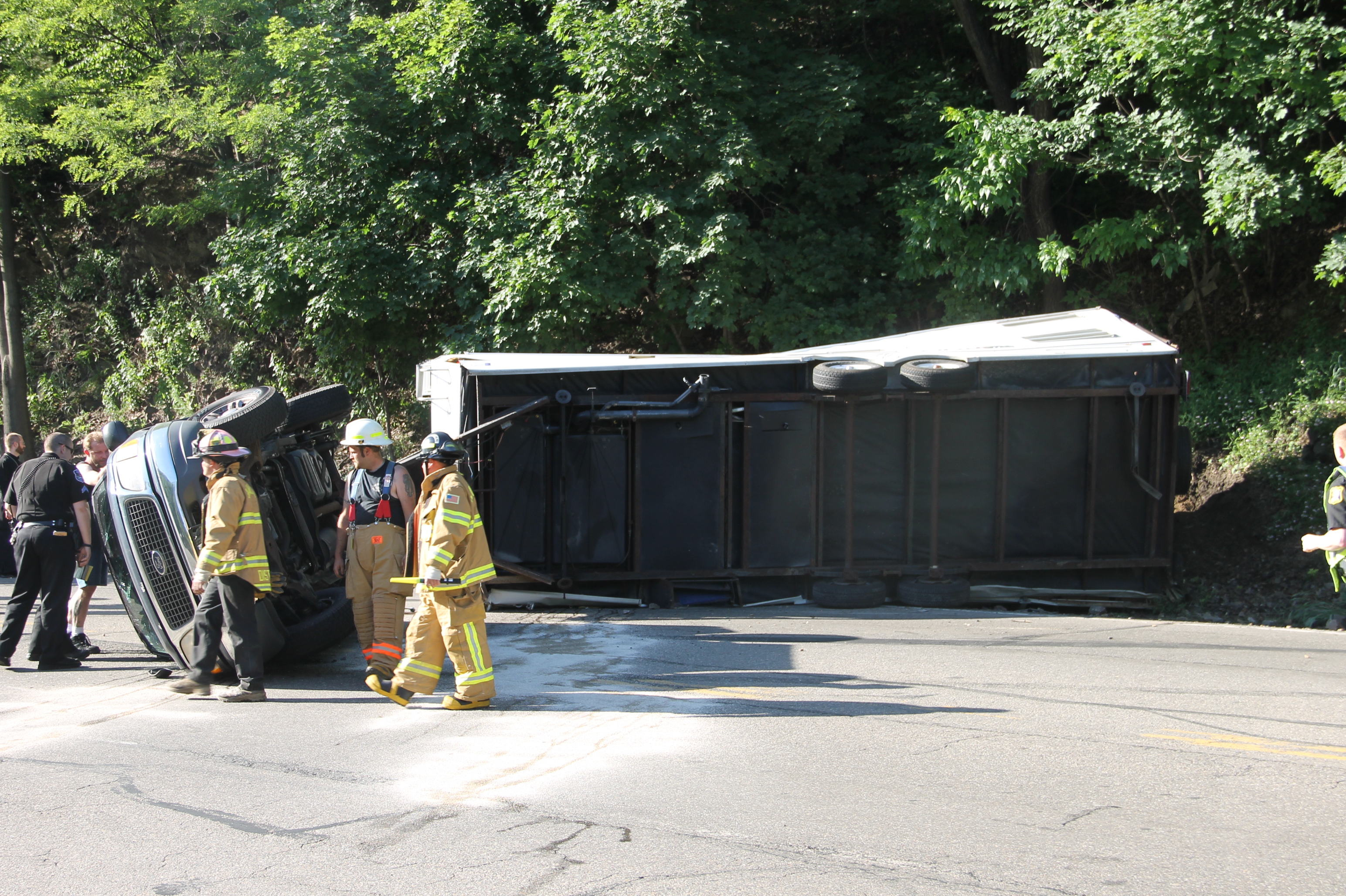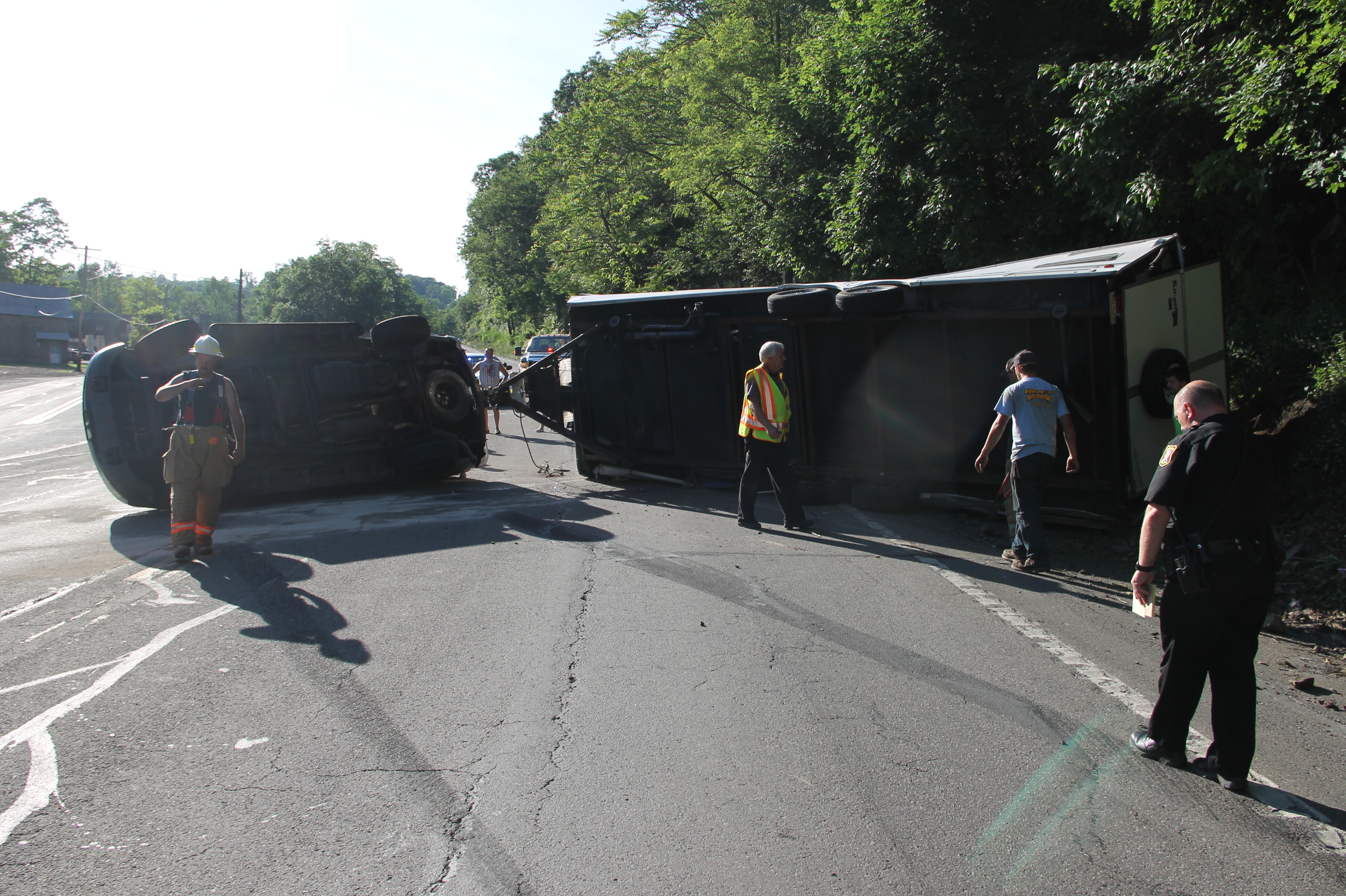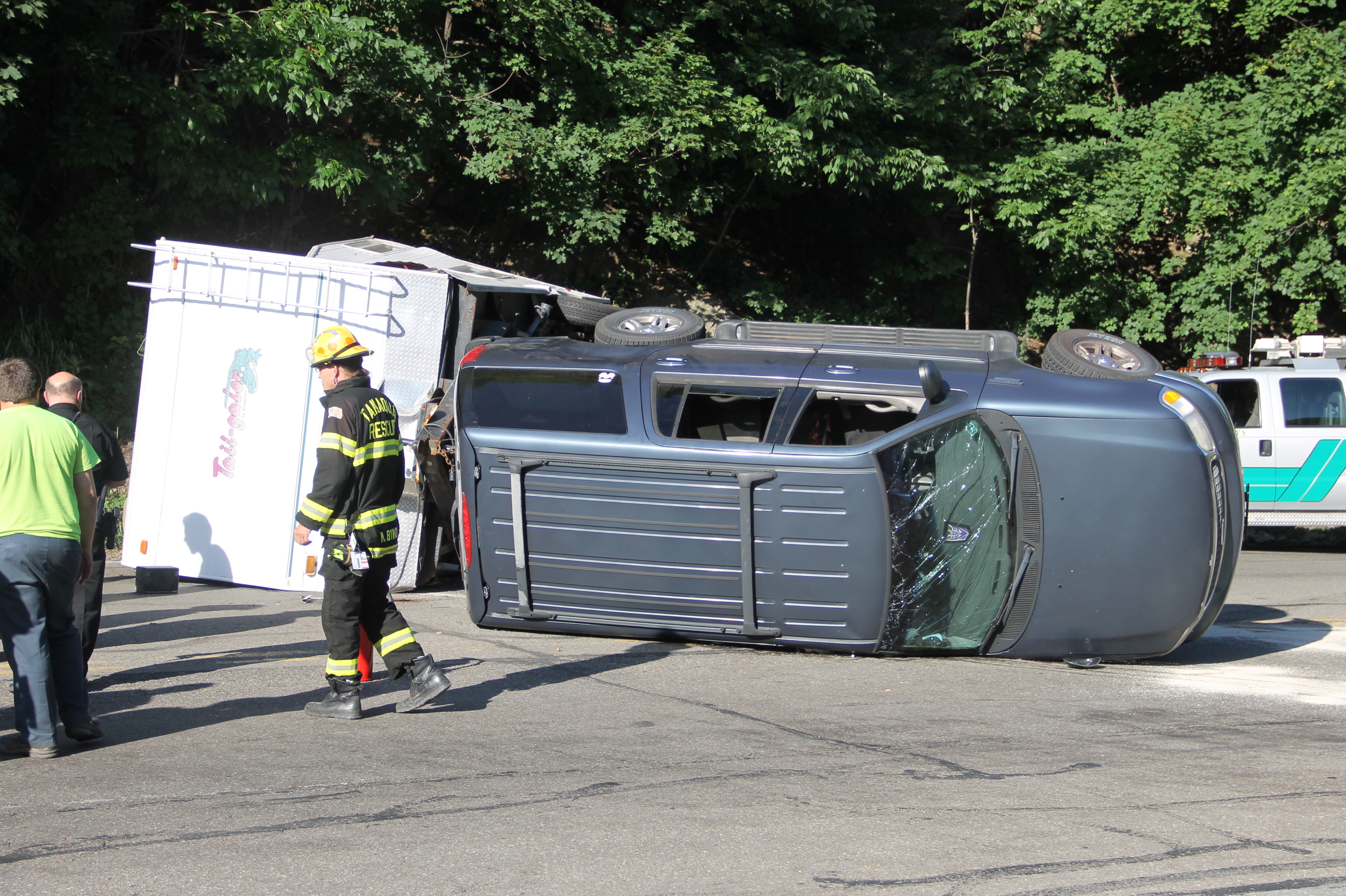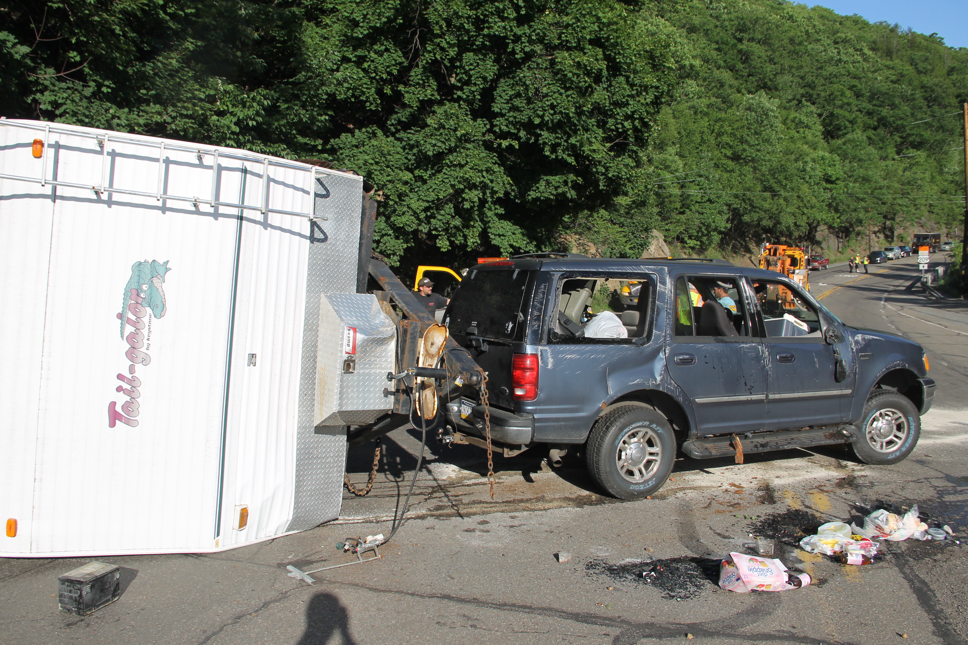 A Tamaqua family and their 7 pets escaped serious injury after their SUV and attached travel-trailer overturned around 6 PM today (Wednesday, June 18, 2014) at the bottom of the Hometown Hill (SR309) in Tamaqua.