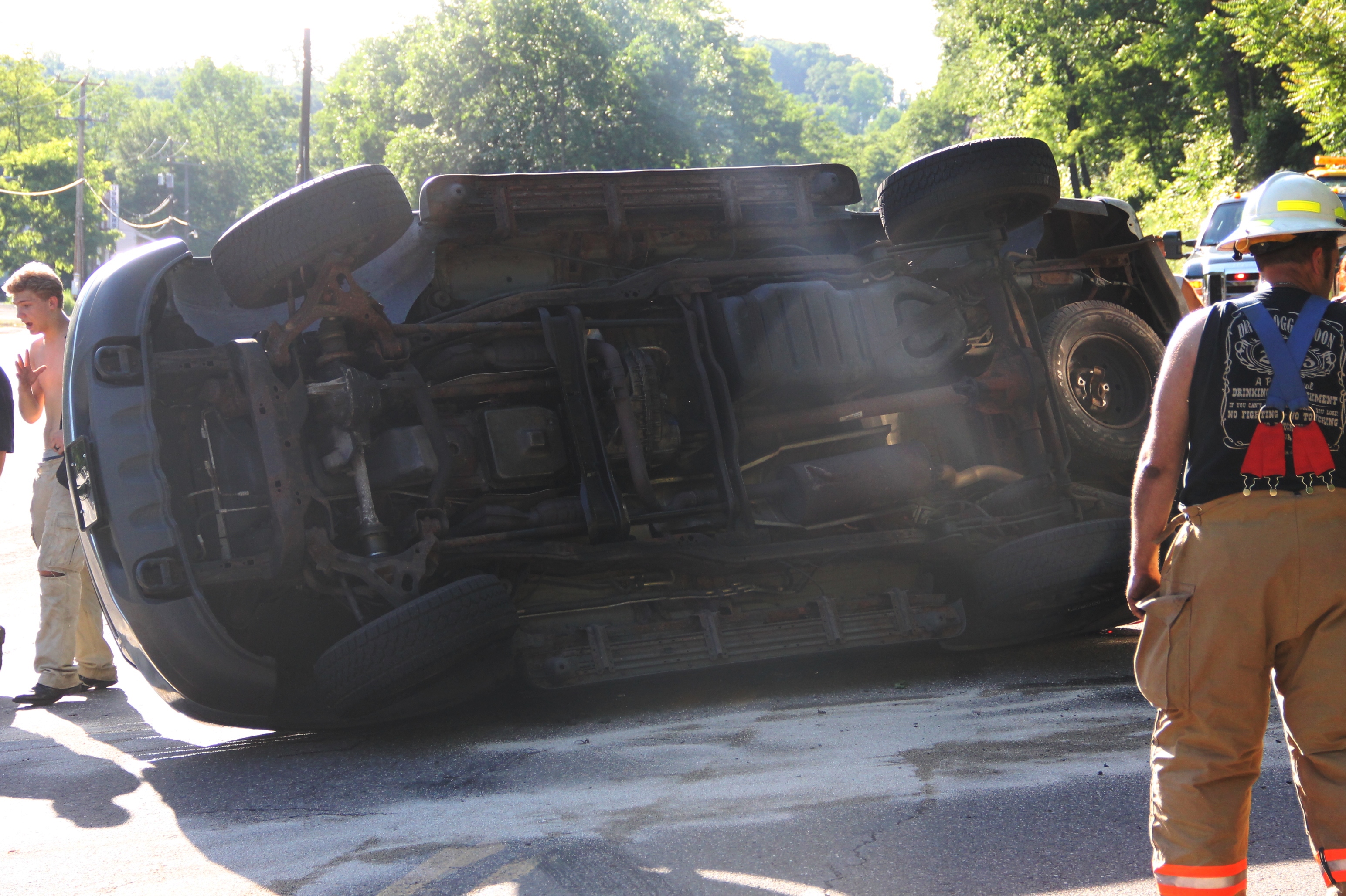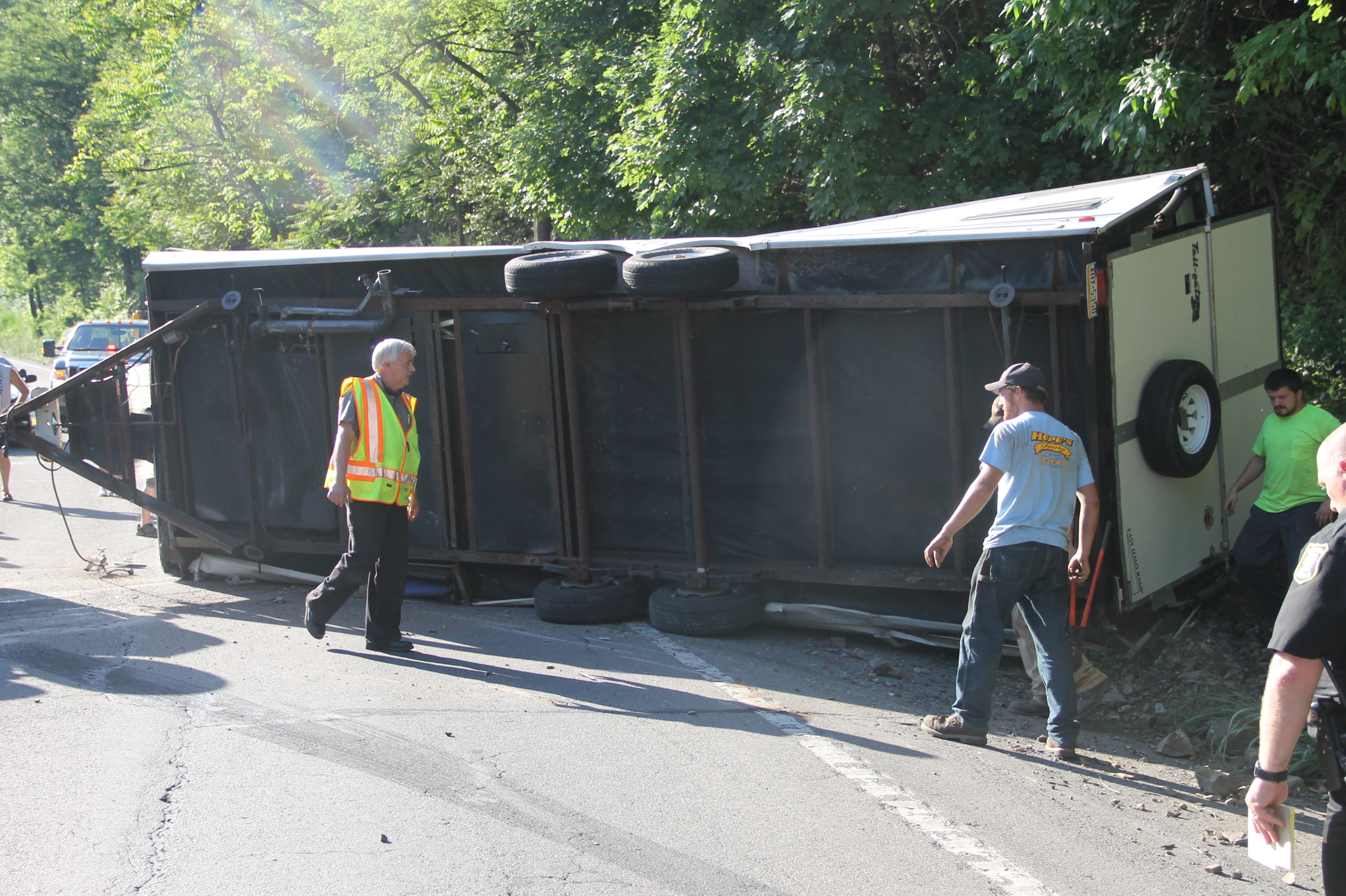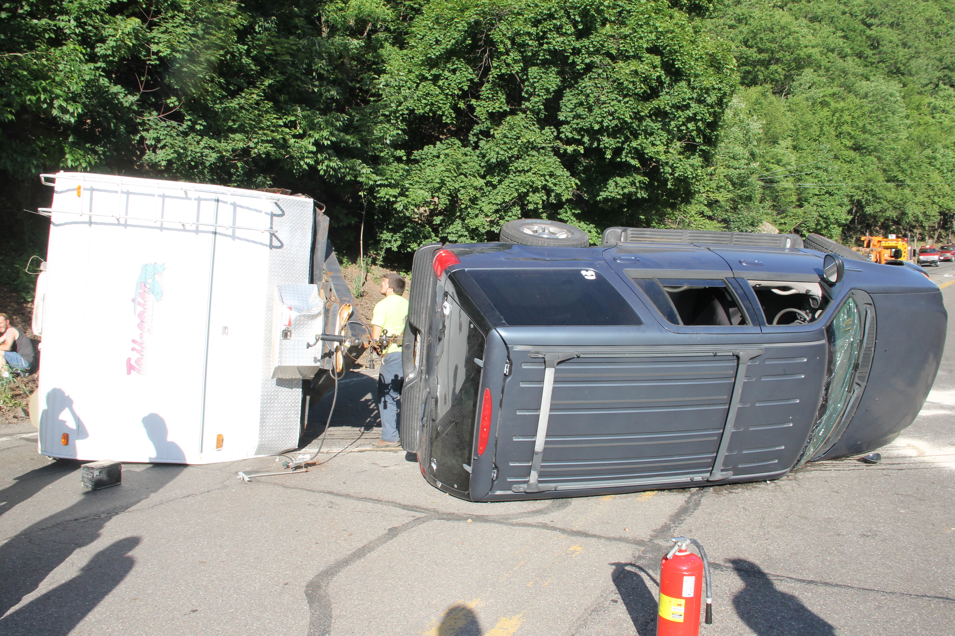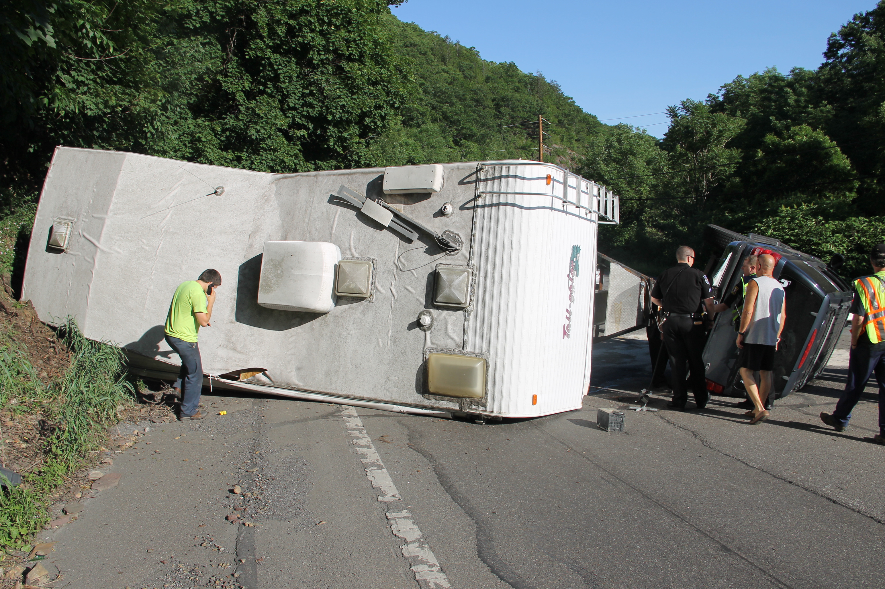 A Tamaqua family and their 7 pets escaped serious injury after their SUV and attached travel-trailer overturned around 6 PM today (Wednesday, June 18, 2014) at the bottom of the Hometown Hill (SR309) in Tamaqua.