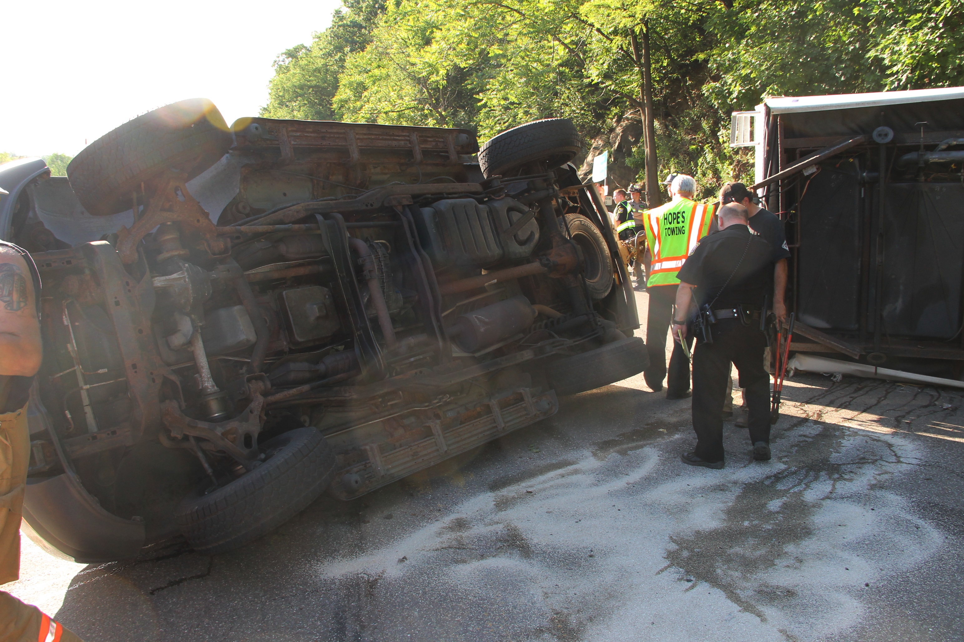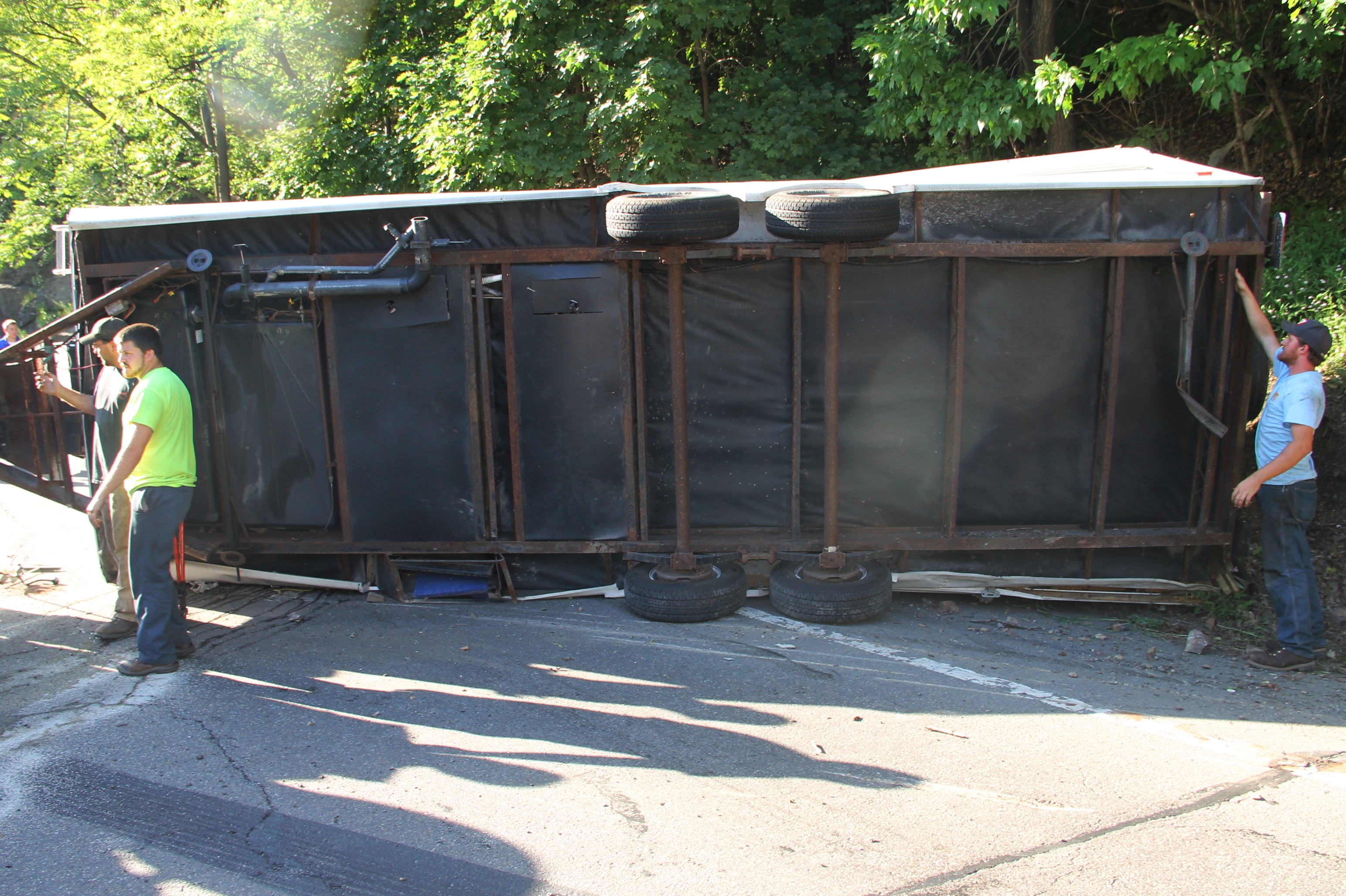 While carefully going around the turn, the driver, Jamie Marcum, felt the trailer beginning to lose control. While trying to regain control of the vehicle, the trailer flipped and due to the trailer hitch, quickly pulled their truck on its side smashing the windshield and the side doors. The passengers Sherrelynn Mercer Marcum, Jamie Marcum, Anthony LostSoul Lionsaber (Anthony Marcum), who were all wearing their seat belts, as well as all of their animals, which were miraculously unharmed during the entire process, are somehow completely okay with only minor scrapes and bruises to the family. A big thanks goes out to the huge help of the animal rescue team, Andrew Leibenguth, the Tamaqua police, Tamaqua ambulance, the clean up crew, and Hopes towing. The Marcum family lost just about everything today but are just thankful to be alive. Many tears were shed today in leu of the situation but surrounded by a team of friends, family, and the support of our local community, we were able to take care of everything and most importantly, everyone. Thank the heavens!