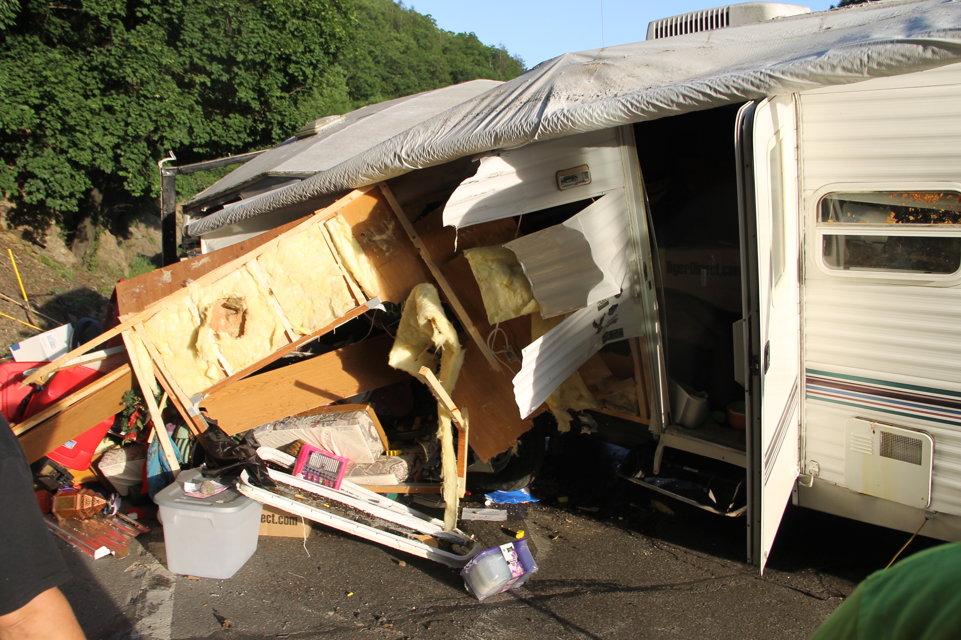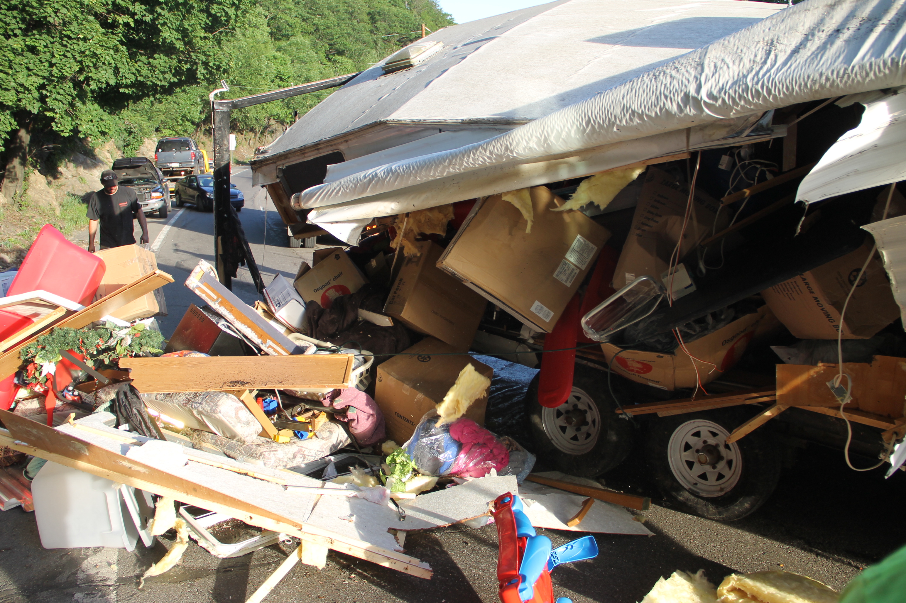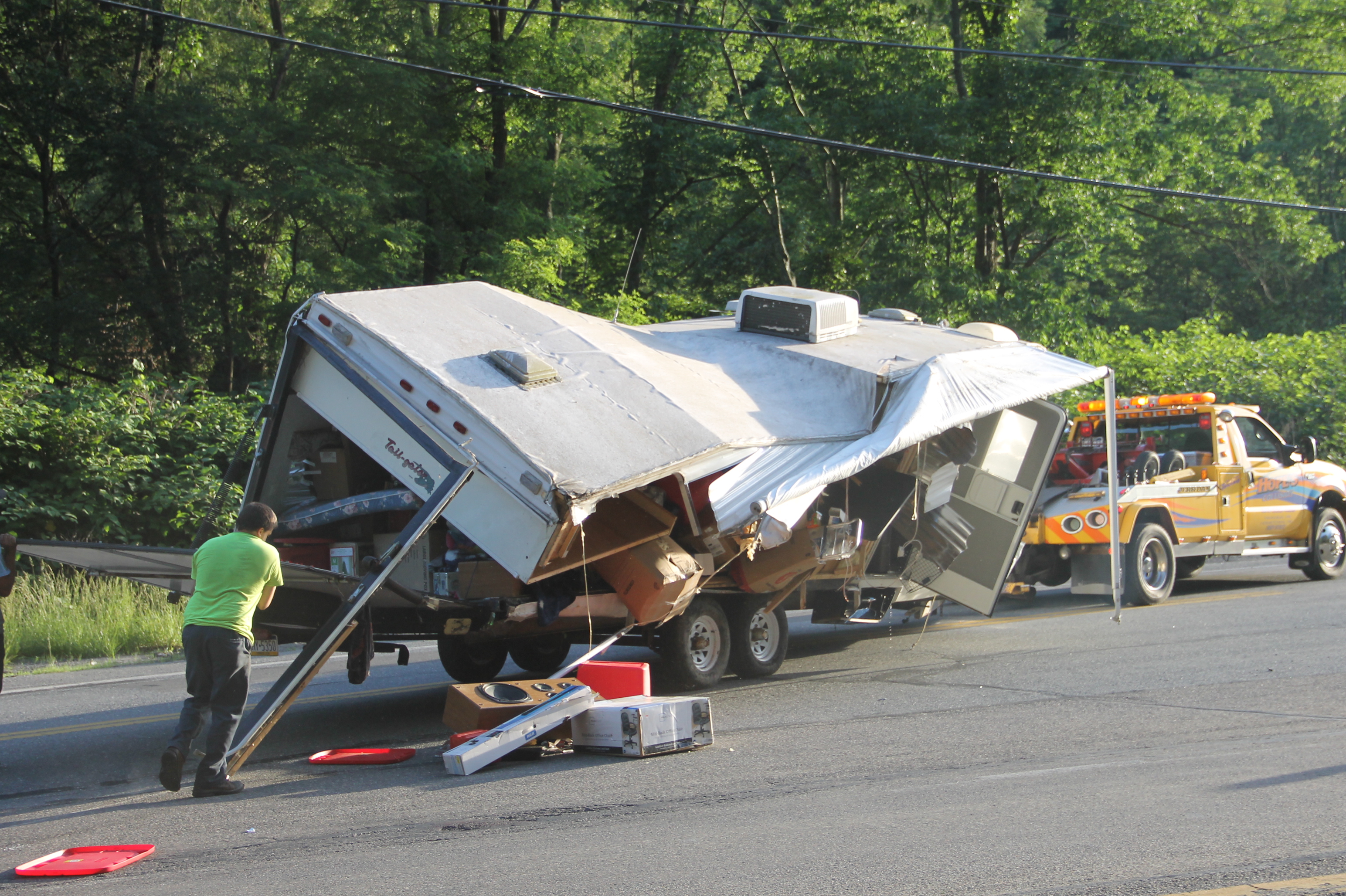 The father, who recently purchased the trailer, told police that they were in the process of moving to Texas, when their overloaded camper started to lean while traveling north up Hometown Hill. He added that, despite trying to compensate, he was unable to prevent it from overturning.