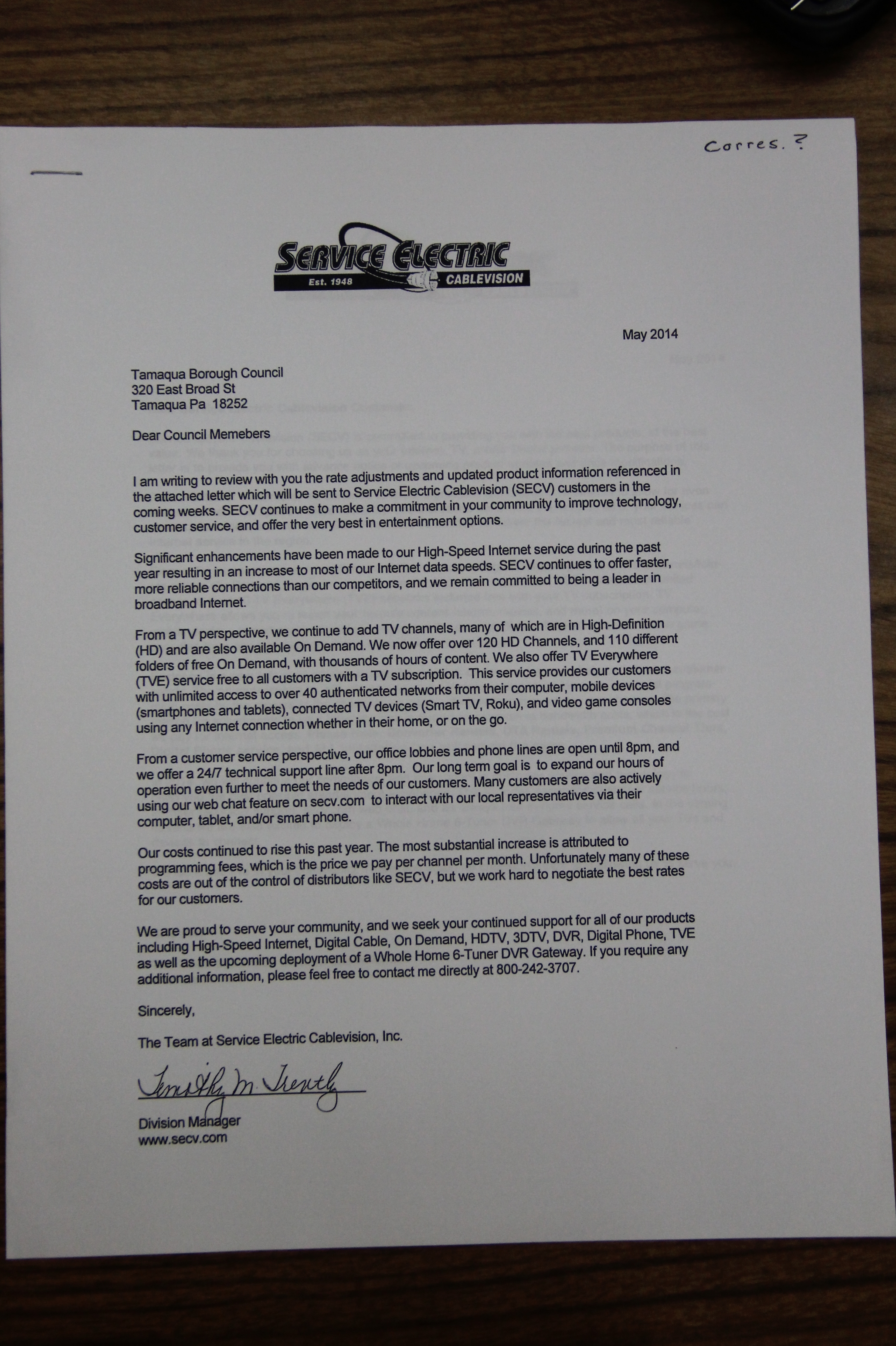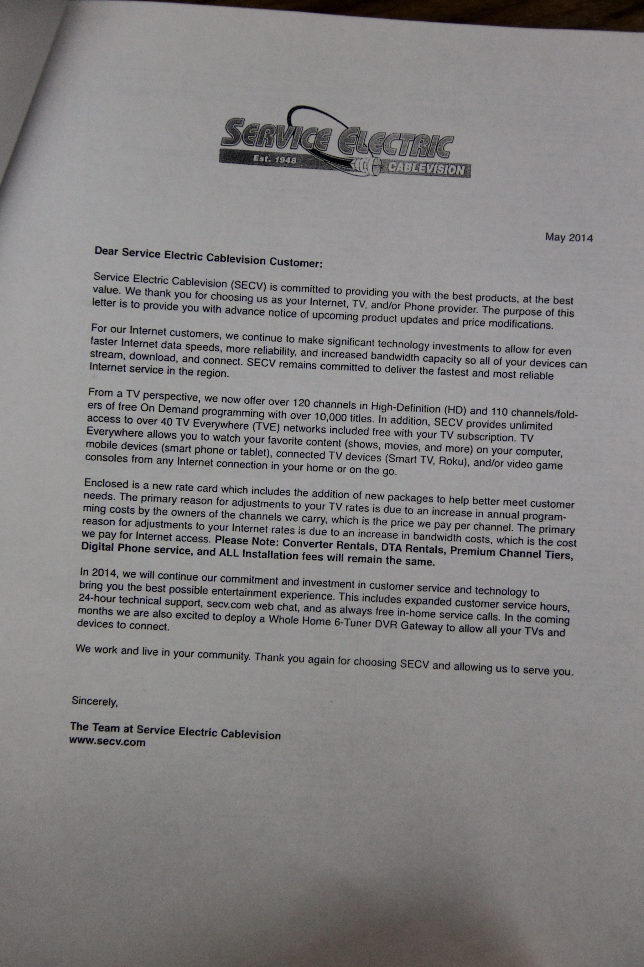 – Correspondence was read concerning a letter from Service Electric regarding new rates. (see photos).