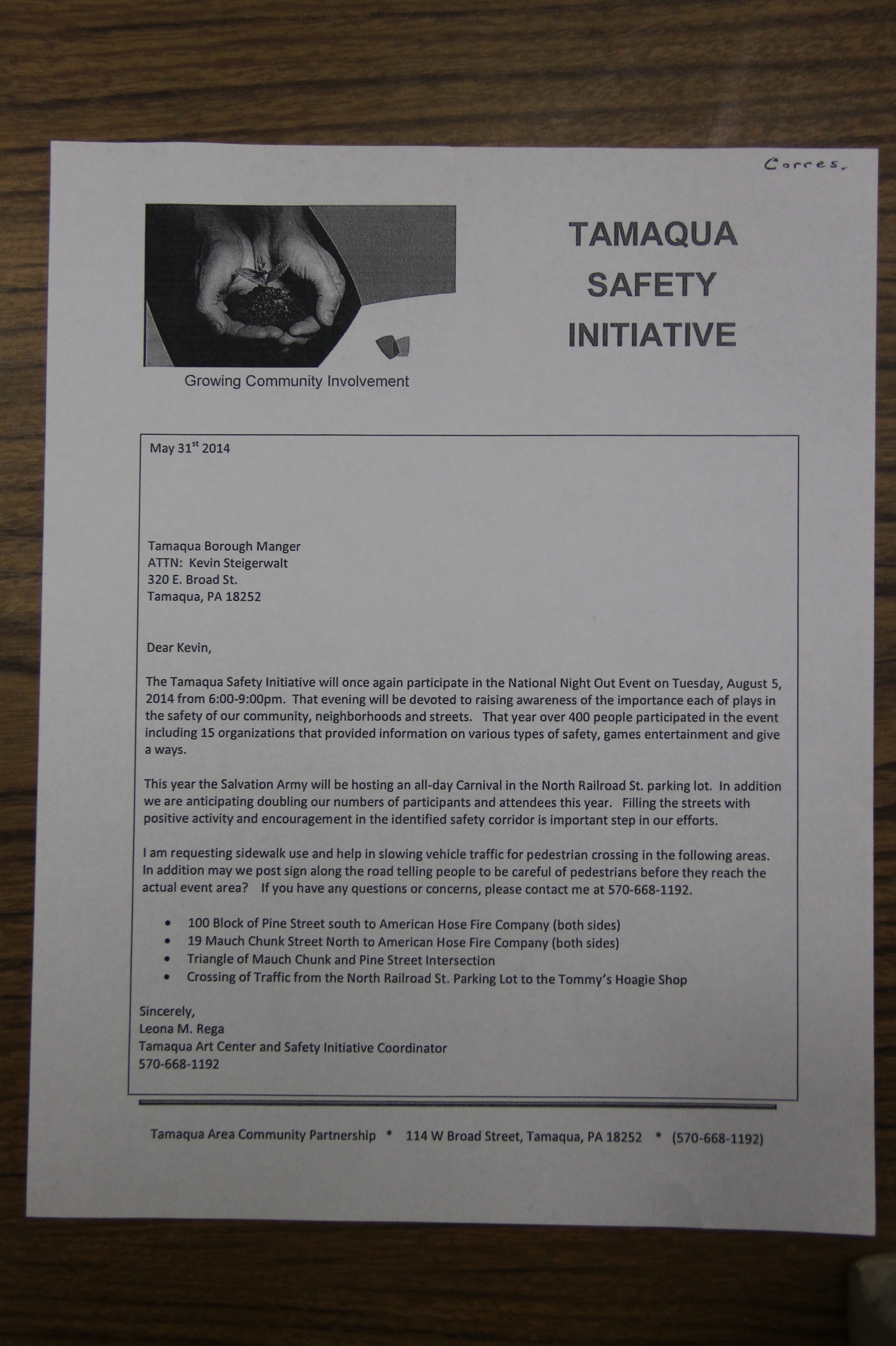 – Correspondence was read concerning National Night Out (Pine Street) and the Tamaqua Salvation Army’s Kidz Karnival (North Railroad Street parking lot) set for August 5, 2014.