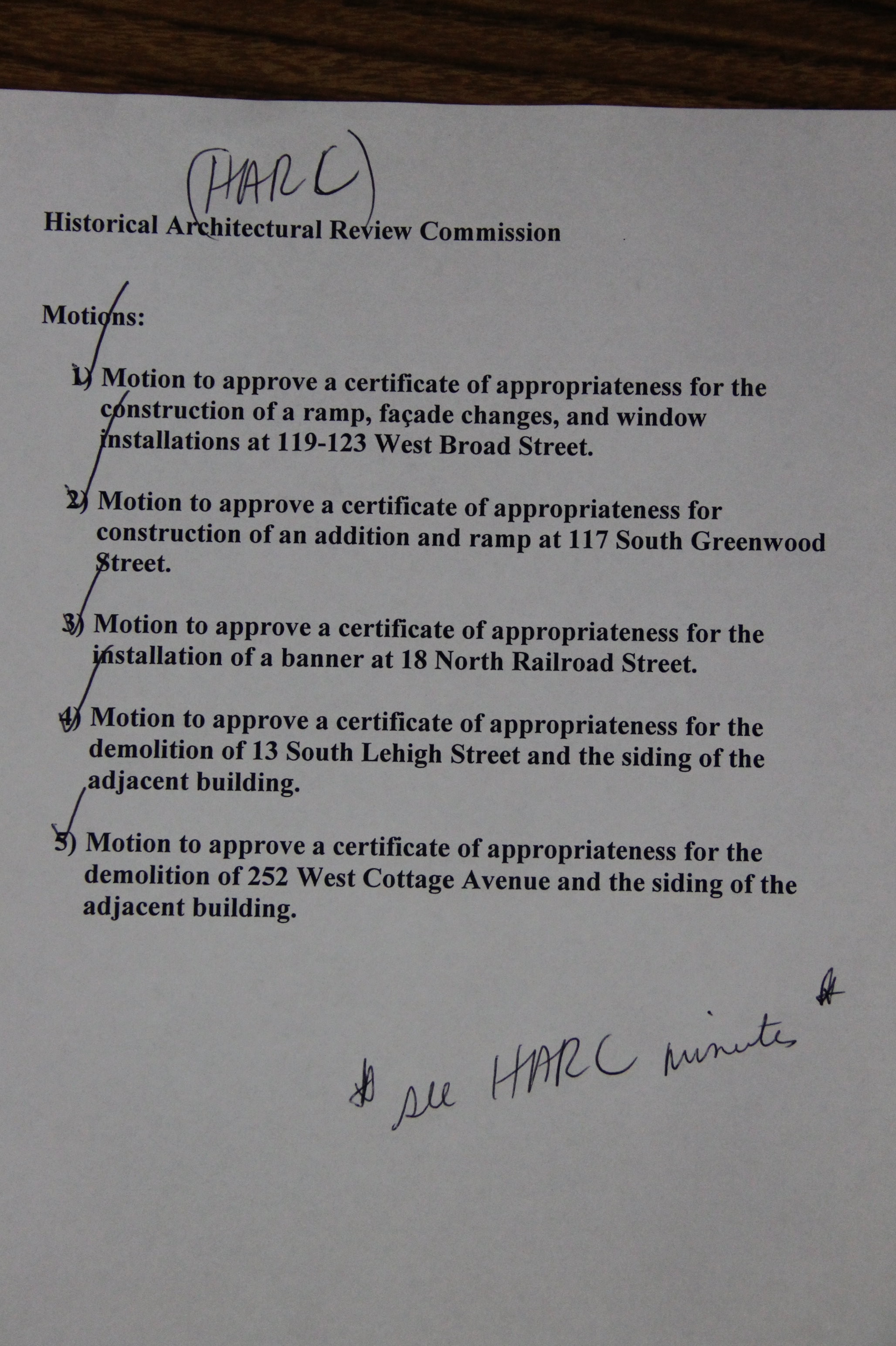 —— 4. Motion to approve a certificate of appropriateness for the demolition of 13 South Lehigh Street and the siding of the adjacent building. It was approved.