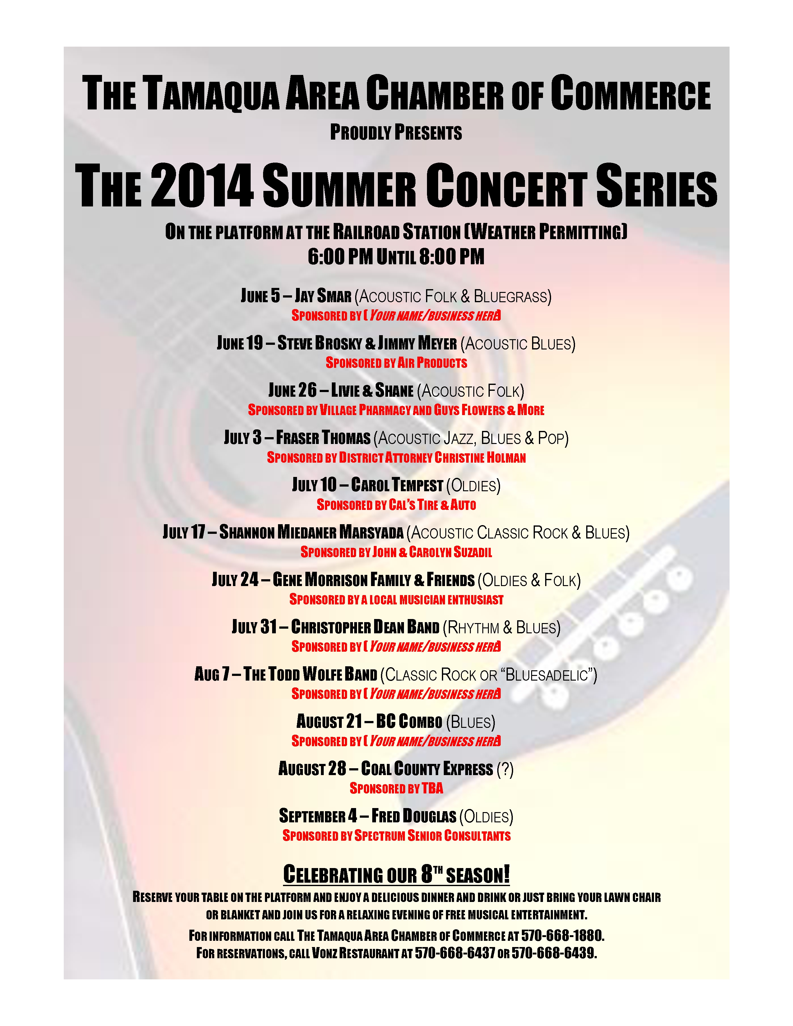 July 31, 2014 – Christopher Dean Band (rhythm, blues) – Sponsored by ________ your name. (call 570-668-1880)