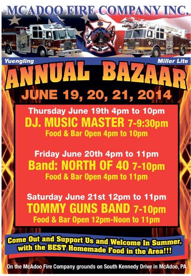 Members and volunteers with the McAdoo Fire Company are holding their Annual Bazaar today (Thursday, June 19, 2014), Friday and Saturday.