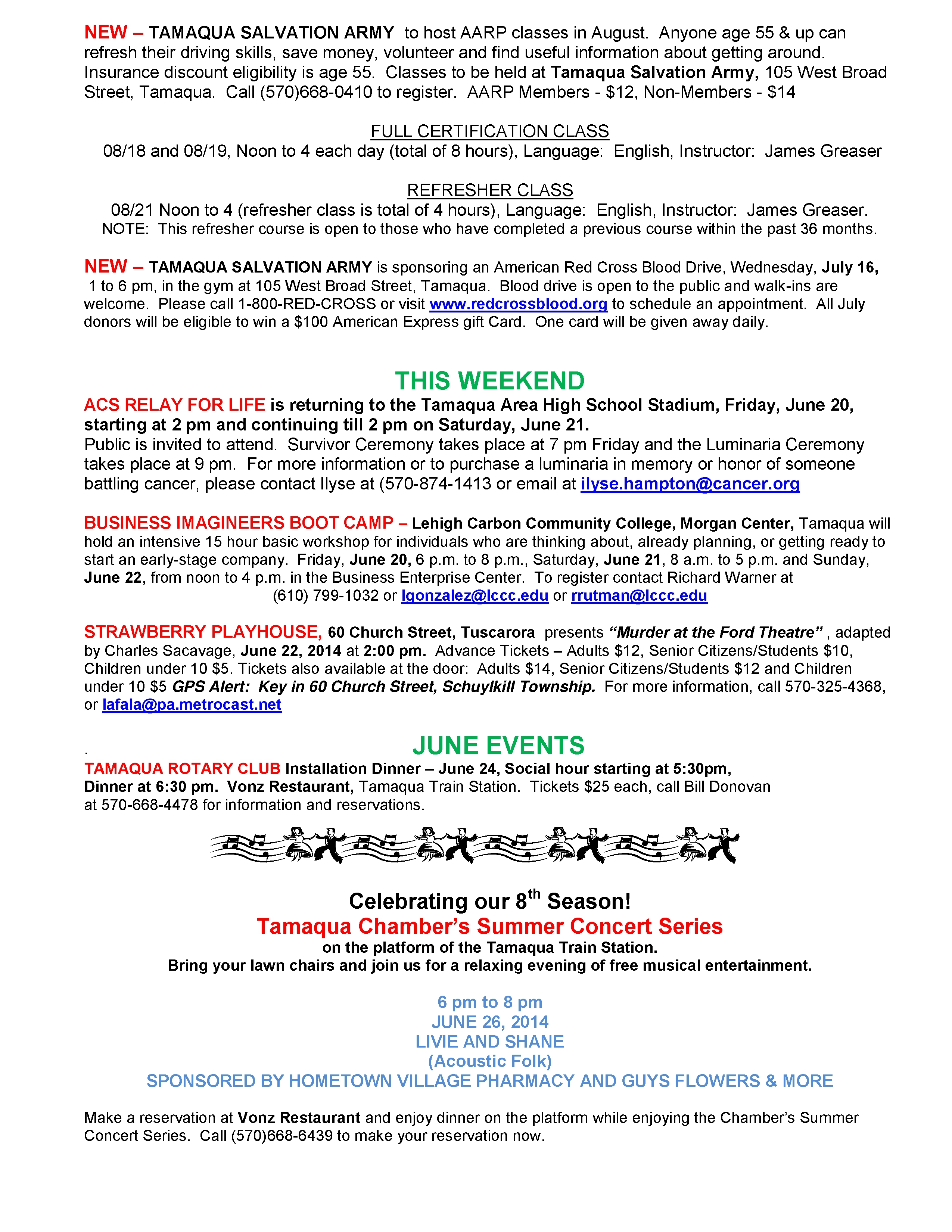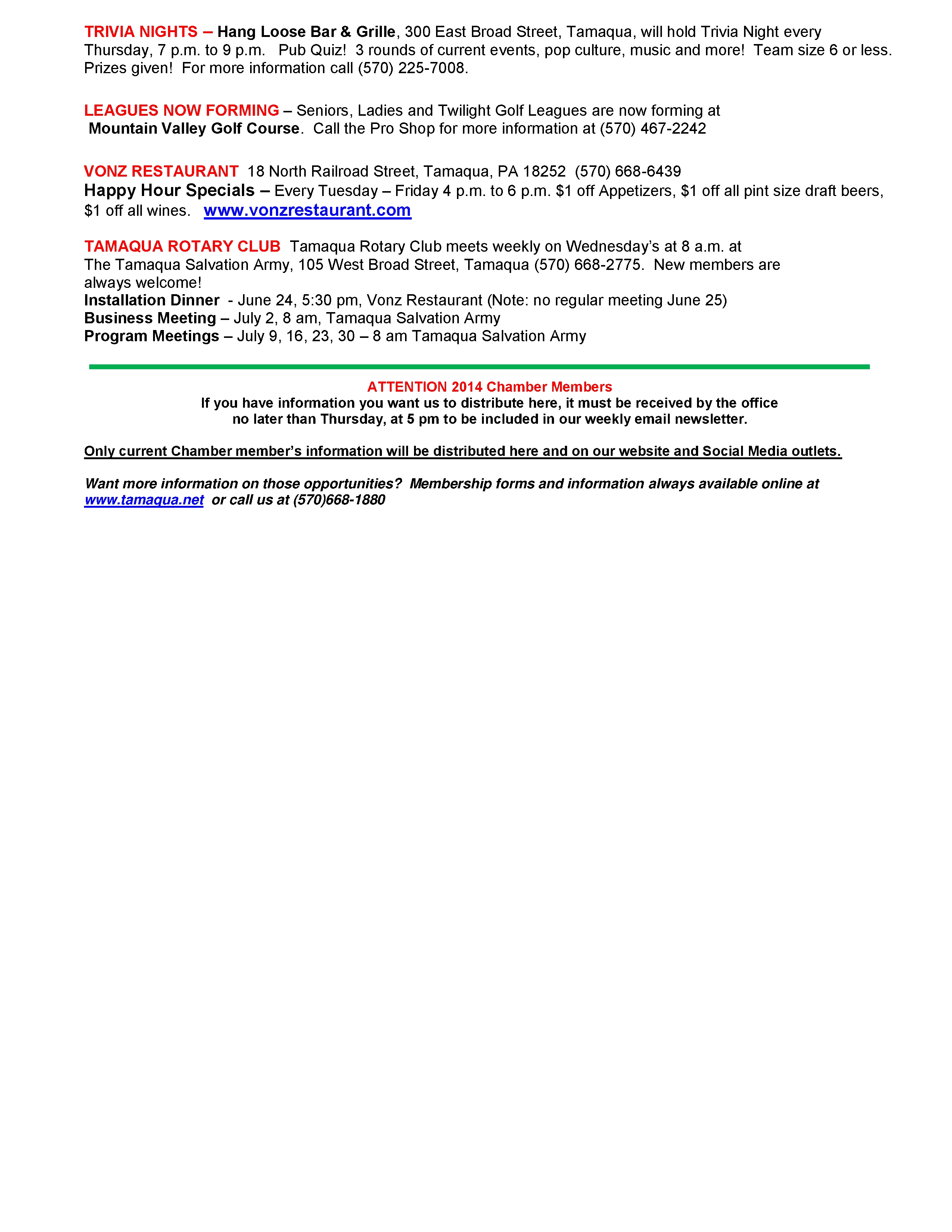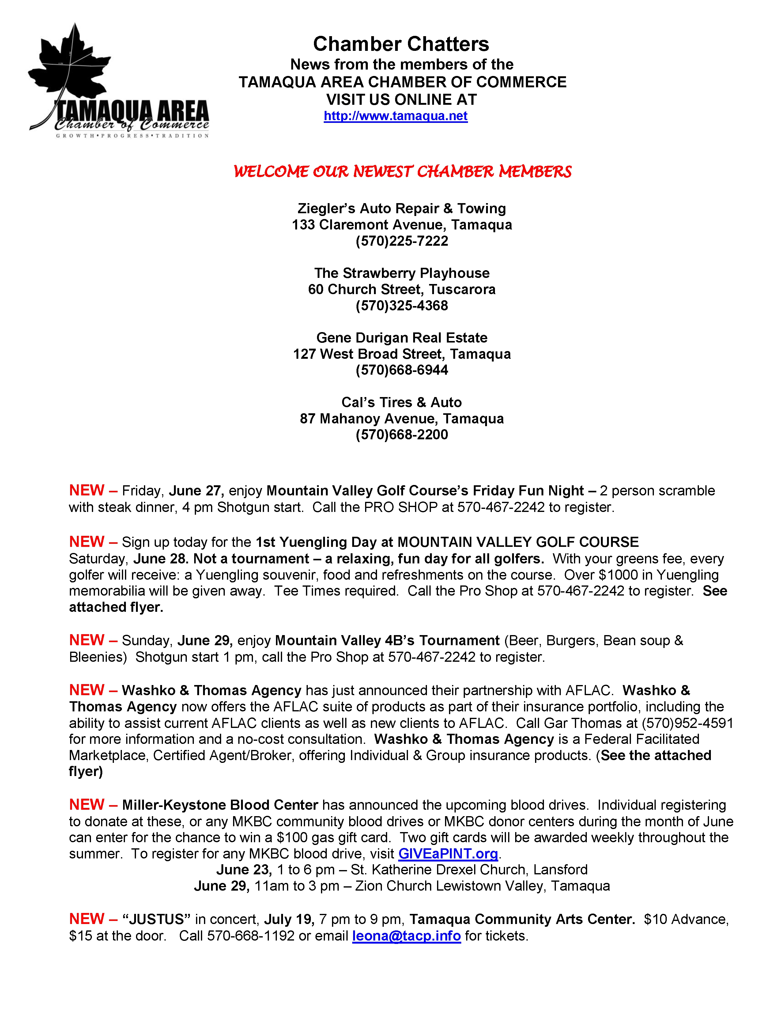 Here is the latest Tamaqua Area Chamber of Commerce’s Chamber Chatters newsletter – dated Friday, June 20, 2014. For more information about the Chamber or to volunteer, stop by their office during the week at 114 West Broad Street, call (570) 668-1880 or visit them online at www.tamaqua.net.