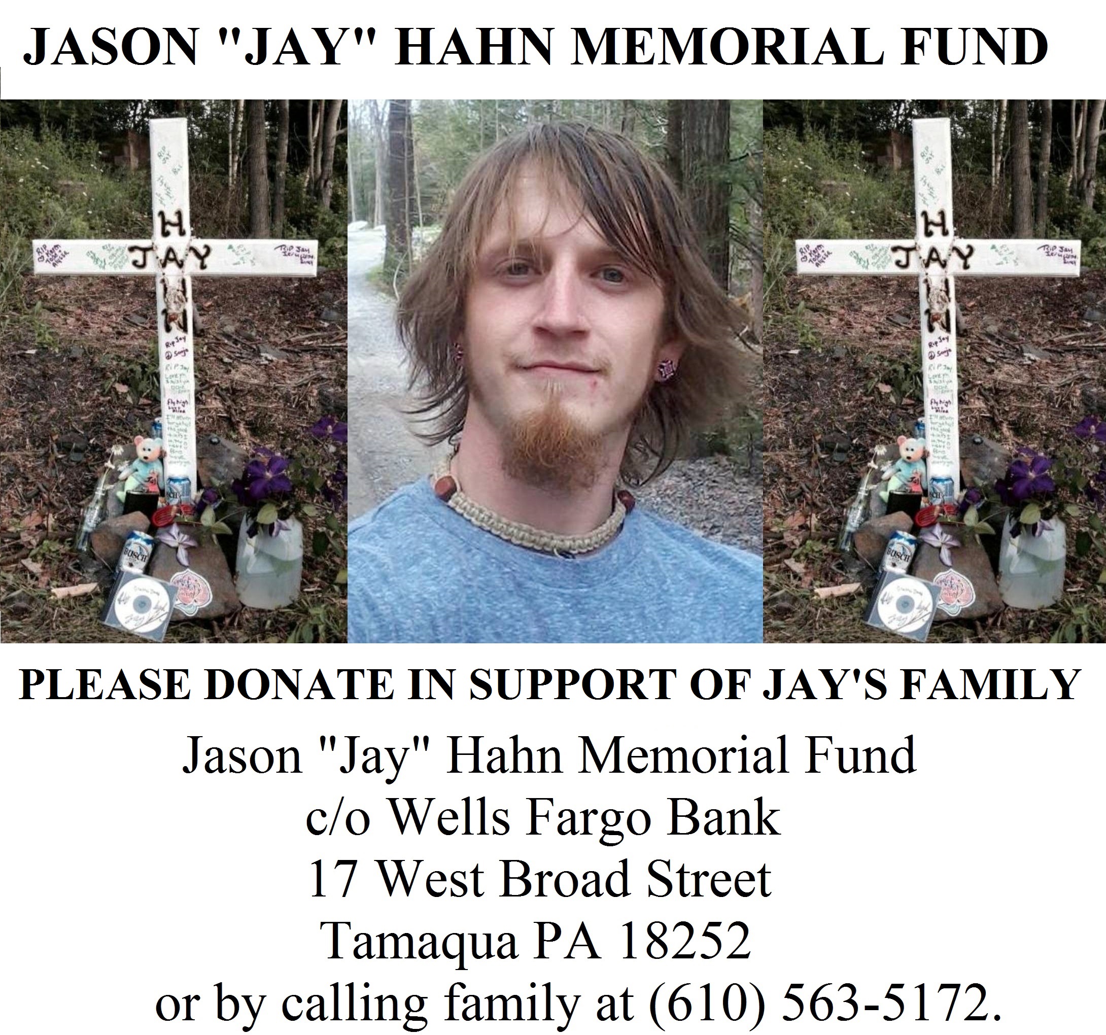 Donations can be made to”Jason J. Hahn Memorial Fund” c/o Wells Fargo Bank, 17 West Broad Street, Tamaqua PA 18252 or by contacting Alice Hahn at (610) 563-5172.