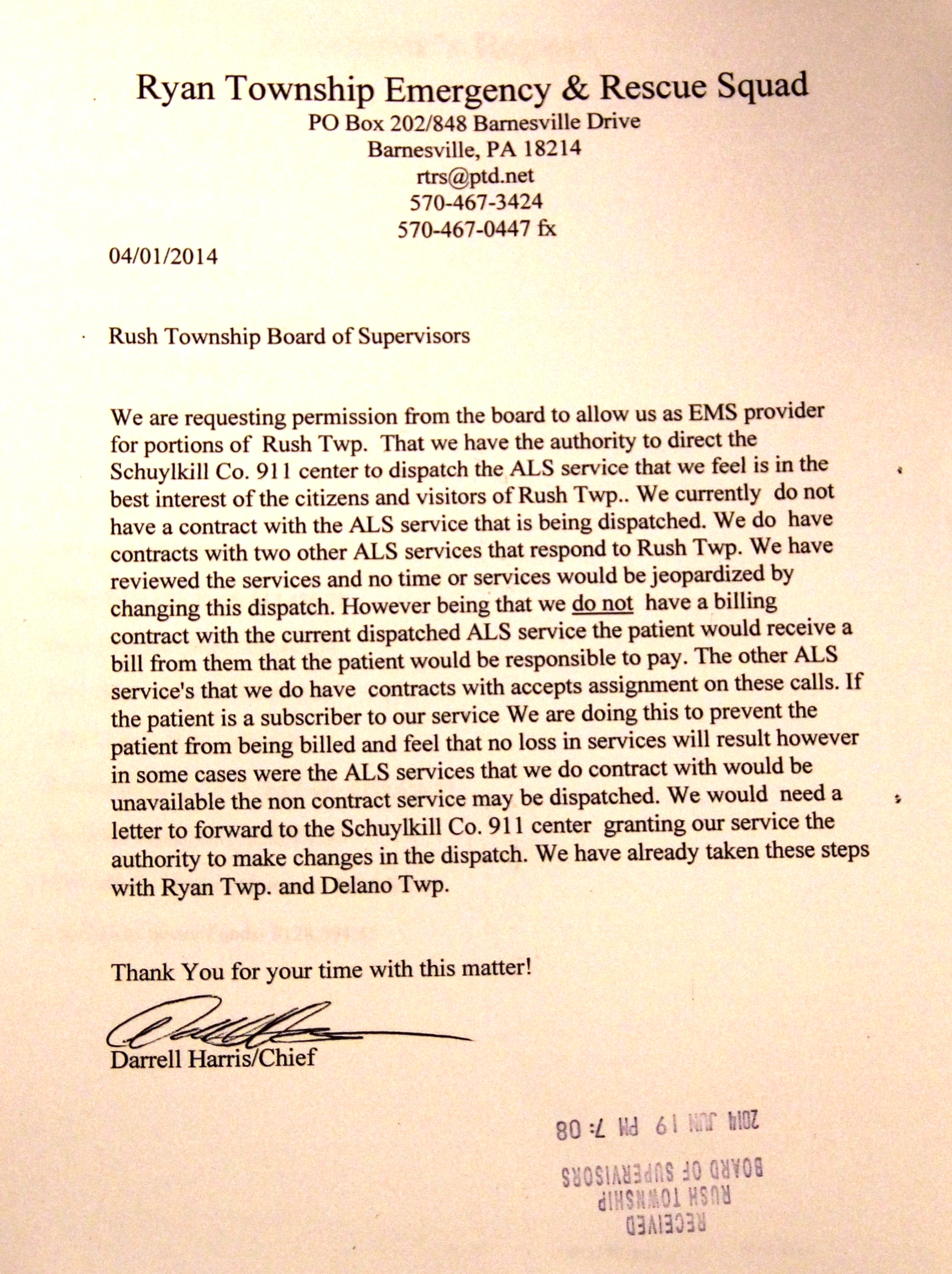 The secretary read correspondence from the Ryan Township Emergency & Rescue Squad to allow them as EMS provide for portions of Rush Township. The letter continues. (See image below.)