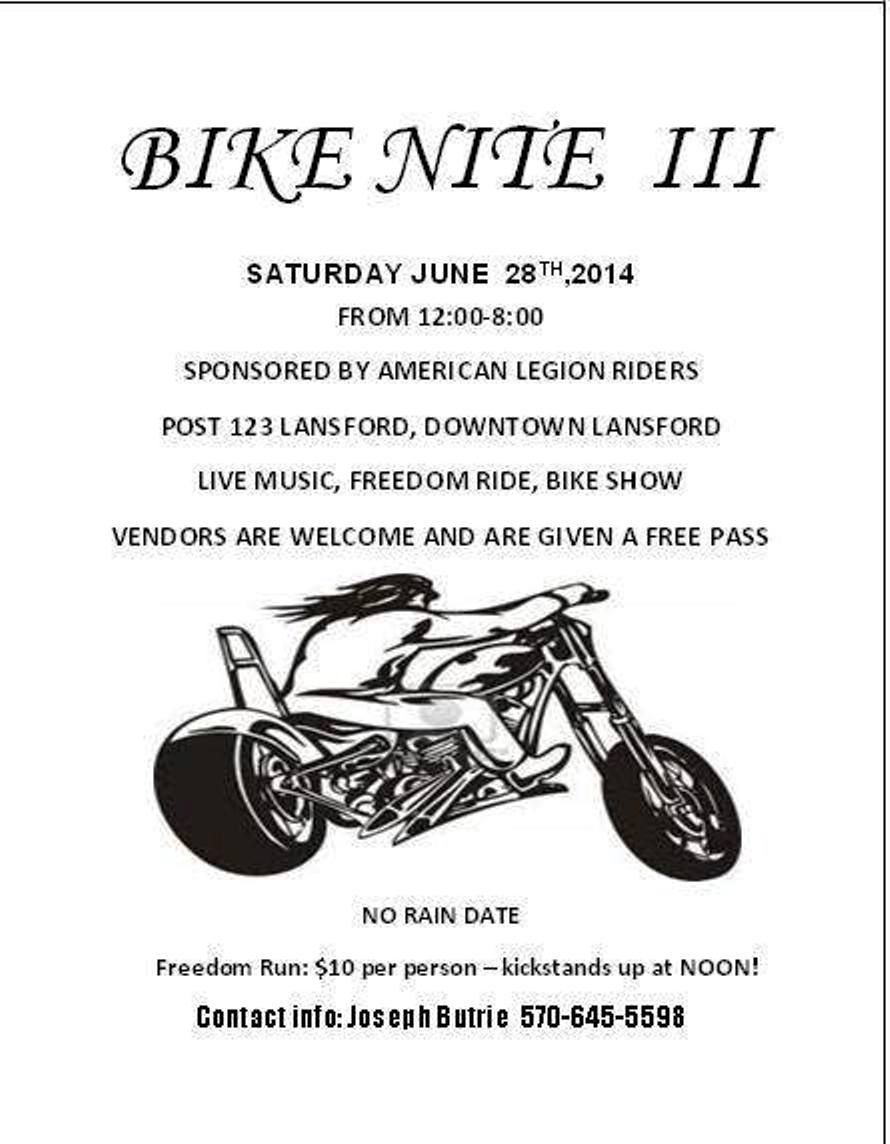Members of the Lansford American Legion Post 123 and Downtown Lansford are holding their 3rd Annual Bike Nite event today (Saturday, June 28, 2014) on West Ridge Street in Lansford.