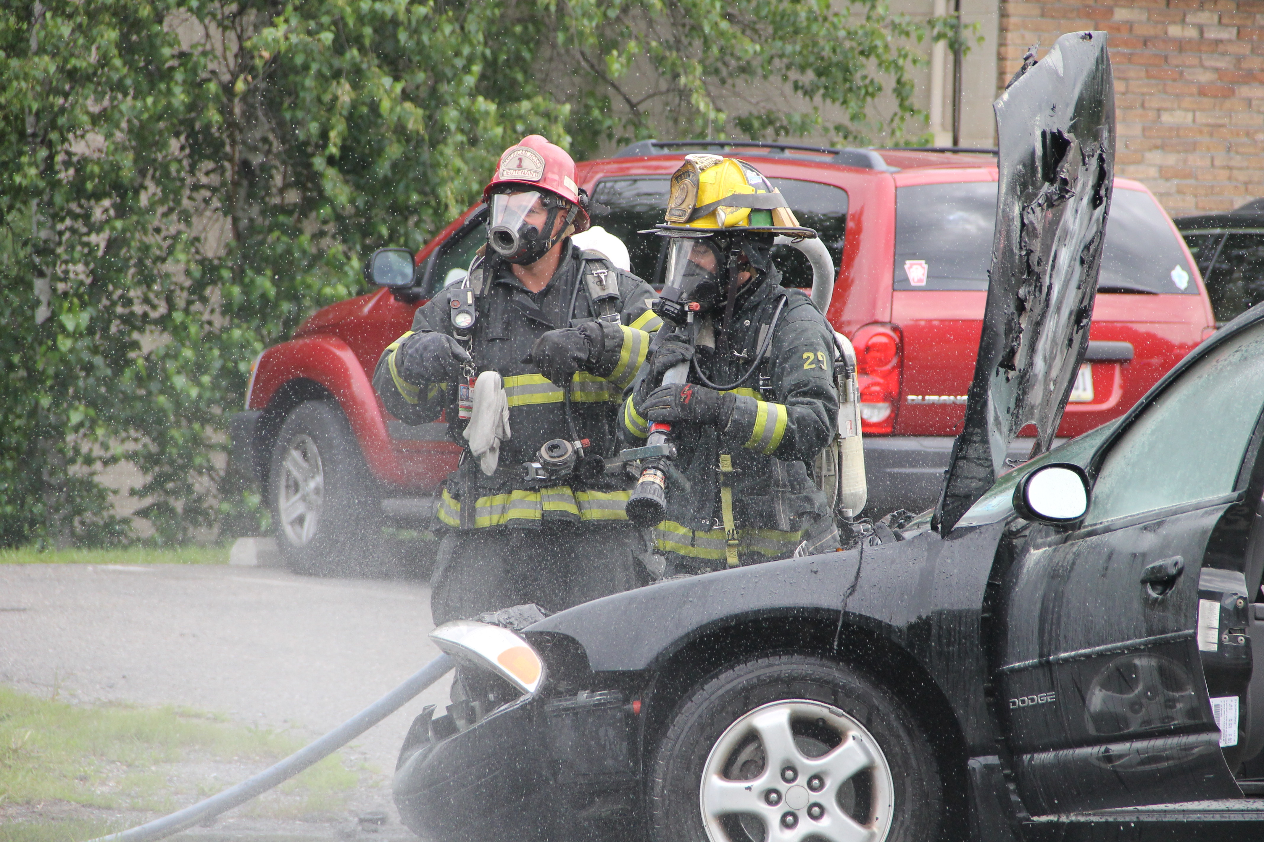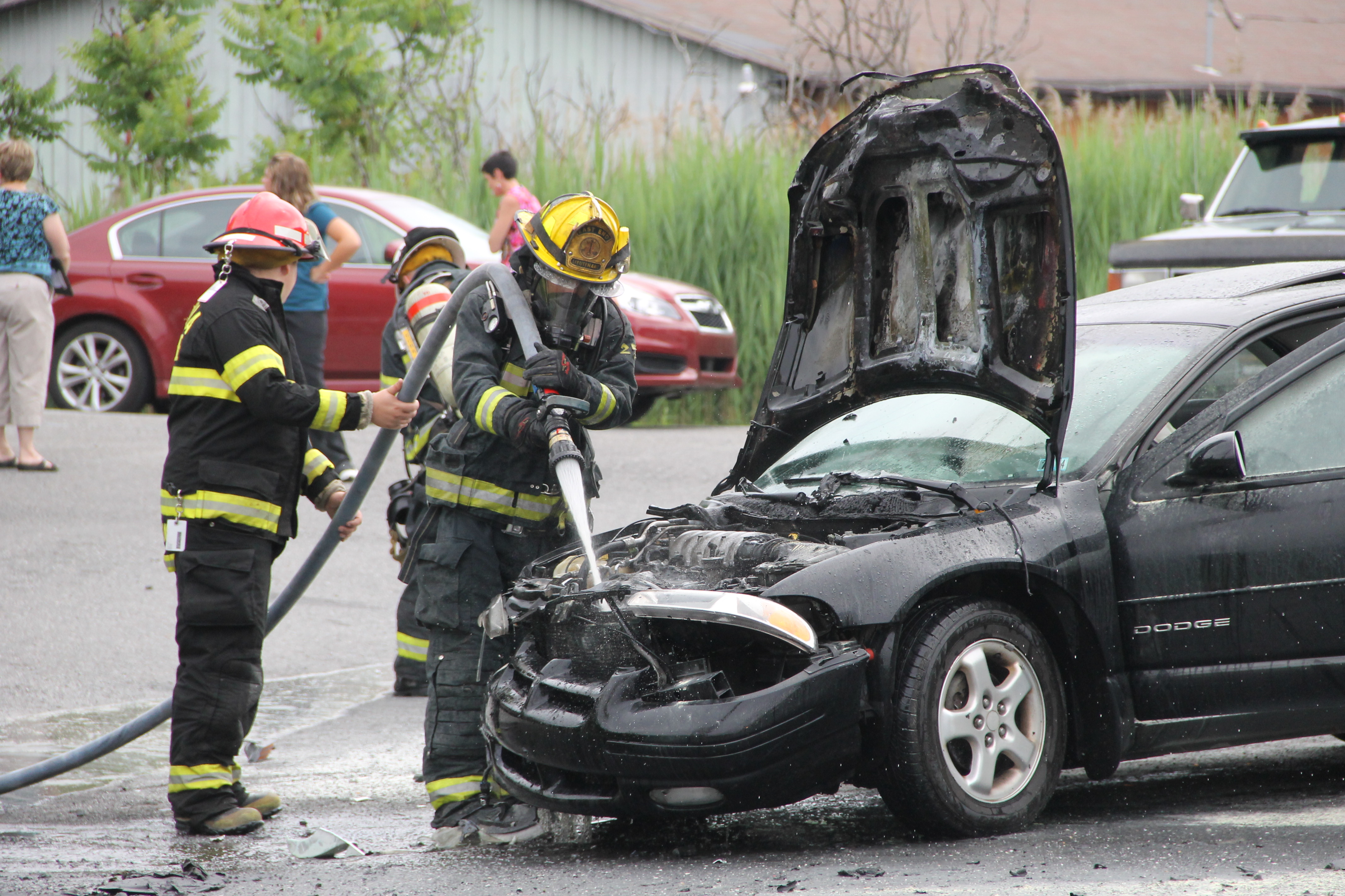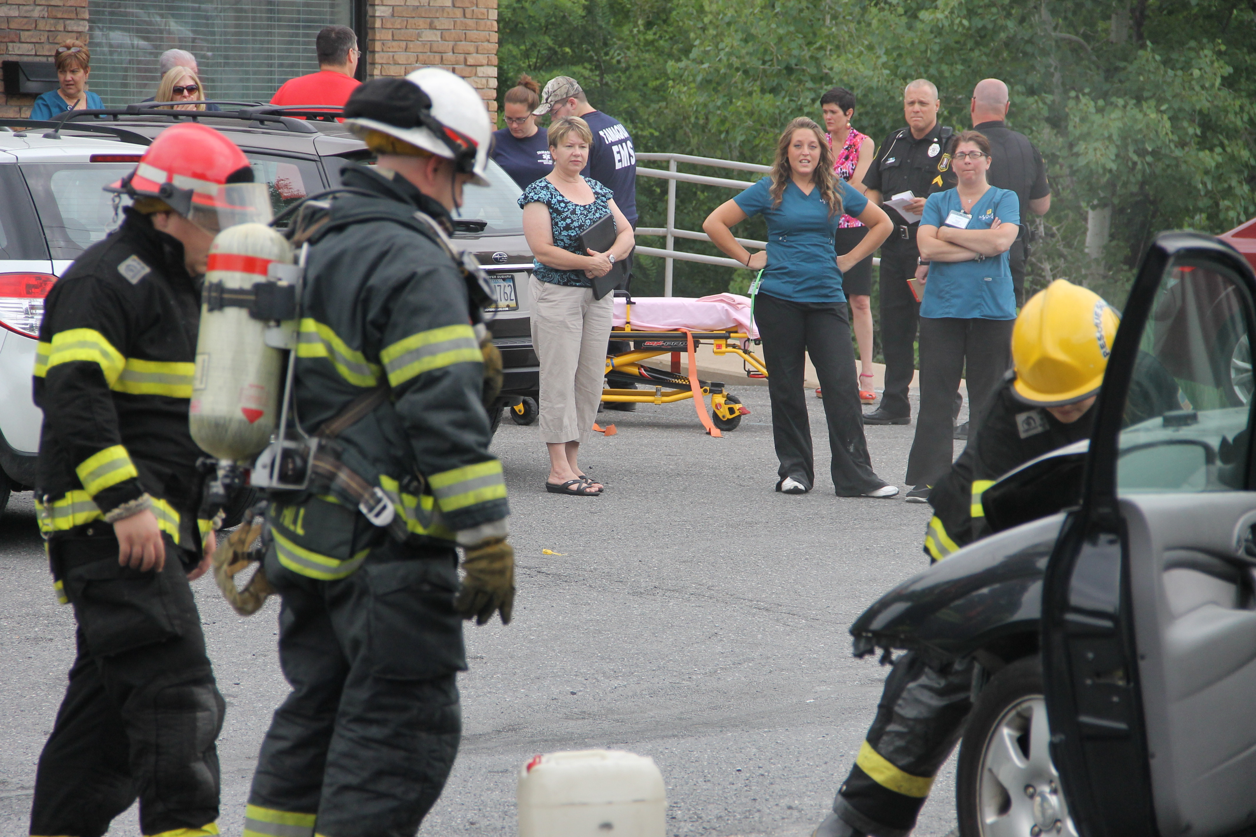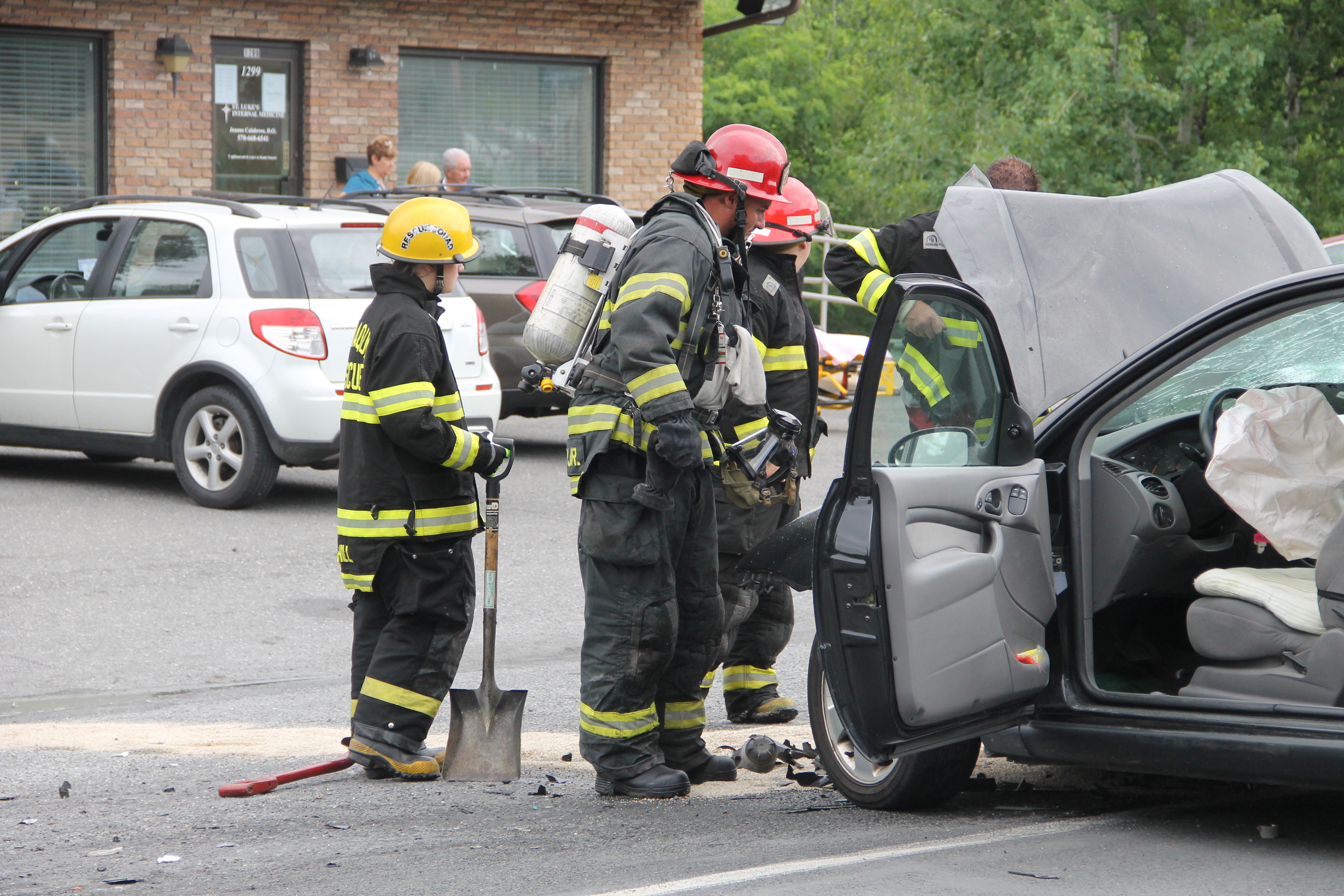 A passing motorist and employees from the St. Luke’s office provided assistance during the incident. Bettyann Kopp (office manager) called 911, while Kacie Haupf (medical assistant) and Ben Horvath (passing motorist) used an extinguisher to slow down the fire until firefighters could respond. Susan Costello (office worker) also helped by escorting an elderly woman out of one of the vehicles.