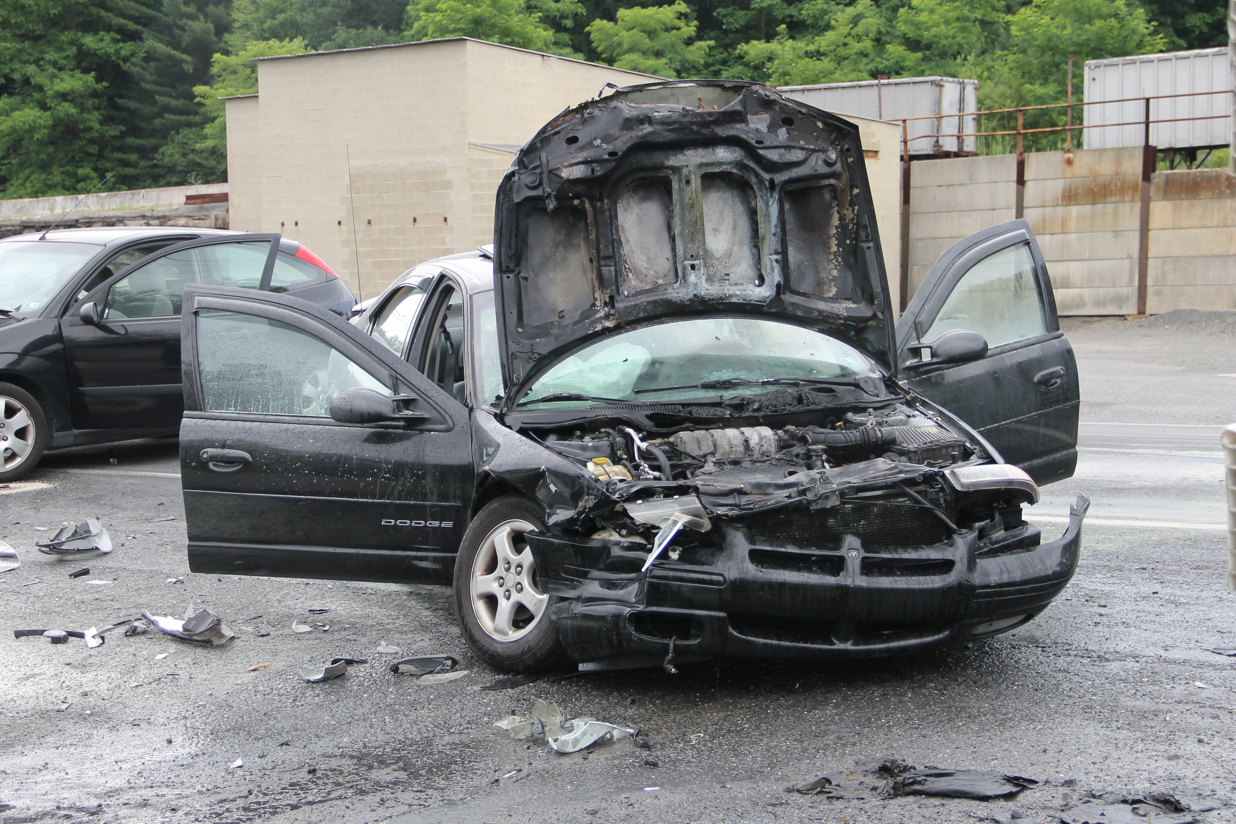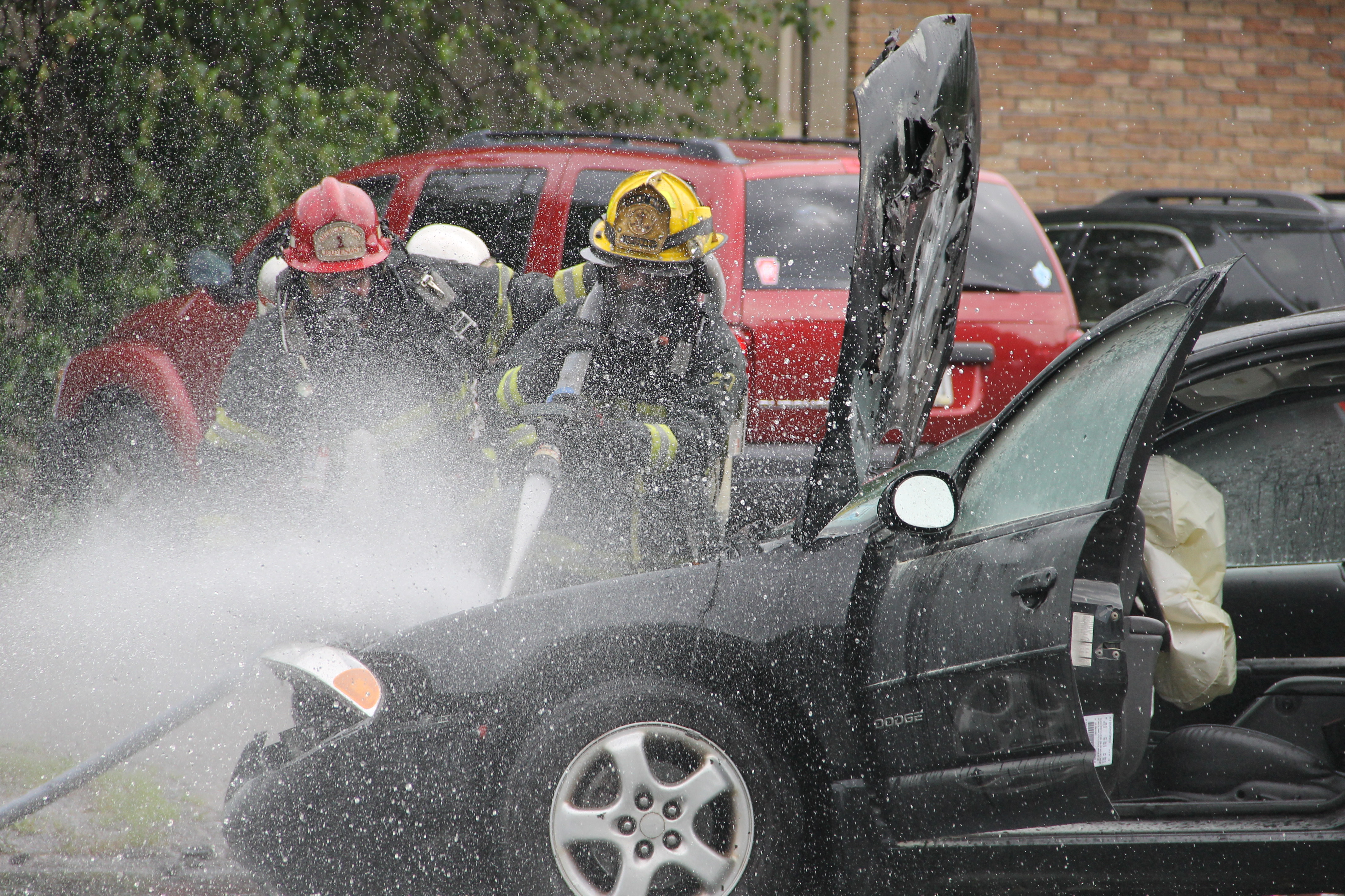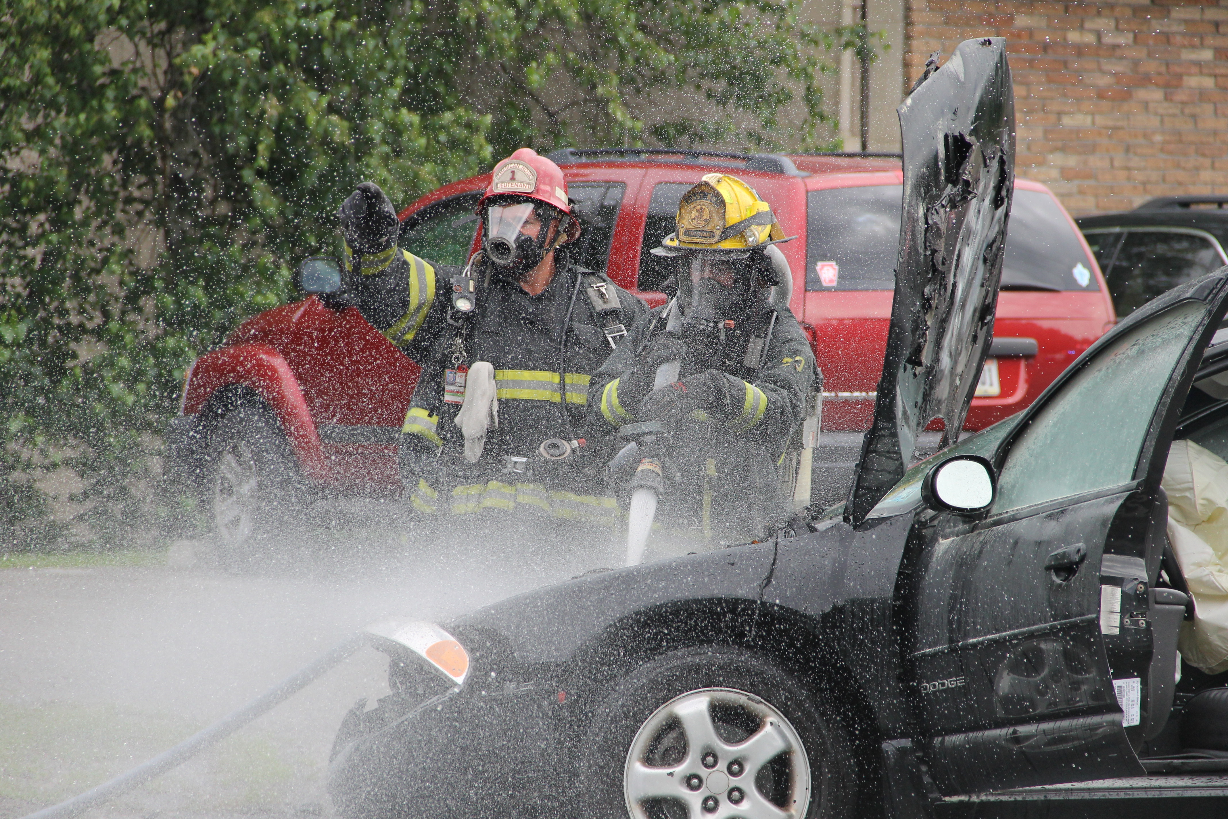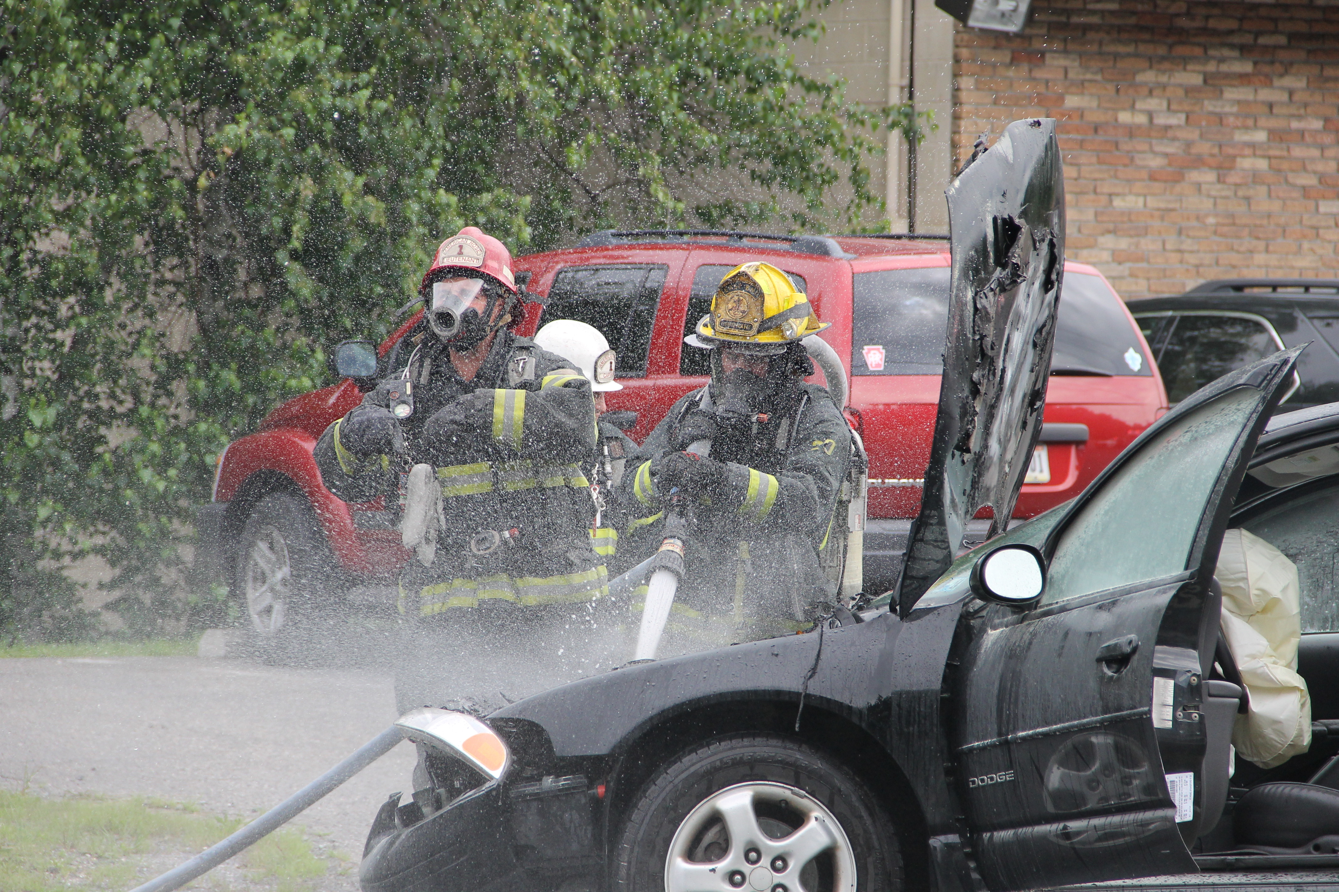 A passing motorist and employees from the St. Luke’s office provided assistance during the incident. Bettyann Kopp (office manager) called 911, while Kacie Haupf (medical assistant) and Ben Horvath (passing motorist) used an extinguisher to slow down the fire until firefighters could respond. Susan Costello (office worker) also helped by escorting an elderly woman out of one of the vehicles.
