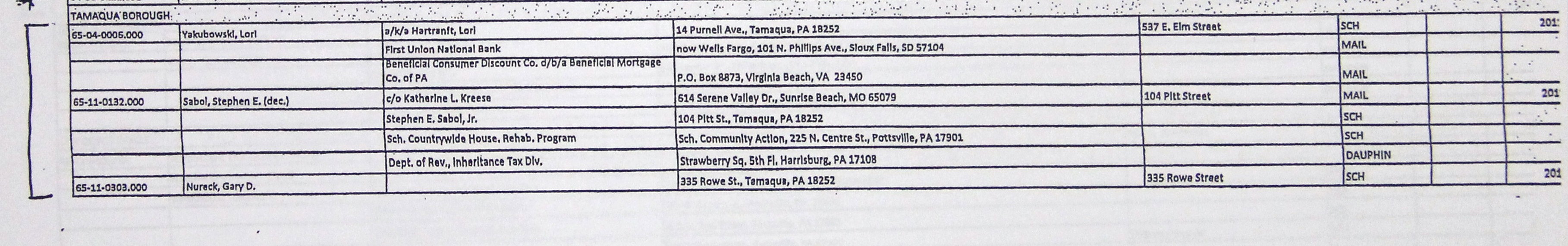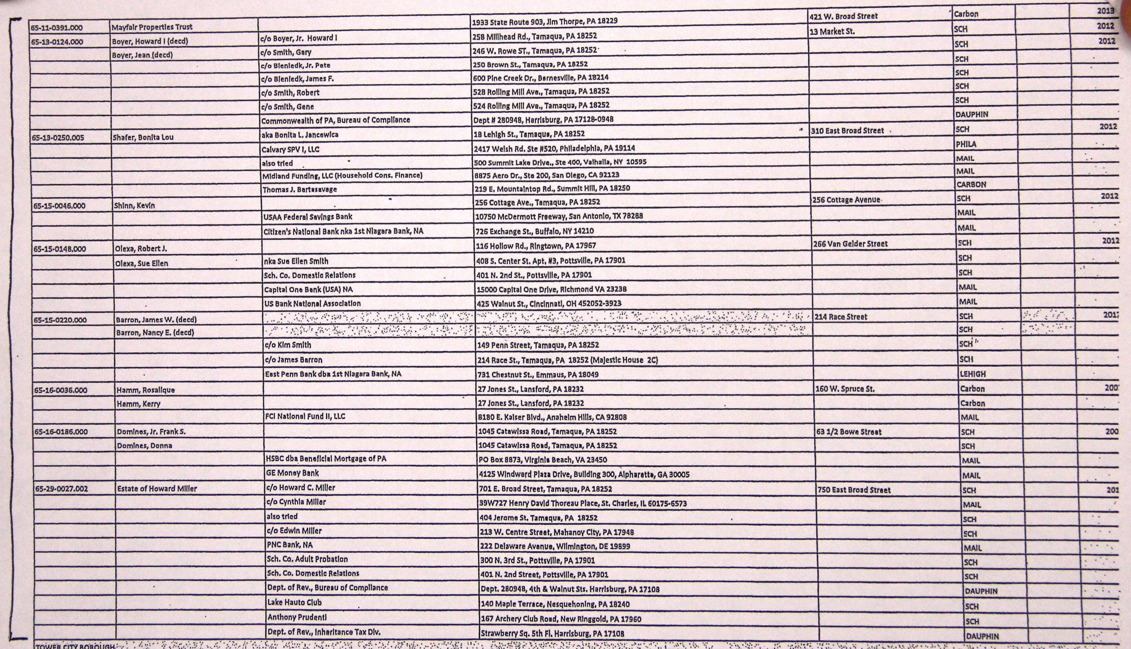 – Borough Council President Micah Gursky talked about the importance of local community members to purchase properties available via judicial and repository sales. Judicial sale properties in Tamaqua consist of 537 East Elm Street, 104 Pitt Street, 335 Rowe Street, 421 West Broad Street, 13 Market Street, 310 East Broad Street, 256 Cottage Avenue, 266 Van Gelder Avenue, 214 Race Street, 160 West Spruce Street, 63 1/2 Bowe Street, and 750 East Broad Street.