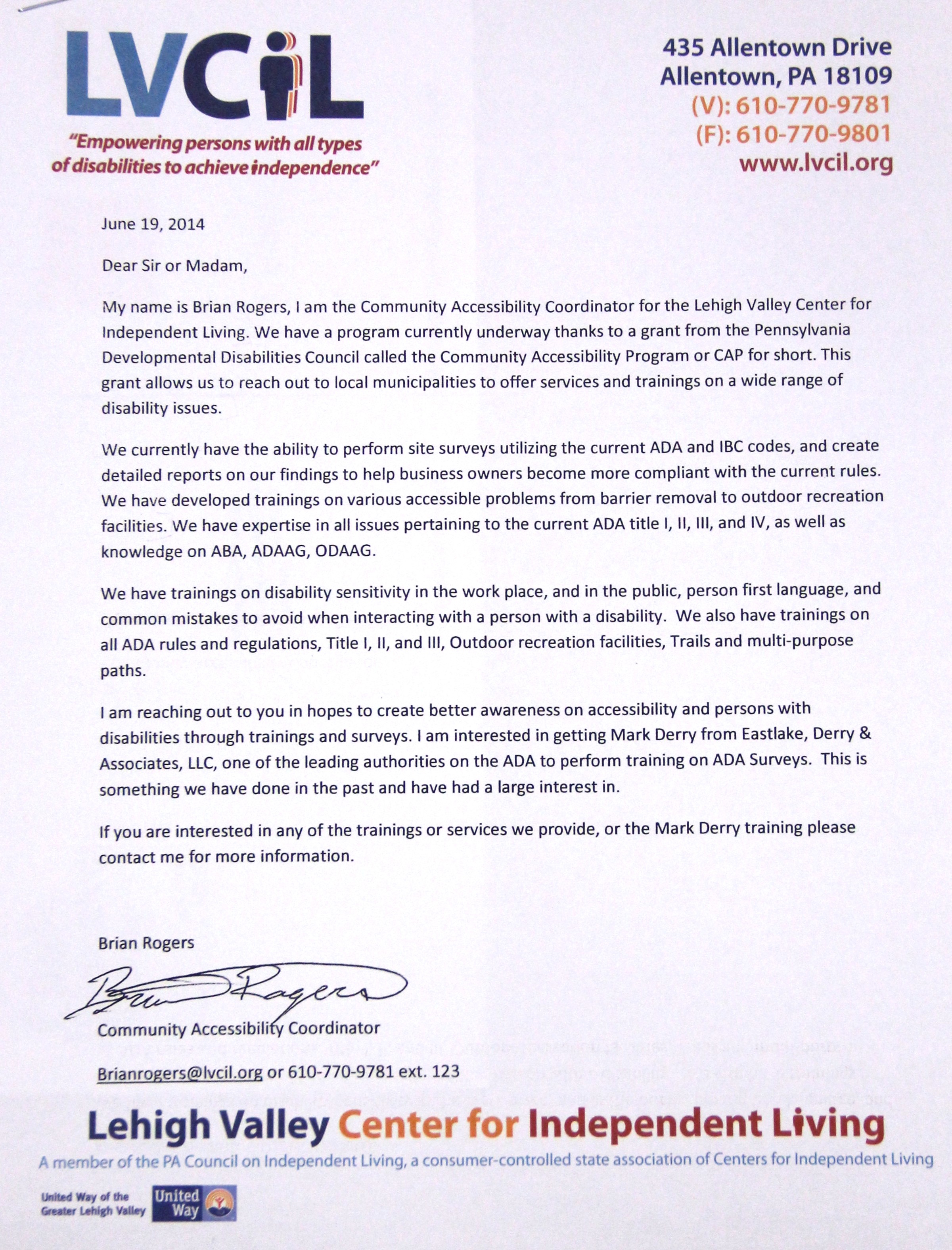 – DeWire read correspondence from Lehigh Valley Center for Independent Living (LVCIL). (see below).
