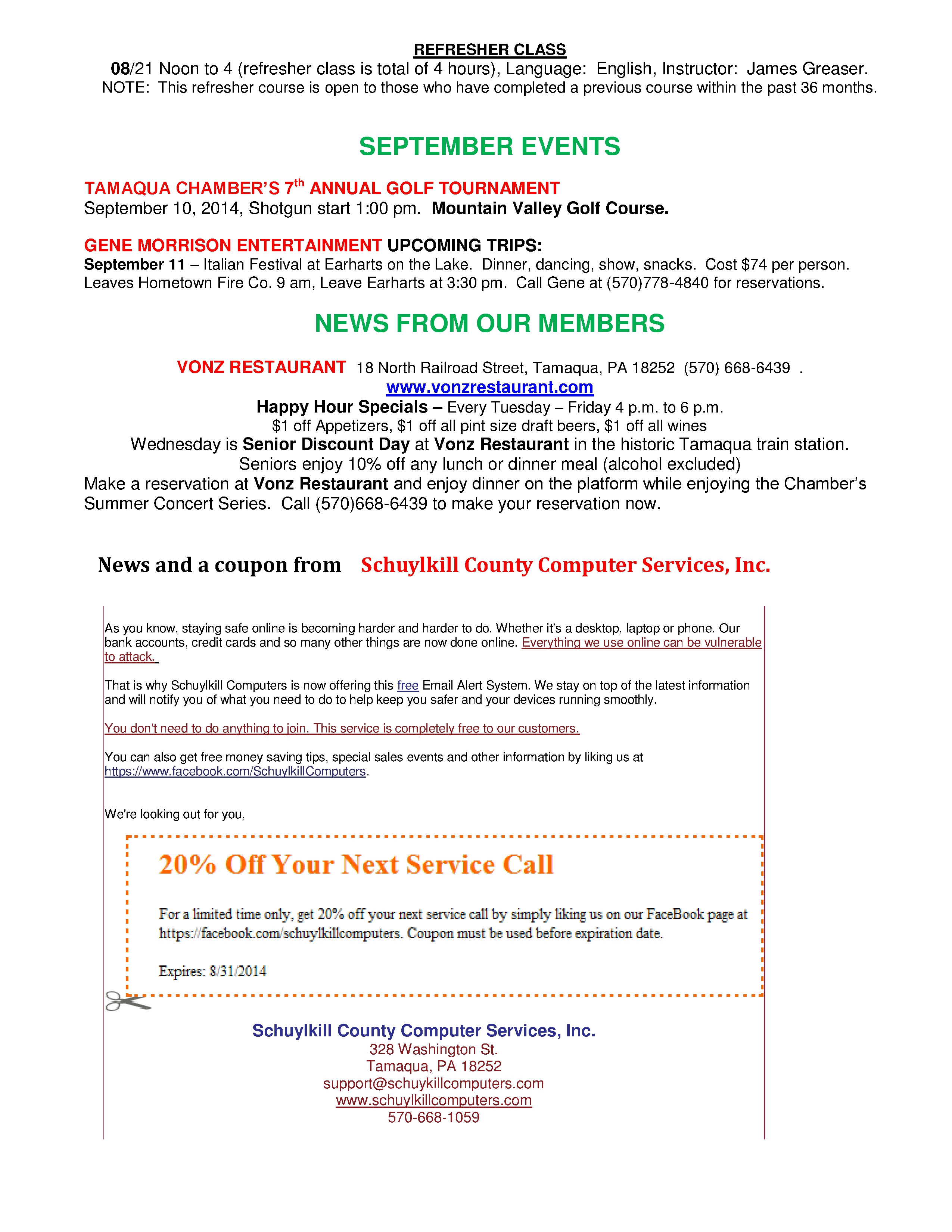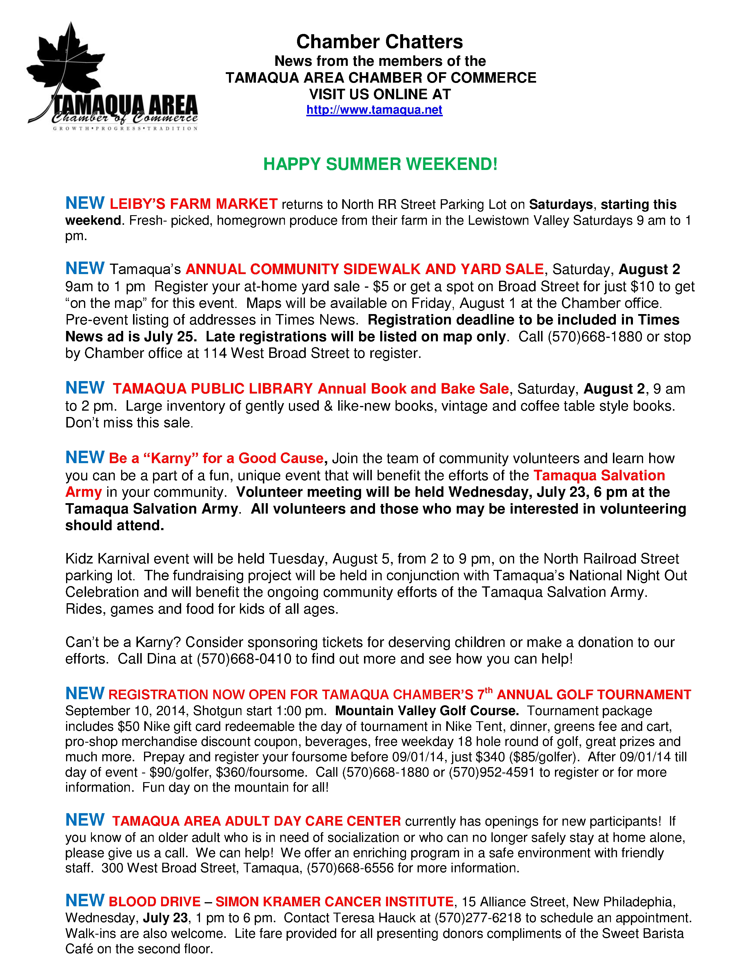 Here is the Tamaqua Area Chamber of Commerce’s Chamber Chatters newsletter dated today (Friday, July 18, 2014). For more information about the Chamber or to volunteer, stop by their office during the week at 114 West Broad Street, call (570) 668-1880 or visit them online at www.tamaqua.net.