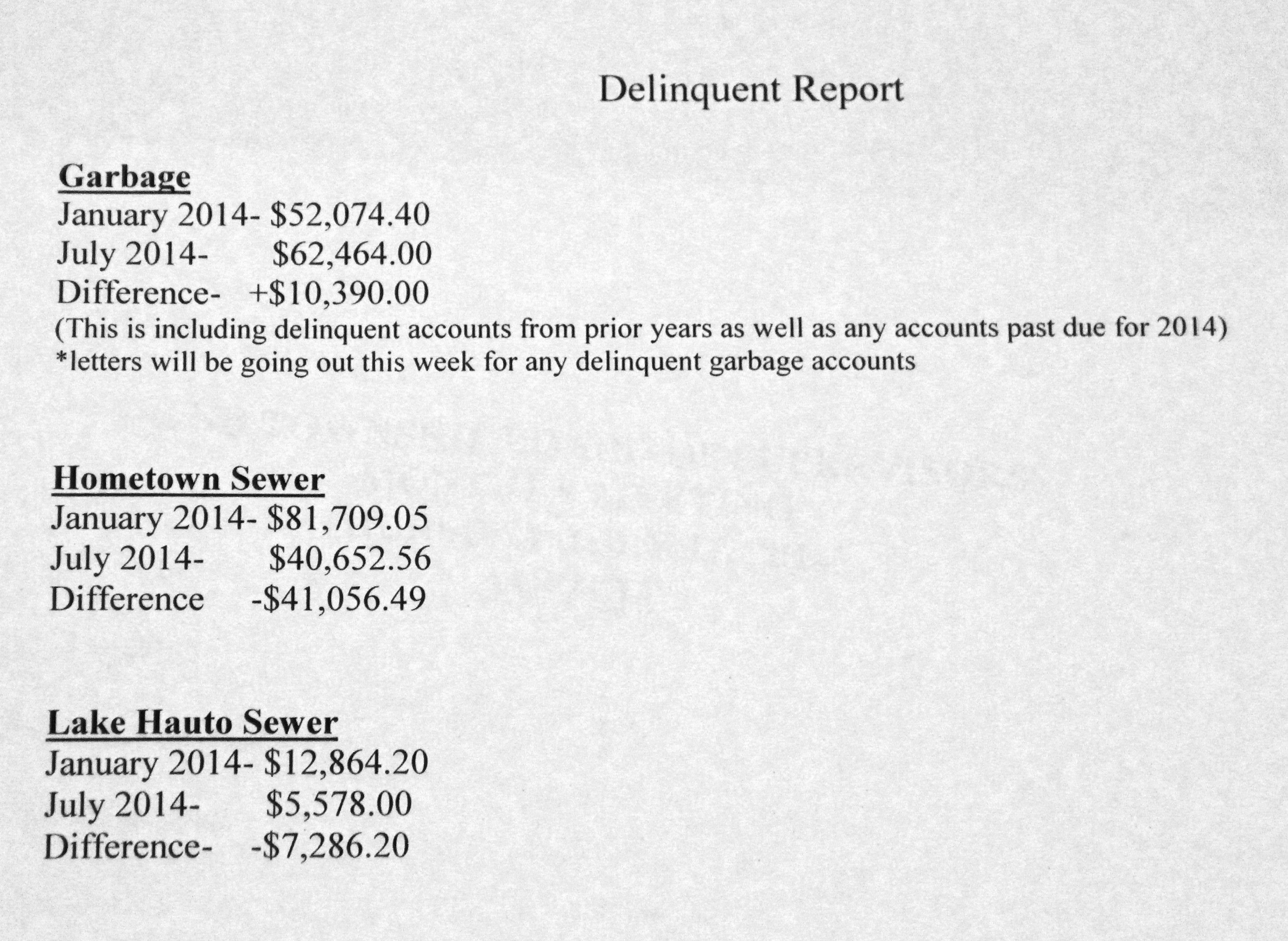 – Supervisors talked about the amount of delinquent sewer and garbage accounts. Total garbage delinquencies as of July 2014 were $62,464 (compared to $52,074.40 in January 2014). (This number is including delinquent accounts from prior years, as well as any accounts past due for 2014). Total sewer delinquency accounts for Hometown residents as of July 2014 was $40,652.56 (compared to $81,709.05 in January 2014). Total sewer delinquencies for Lake Hauto residents as of July 2014 was $5,578.00 (compared to $12,864.20 in January 2014). Supervisors said delinquency letters will be going out again this week. (see sheet below).
